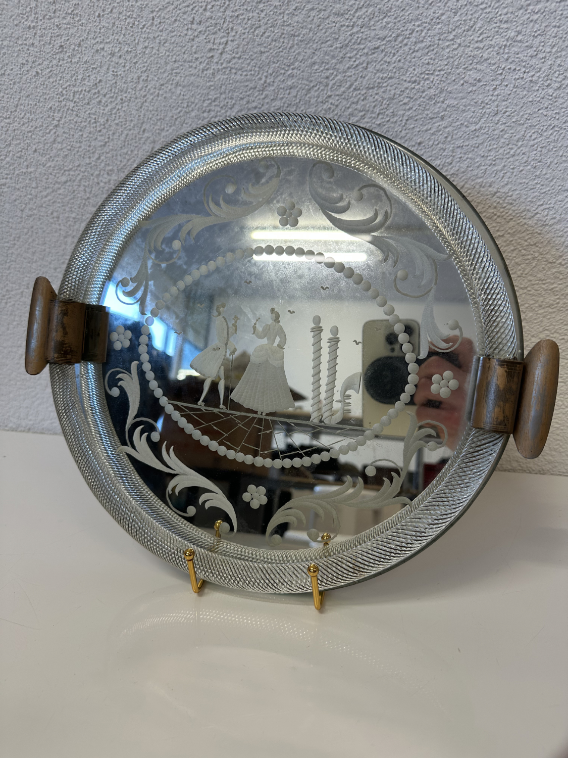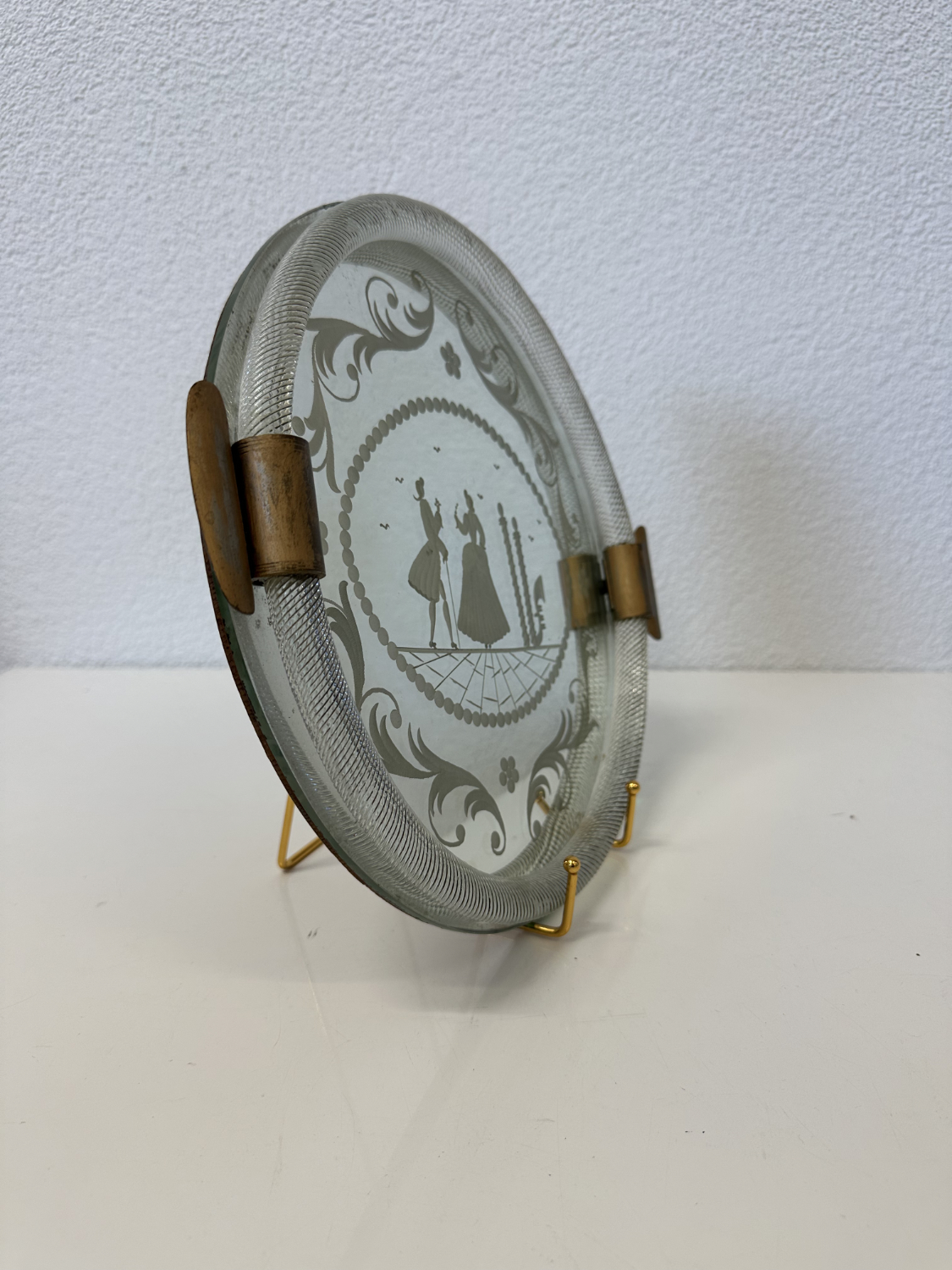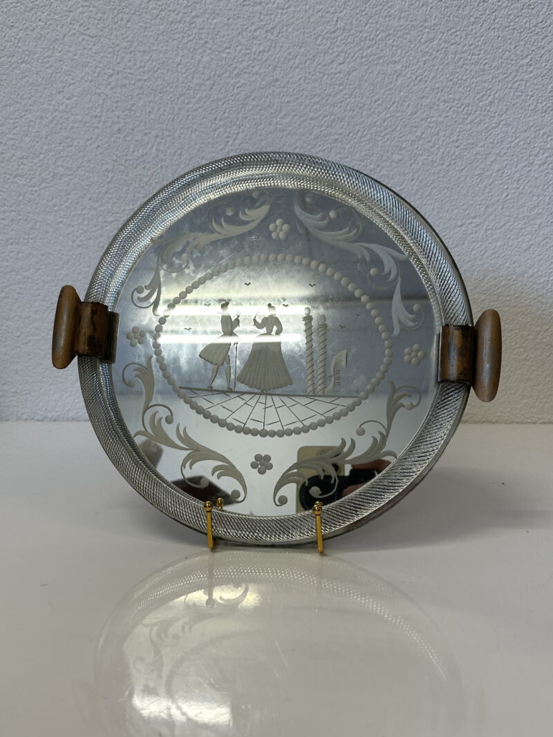 Schweres Spiegelglas mit fein geätztem Dekor und einer figürlichen Szene im Zentrum. Zwei elegant gekleidete Personen stehen sich gegenüber, eingerahmt von Perlenbordüre, floralen Schwüngen und klaren Linien. Der breite, strukturierte Glasrand fasst das Spiegelglas sauber ein. Seitlich sitzen zwei Metallgriffe mit schöner Patina, die Rückseite ist stabil gearbeitet.
