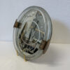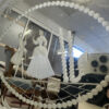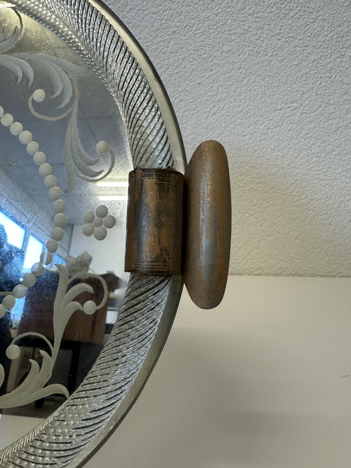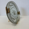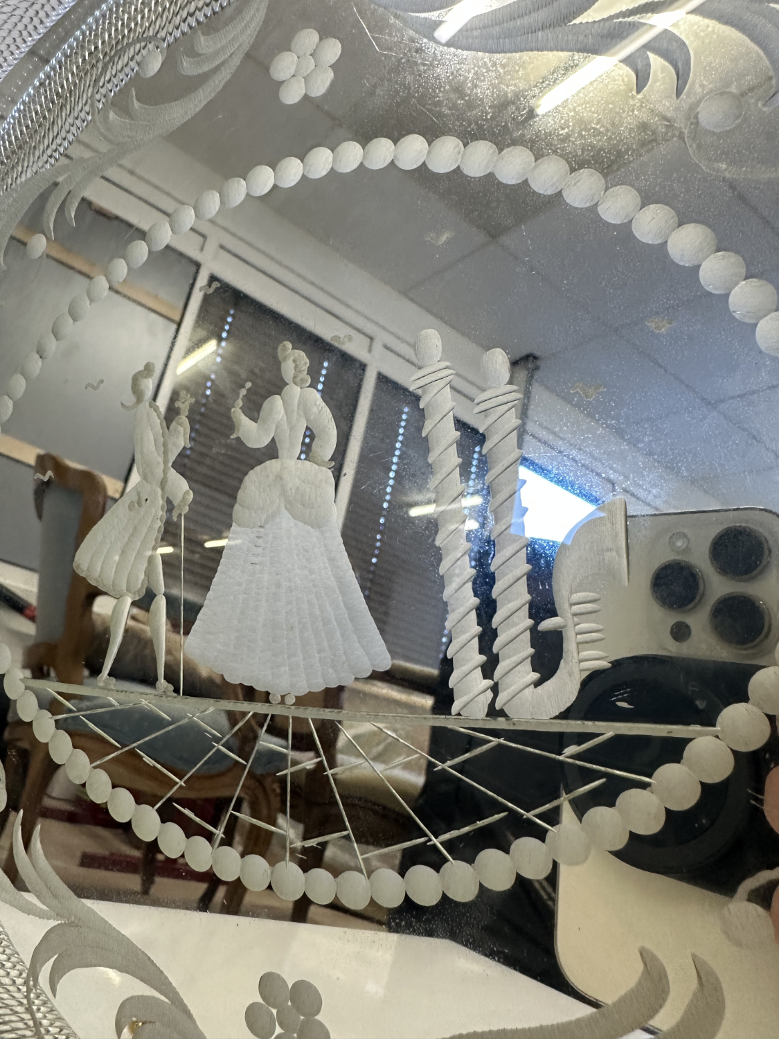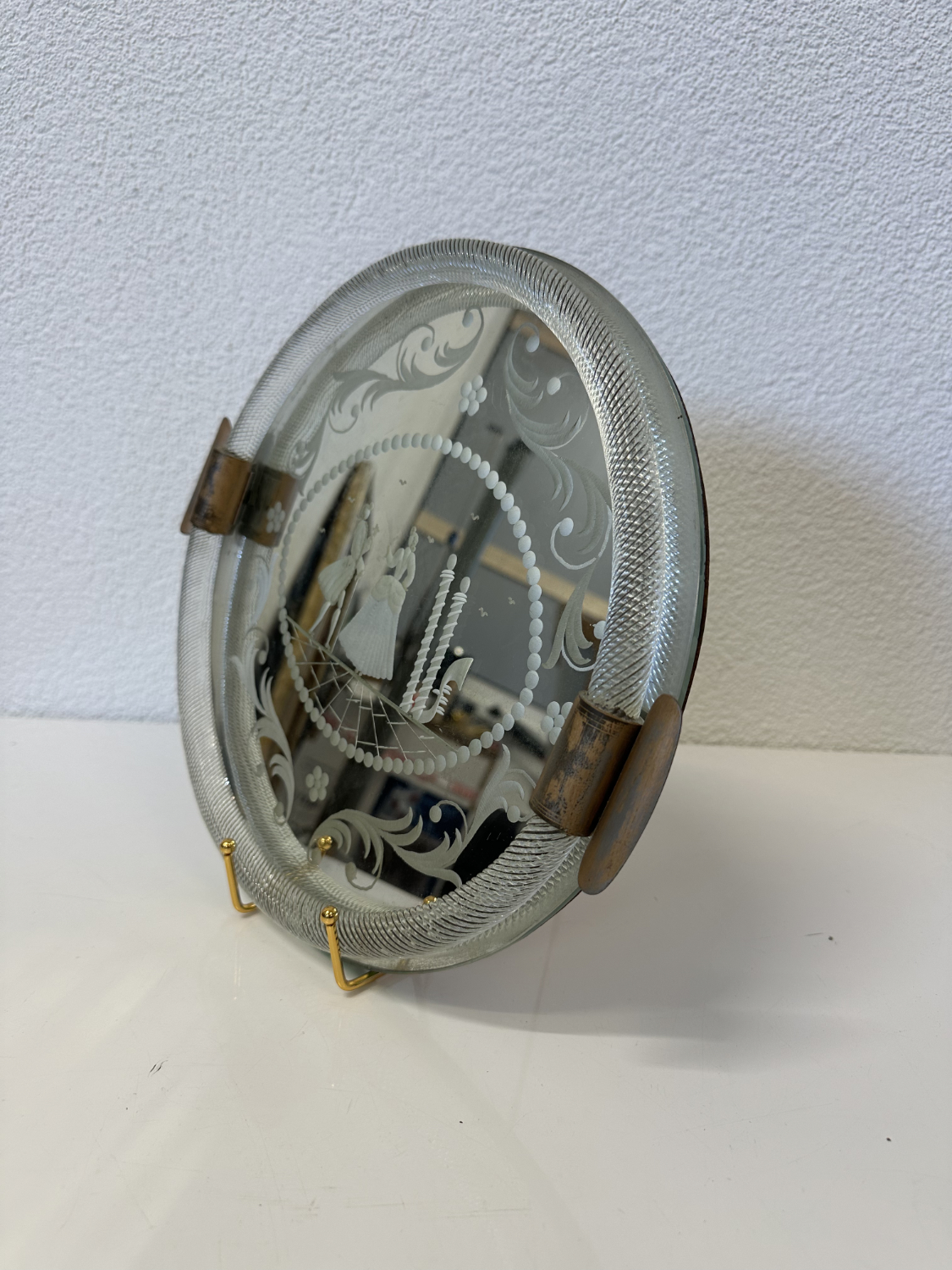 Schweres Spiegelglas mit fein geätztem Dekor und einer figürlichen Szene im Zentrum. Zwei elegant gekleidete Personen stehen sich gegenüber, eingerahmt von Perlenbordüre, floralen Schwüngen und klaren Linien. Der breite, strukturierte Glasrand fasst das Spiegelglas sauber ein. Seitlich sitzen zwei Metallgriffe mit schöner Patina, die Rückseite ist stabil gearbeitet.