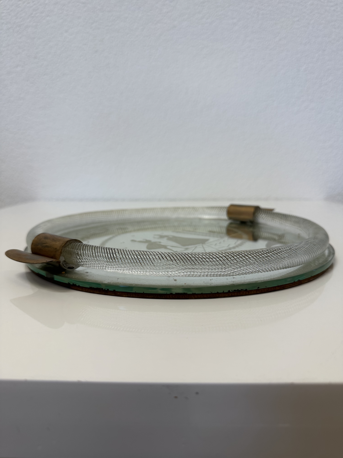 Die Gestaltung wirkt Murano inspiriert, vor allem durch die Glaswirkung und den eleganten Gesamtauftritt. Eine Herkunft aus Murano ist jedoch nicht belegt, fachlich stimmig ist die Einordnung als mitteleuropäisches Art-Déco Tablett aus der Zeit zwischen 1925 und 1935.