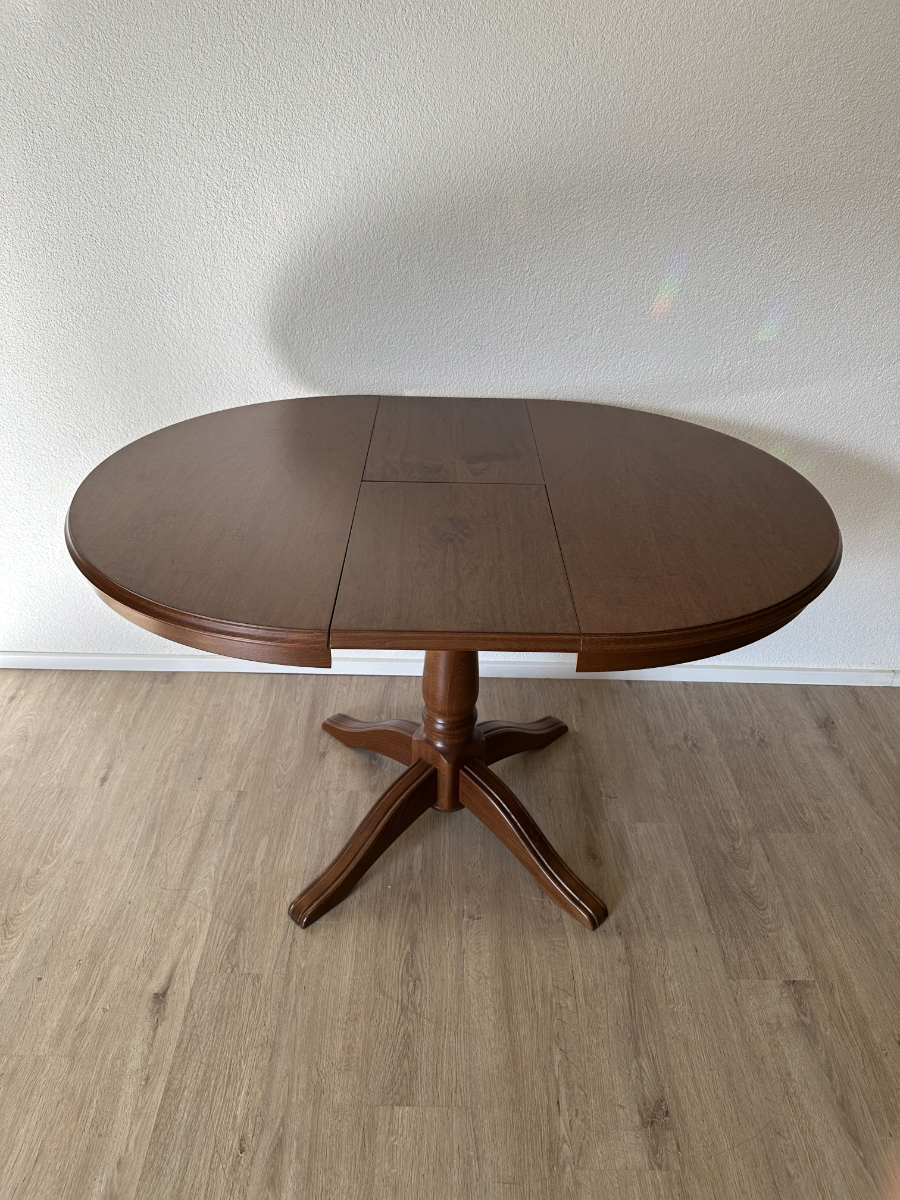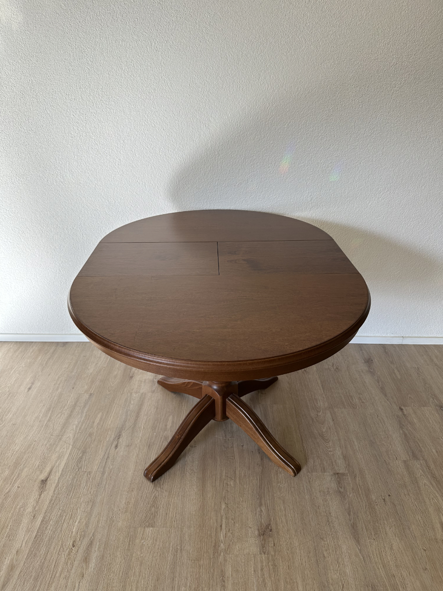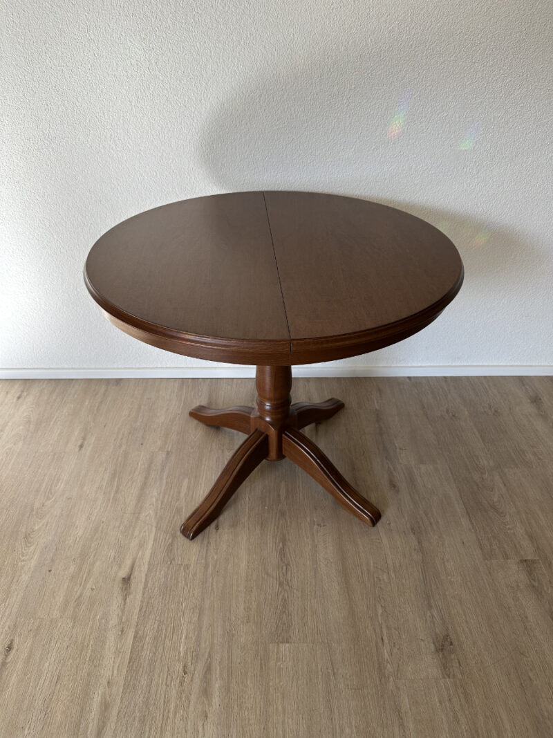 Runde Form, warme Holzfarbe und ein stabiler Mittelfuss mit vier geschwungenen Standbeinen: dieser Tisch passt perfekt in Küche oder Esszimmer und wirkt dabei zeitlos und hochwertig. Besonders praktisch ist die Ausziehfunktion. Mit wenigen Handgriffen wird aus dem runden Tisch eine grössere Tischfläche, ideal wenn Besuch kommt oder man einfach mehr Platz braucht.