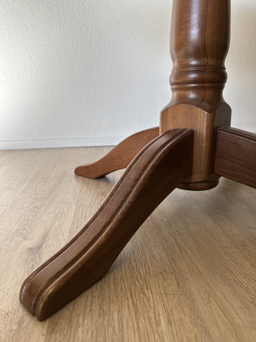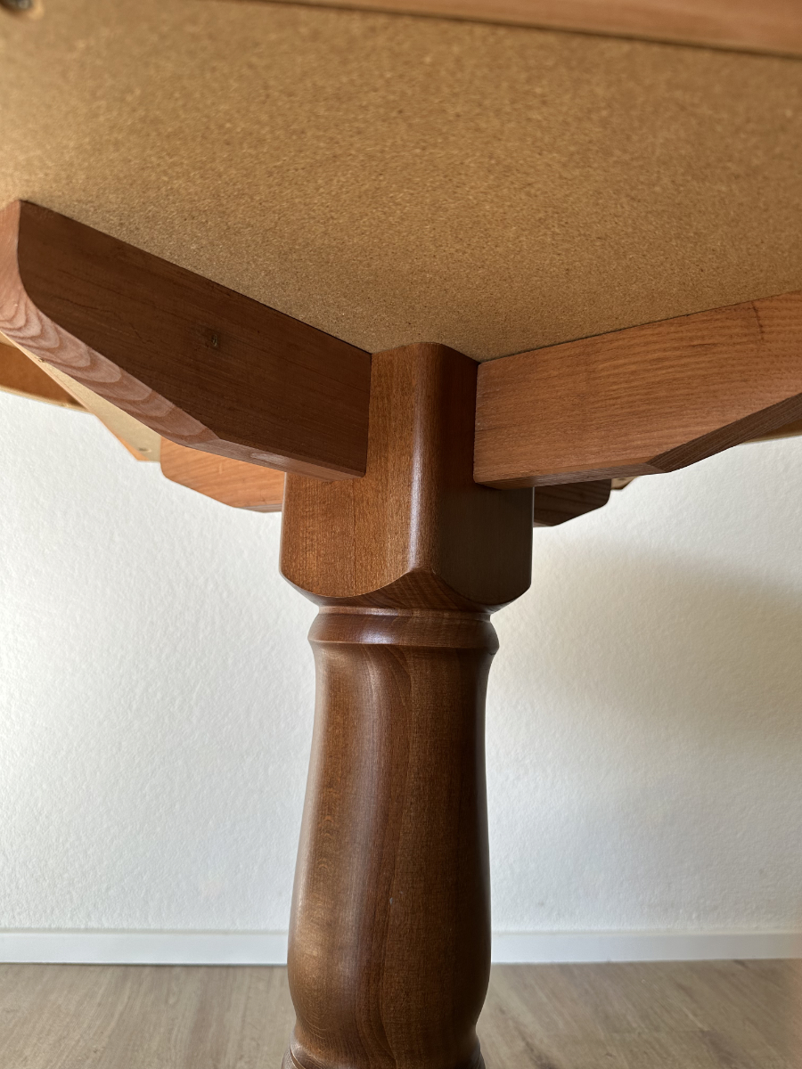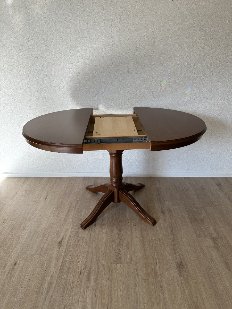 Runde Form, warme Holzfarbe und ein stabiler Mittelfuss mit vier geschwungenen Standbeinen: dieser Tisch passt perfekt in Küche oder Esszimmer und wirkt dabei zeitlos und hochwertig. Besonders praktisch ist die Ausziehfunktion. Mit wenigen Handgriffen wird aus dem runden Tisch eine grössere Tischfläche, ideal wenn Besuch kommt oder man einfach mehr Platz braucht.