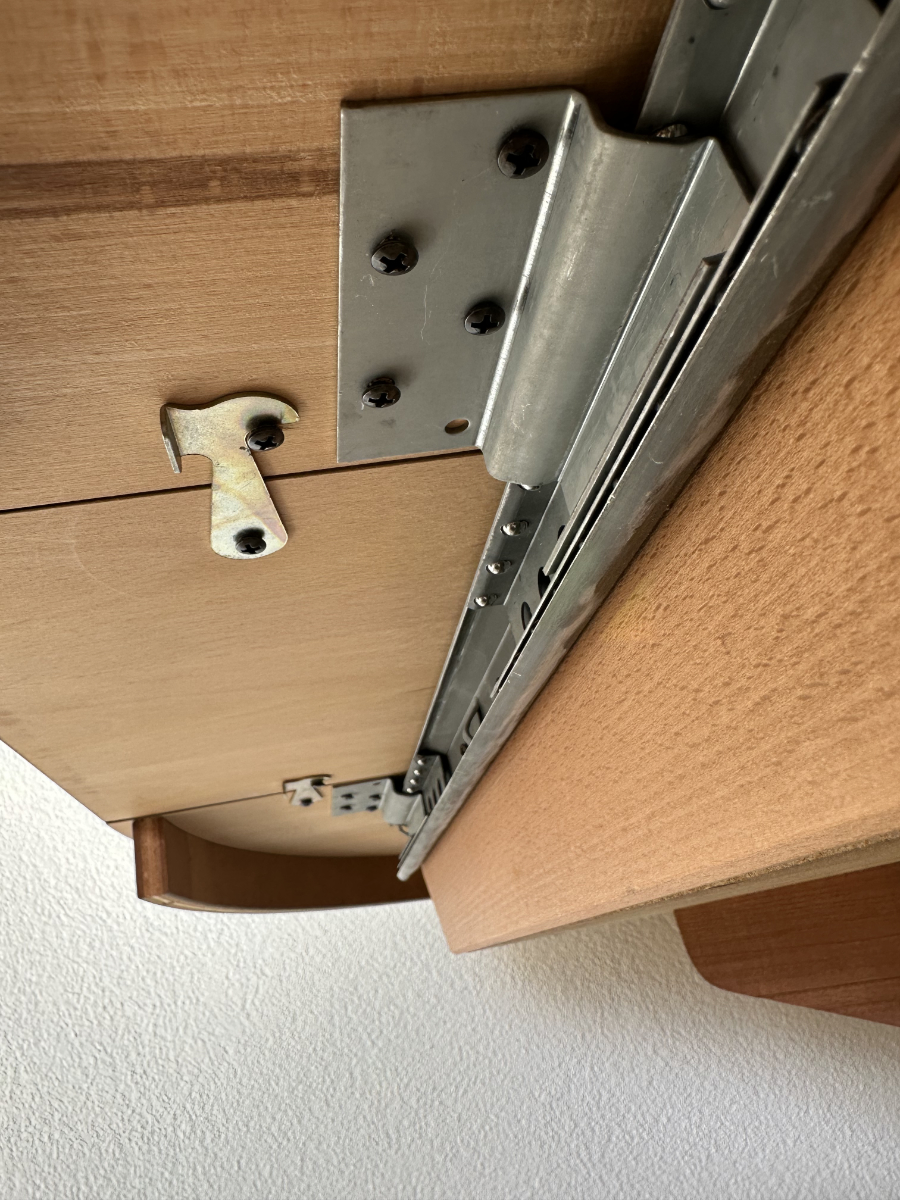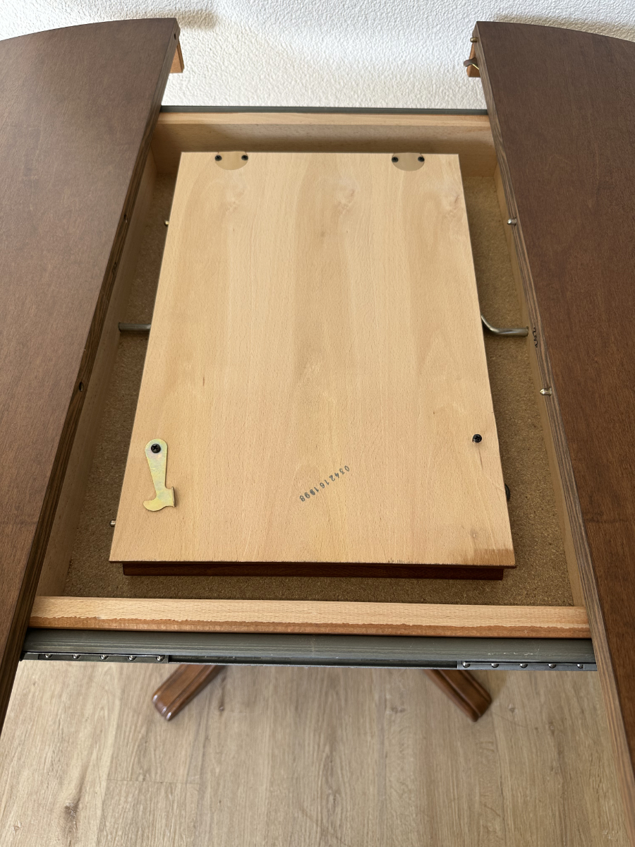 Die Auszugmechanik läuft über Metallschienen, die Einlegeplatte ist im Tisch integriert und lässt sich sauber einfügen. Dadurch bleibt alles kompakt verstaut und jederzeit einsatzbereit.