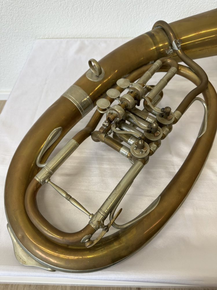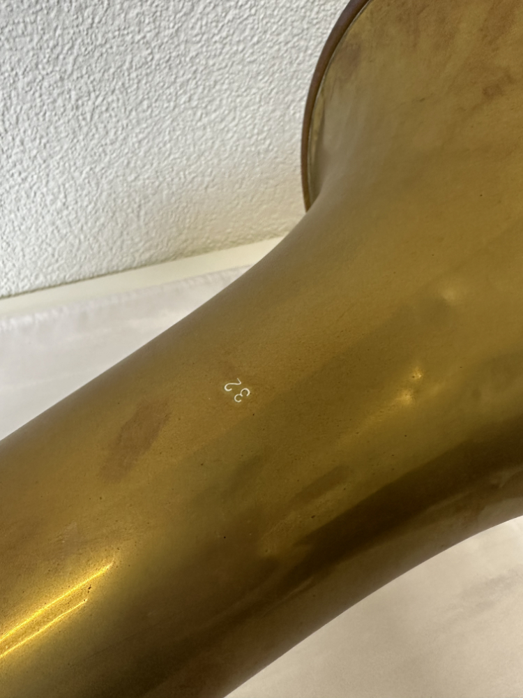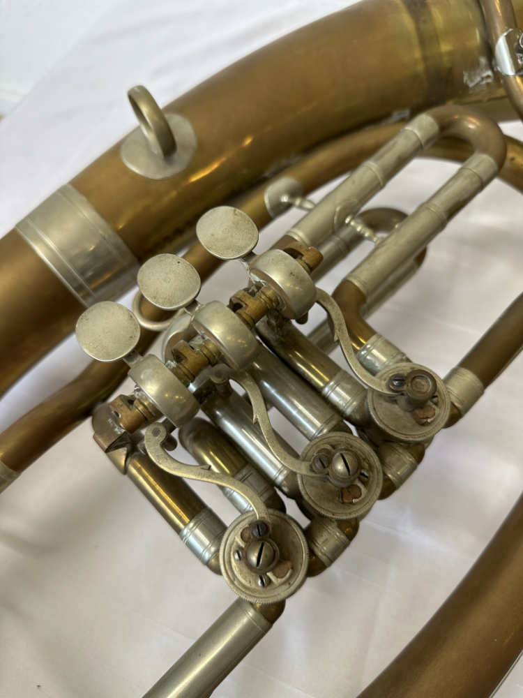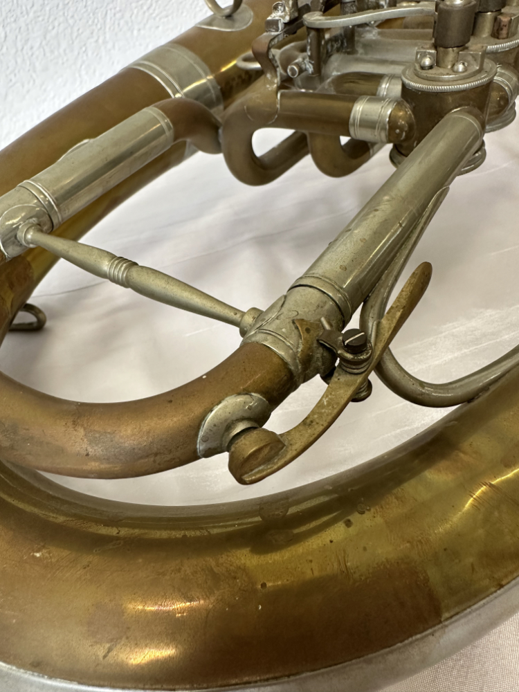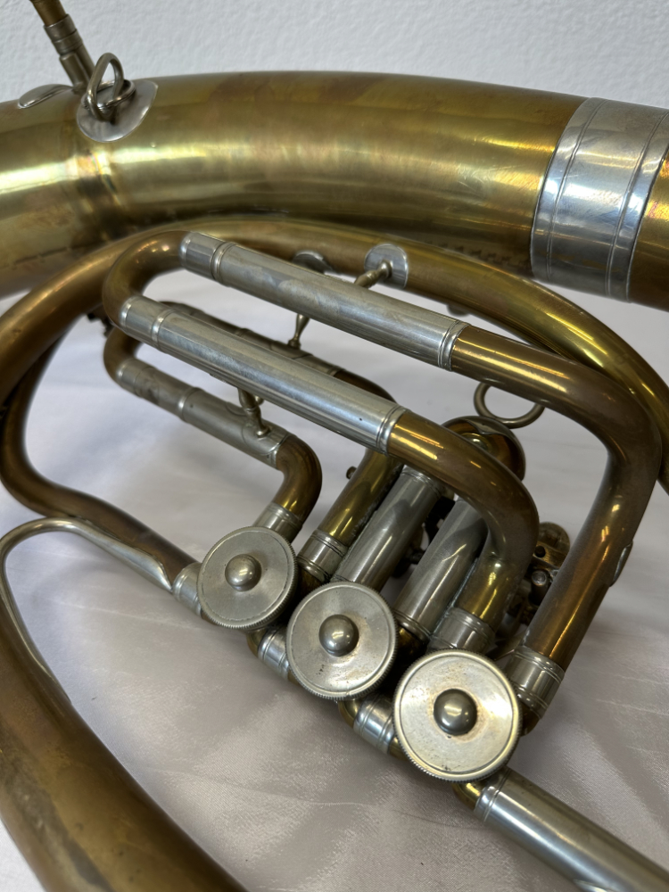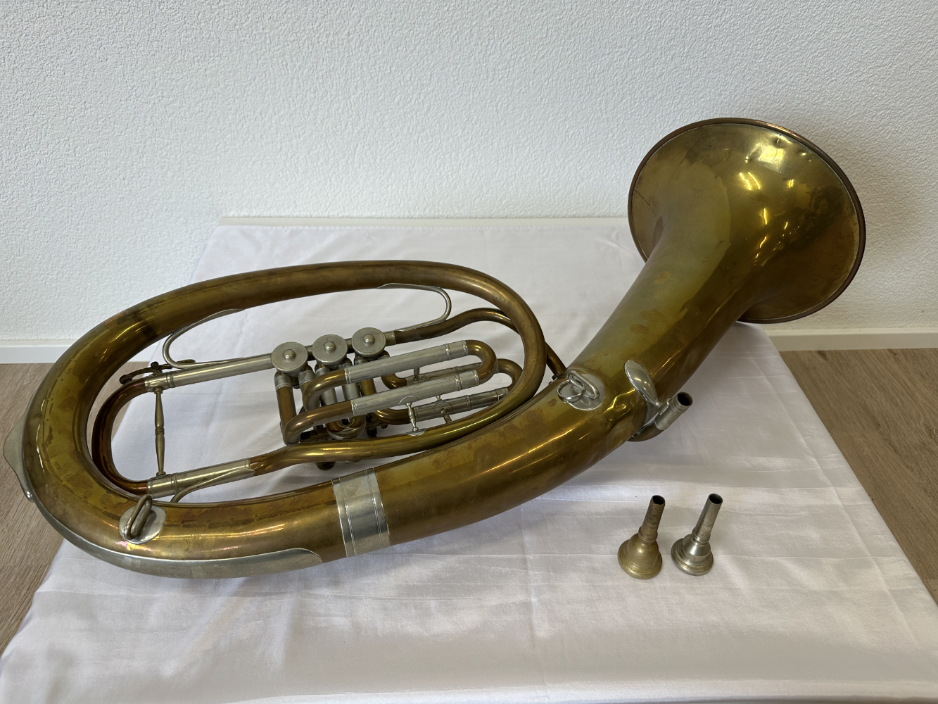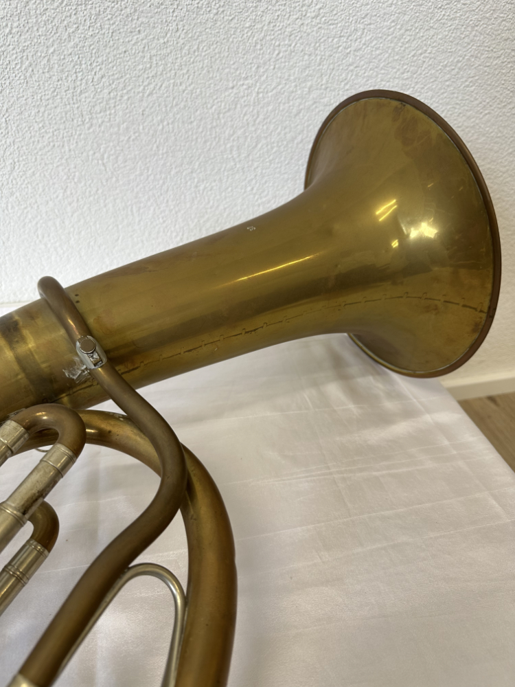 Schweres Messing, grosszügig gewundene Rohre und eine weit ausladende Schallbecherform prägen dieses klassische Blechblasinstrument. Die Oberfläche zeigt eine gewachsene Patina mit altersbedingten Spuren, wie sie bei älteren Blasinstrumenten typisch sind. Drei Drehventile mit Metallkappen, massive Lötstellen und die robuste Bauweise deuten auf eine Fertigung aus dem mittleren 20. Jahrhundert hin. Zwei Mundstücke sind separat vorhanden. Ob als Sammlerstück, Dekorationsobjekt oder für handwerklich versierte Musikerinnen und Musiker – dieses Instrument trägt sichtbar Geschichte in sich.