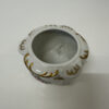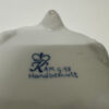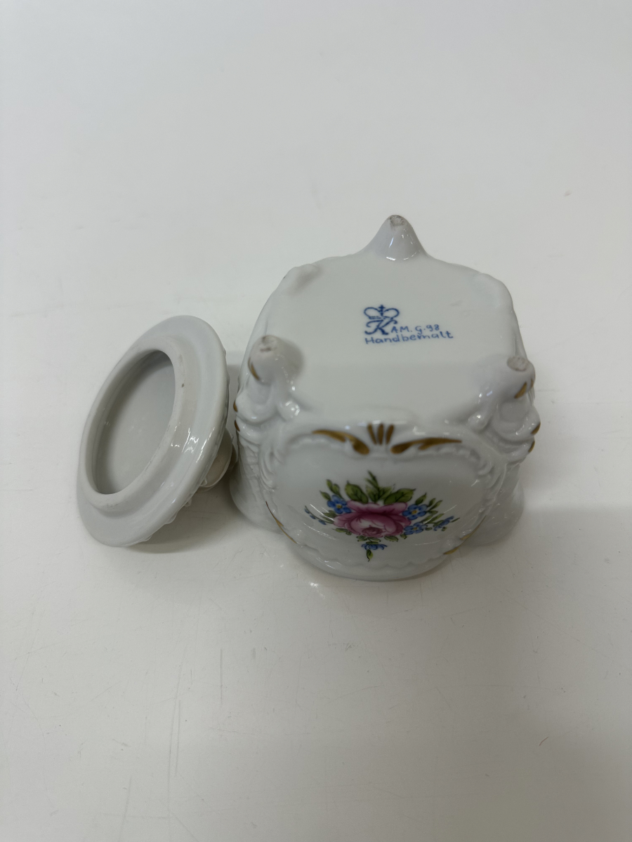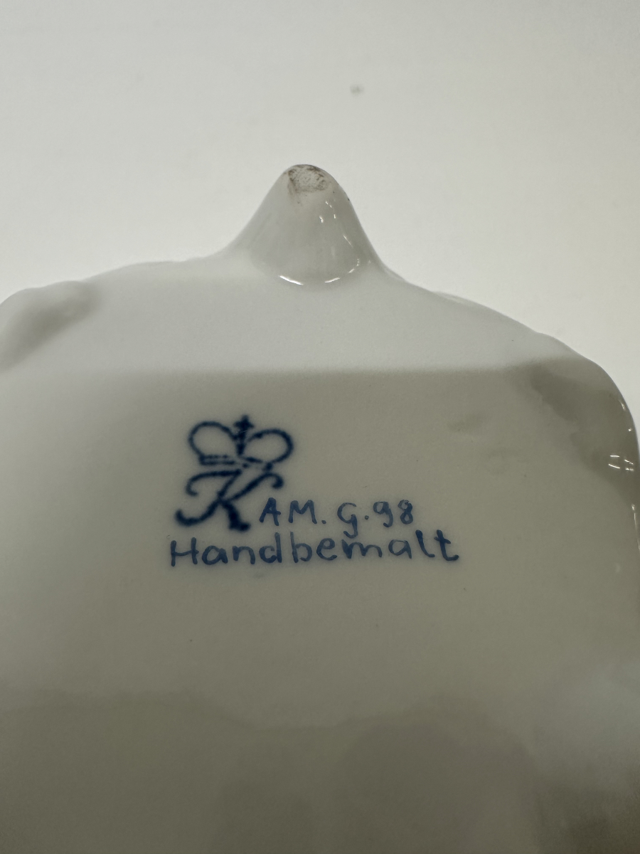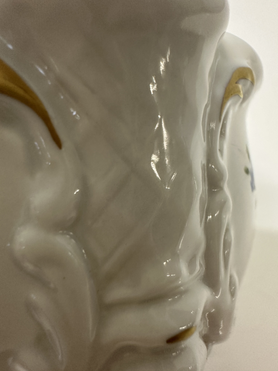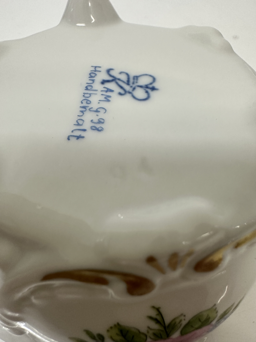 Fein gearbeitetes Porzellan mit klassischer Ausstrahlung. Diese dekorative Deckeldose stammt aus der Manufaktur Rudolf Kämmer und zeigt die für das Haus typische Kombination aus plastischer Formgebung, handgemalter Blumendekoration und dezenten Goldakzenten. Das weisse Porzellan ist reich reliefiert, der Deckel wird von einer plastischen Rose gekrönt. Auf der Wandung findet sich ein zartes Rosenbouquet in Rosa und Blau, sorgfältig von Hand aufgetragen. Die Bodenmarke mit Krone und der Aufschrift „R K M G 98 Handbemalt“ weist auf eine handbemalte Ausführung aus den späten 1990er Jahren hin.