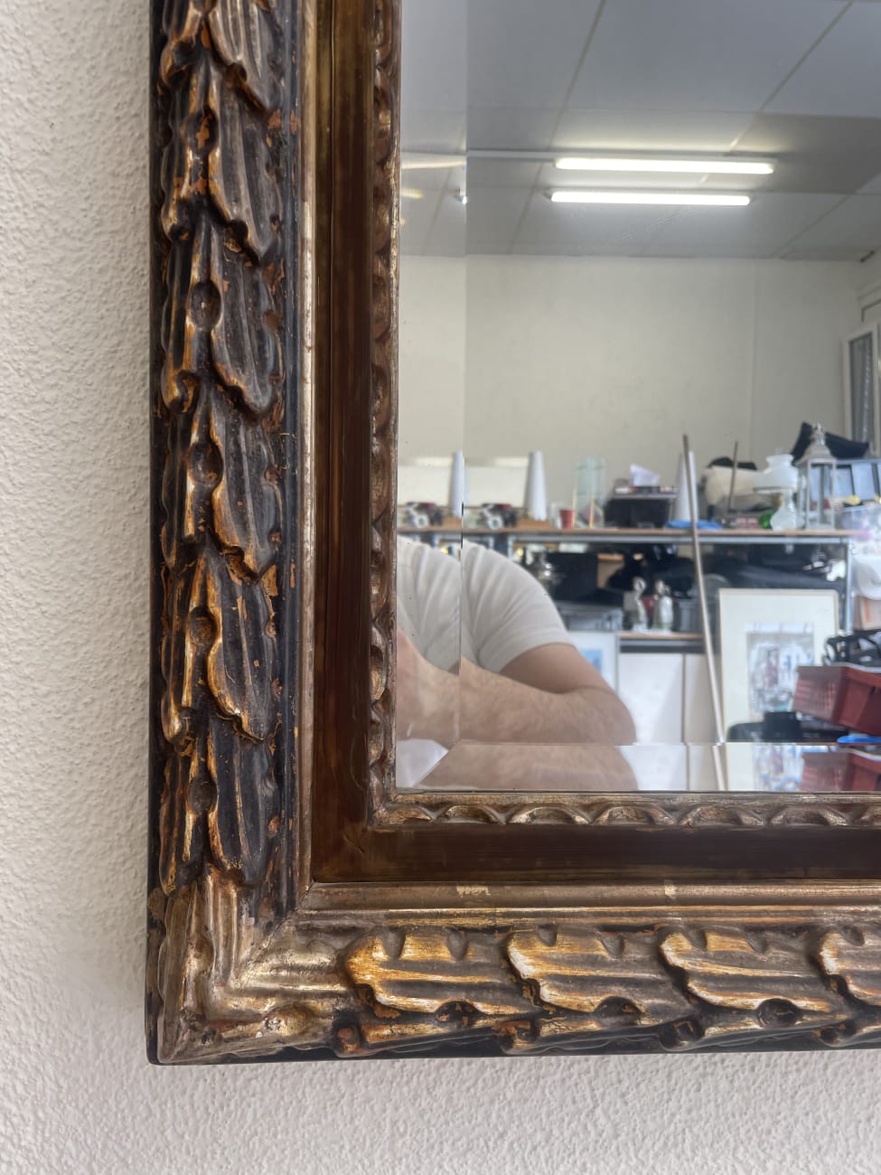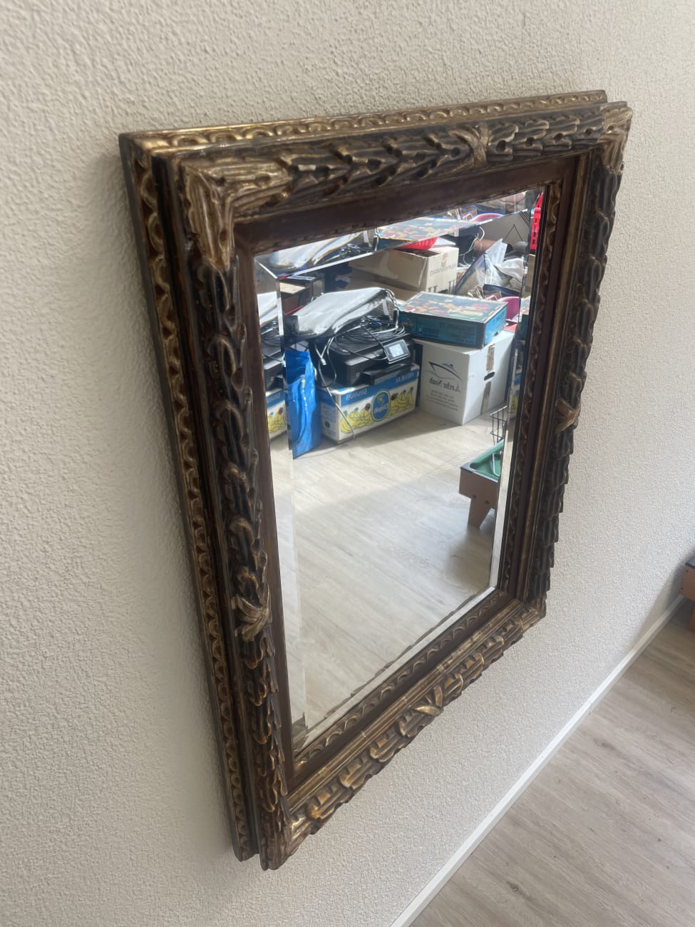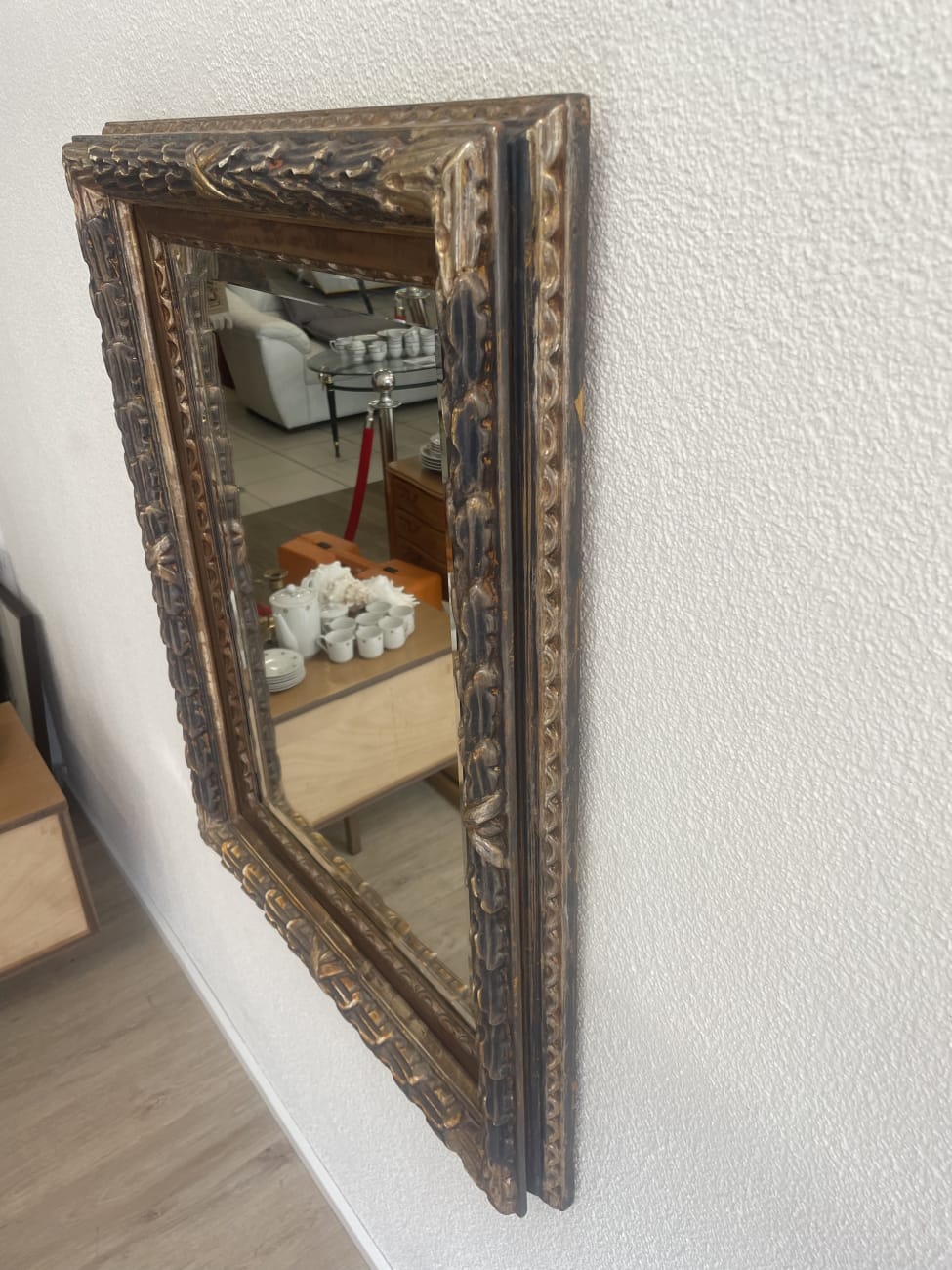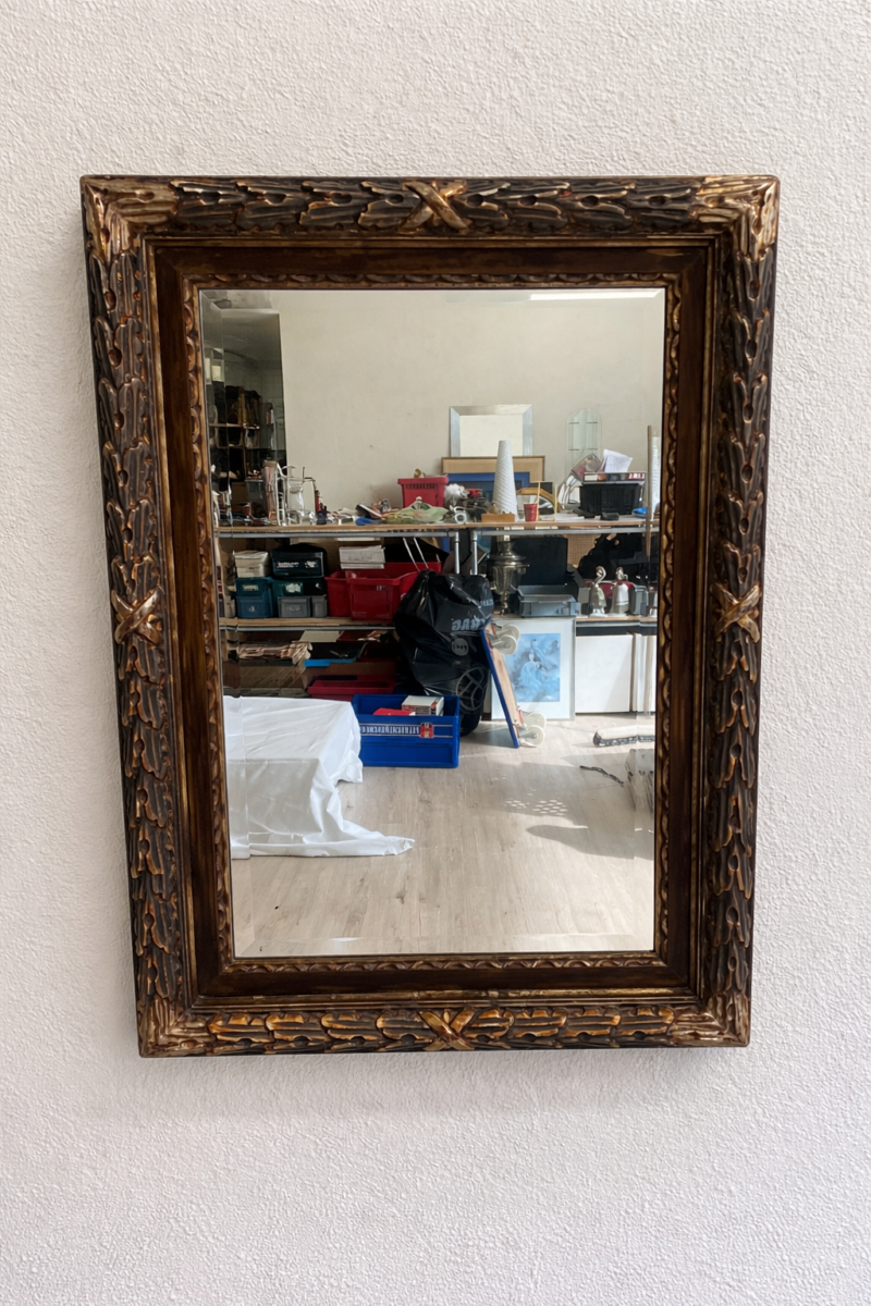 Reich verzierte Ornamente und goldene Akzente geben diesem Wandspiegel einen klar barocken Charakter. Der rechteckige Rahmen wirkt durch seine Tiefe fast plastisch und setzt die Spiegelfläche in Szene. Die braune Grundfarbe mit den glanzvollen Details passt gut zu klassischen wie auch zu verspielten Einrichtungen. Leichte Gebrauchsspuren sind sichtbar, der Spiegel selbst ist intakt. Ideal als Blickfang im Eingangsbereich, Schlafzimmer oder Wohnraum.