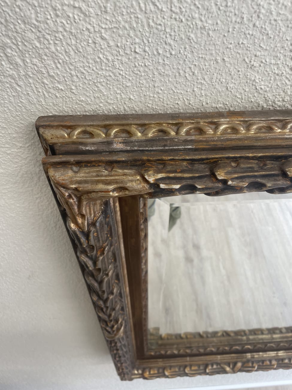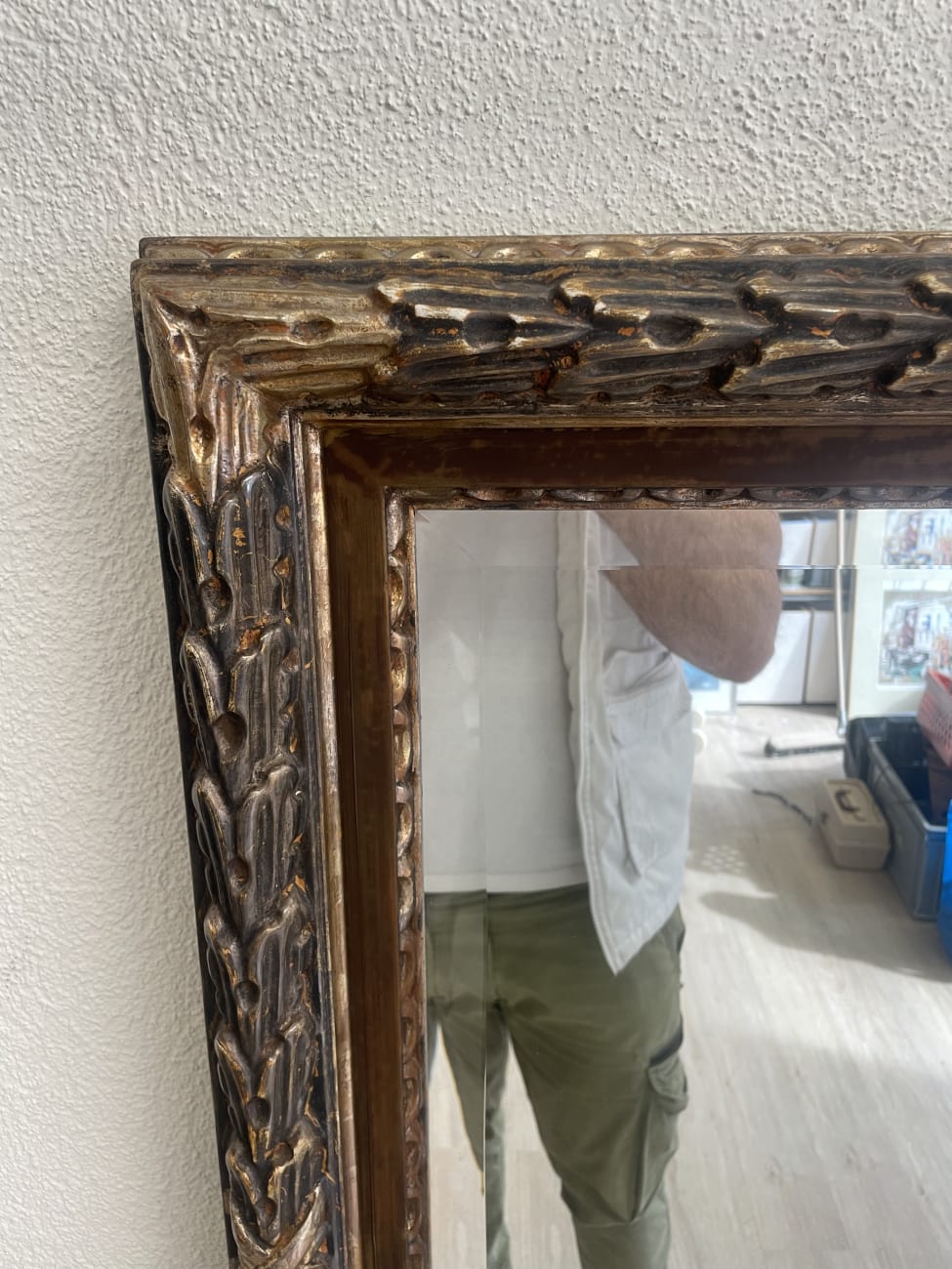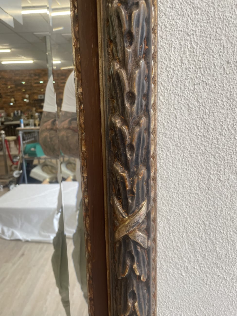 Reich verzierte Ornamente und goldene Akzente geben diesem Wandspiegel einen klar barocken Charakter. Der rechteckige Rahmen wirkt durch seine Tiefe fast plastisch und setzt die Spiegelfläche in Szene. Die braune Grundfarbe mit den glanzvollen Details passt gut zu klassischen wie auch zu verspielten Einrichtungen. Leichte Gebrauchsspuren sind sichtbar, der Spiegel selbst ist intakt. Ideal als Blickfang im Eingangsbereich, Schlafzimmer oder Wohnraum.