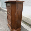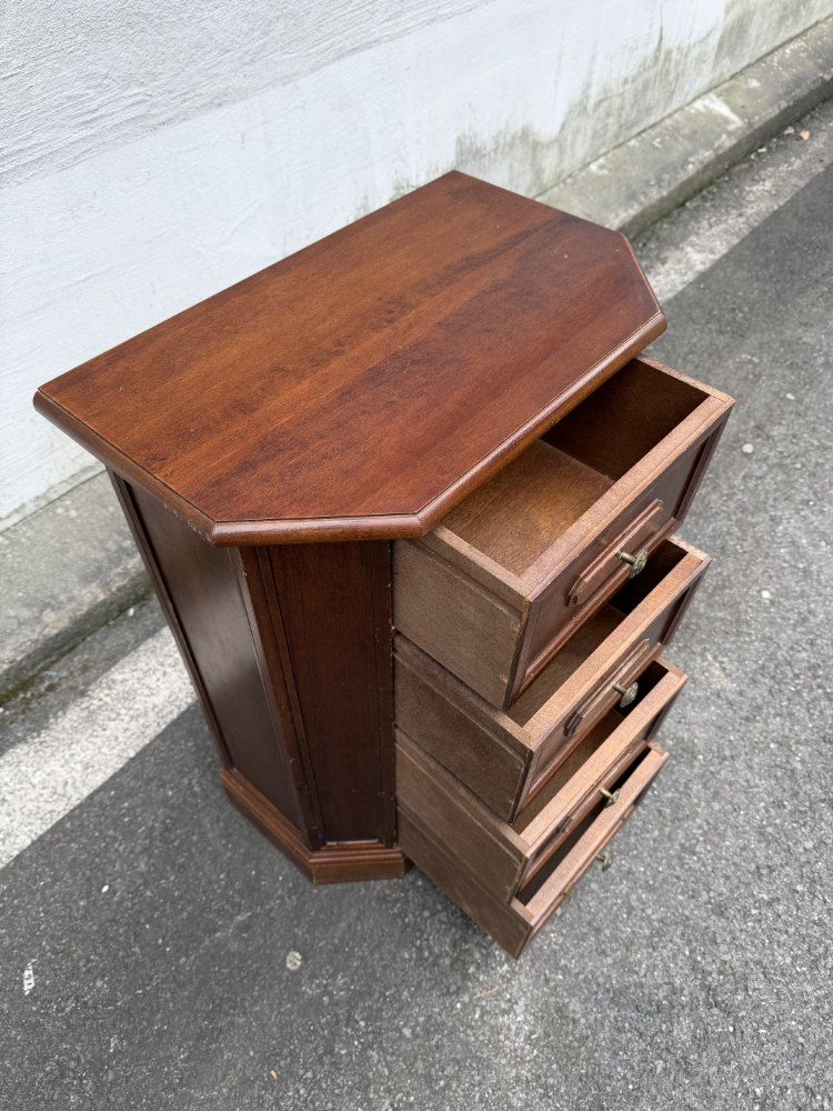 Diese klassische Beistellkommode bringt zeitlose Eleganz und praktische Funktion in jeden Raum. Gefertigt aus dunkel gebeiztem Holz mit furnierter Oberfläche, überzeugt sie durch ihre harmonische Formgebung, abgeschrägte Seiten und fein profilierte Fronten. Vier gleich grosse Schubladen mit originalen Messingknöpfen bieten reichlich Platz für kleine Gegenstände, Papiere oder Accessoires.