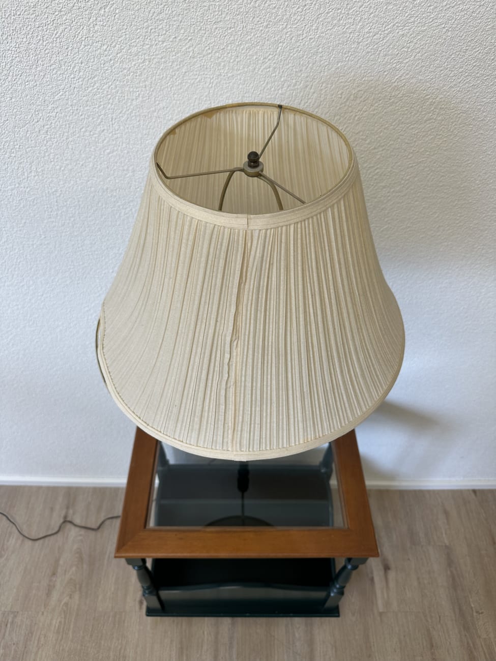 Praktische Kombination aus Beleuchtung und Ablage. Dieser Vintage Beistelltisch aus den 1970er bis 1980er Jahren verbindet eine Tischlampe mit einem kleinen Möbelstück für den Alltag. Gedrechselte Holzbeine, dunkelgrüne Lackierung und ein warmer Holzrahmen um die Glasplatte geben dem Möbel eine ruhige, wohnliche Ausstrahlung. Unter der Glasfläche befindet sich ein integriertes Zeitungsfach, in dem Magazine, Bücher oder Fernbedienungen ordentlich verstaut werden können. Die Lampe mit plissiertem Stoffschirm sorgt für angenehmes Licht neben Sofa oder Lesesessel.
