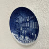 Ein originaler Weihnachtsteller von Bing & Grøndahl / Royal Copenhagen aus Dänemark. Das Motiv zeigt eine winterliche Szene mitten in Kopenhagen: Der Weihnachtsmann steht bei einem Brunnen, Kinder und Passanten sammeln sich auf dem Platz, im Hintergrund leuchten Fensterfronten und eine festliche Girlande mit Stern spannt sich durch die Strasse. Das tiefe Kobaltblau und die reliefierten Details geben dem Teller richtig Tiefe und machen ihn an der Wand besonders schön.