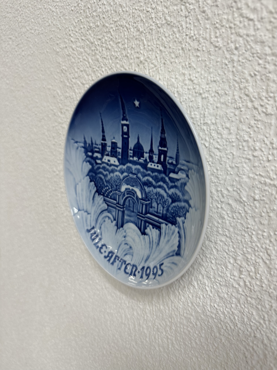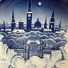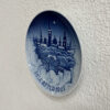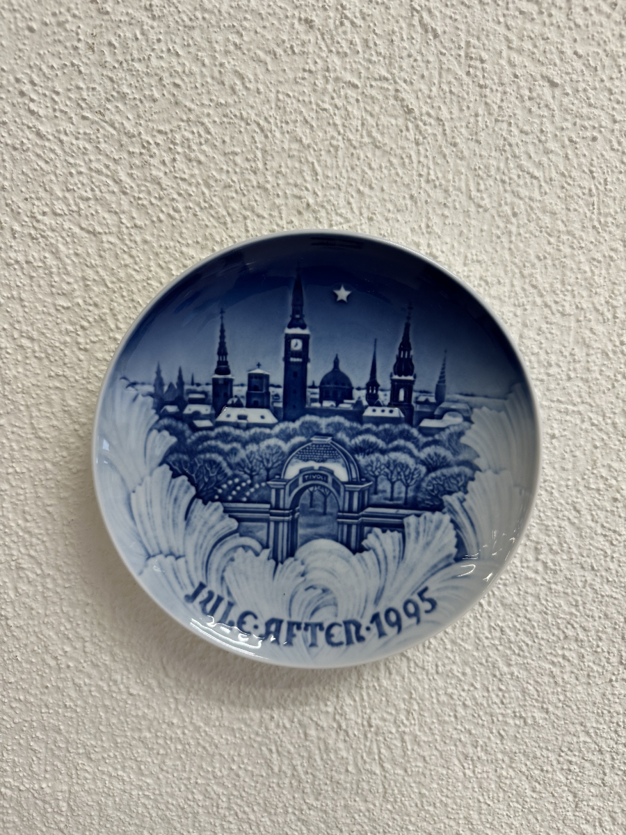 Ein wunderschöner originaler Weihnachtsteller von Bing & Grøndahl / Royal Copenhagen aus Dänemark. Das Motiv zeigt die Türme von Kopenhagen mit Blick auf den Tivoli-Eingang und die markante Skyline der Stadt. Im Vordergrund sprühen die Brunnen, darüber leuchtet ein Stern am winterlichen Himmel. Typisch für diese Serie ist das tiefe Kobaltblau mit feinen architektonischen Details, die im Licht richtig lebendig wirken. Ideal als Sammlerstück oder als festliche Wanddekoration zur Weihnachtszeit.