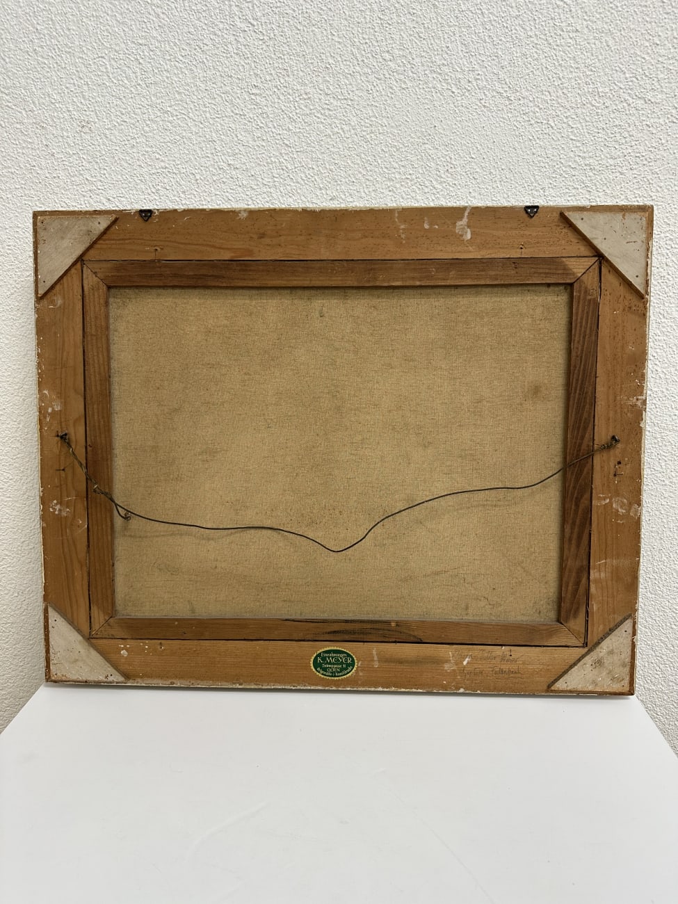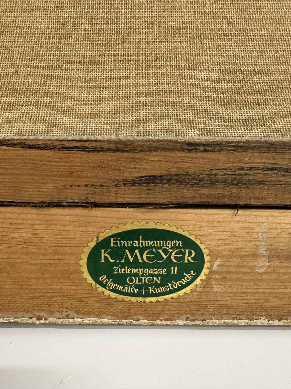 Der Rahmen ist aufwendig gestaltet mit floralen Eckverzierungen und leicht patinierter Oberfläche in Gold und Grün. Auf der Rückseite findet sich ein Etikett einer Einrahmung aus Olten, was auf eine spätere Rahmung oder regionale Herkunft hinweist.