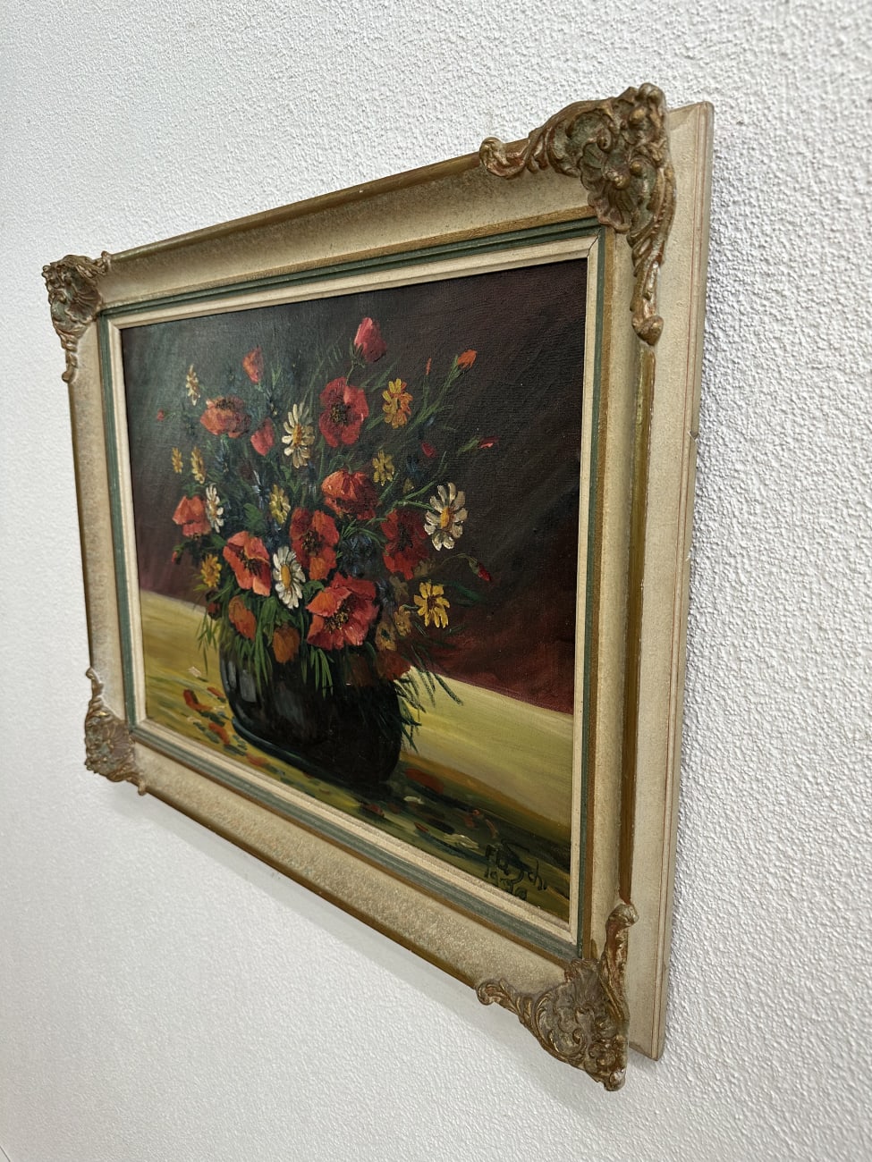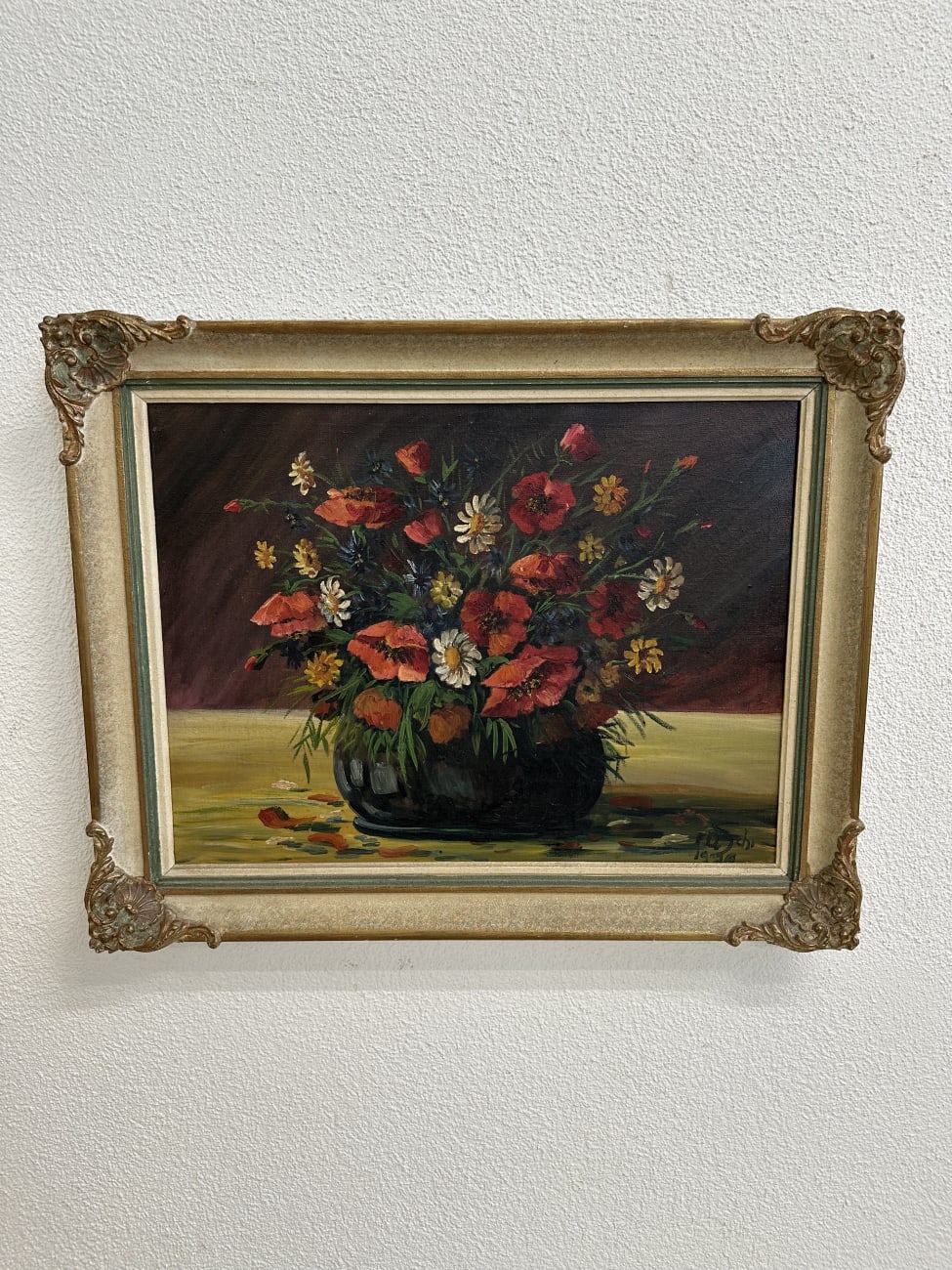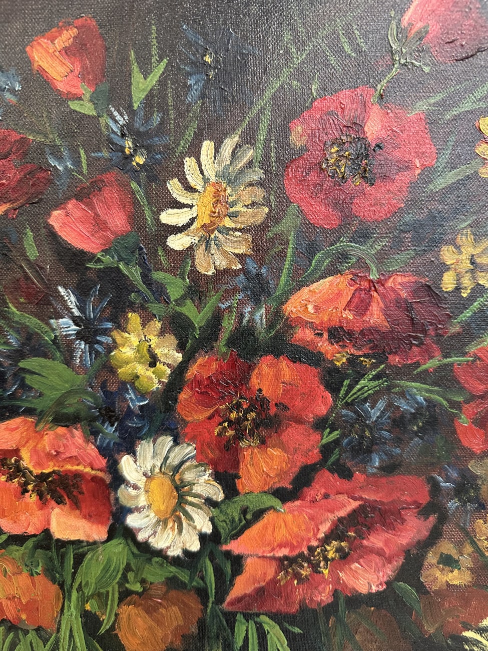 Kräftige Rottöne, feine Pinselstruktur und ein dichter Strauss aus Mohnblumen und Wiesenblüten stehen hier im Mittelpunkt. Das Ölbild zeigt eine lebendige Komposition in dunkler Vase, mit locker gesetzten Blütenblättern und sichtbaren Farbaufträgen. Der Hintergrund bleibt ruhig und lässt die Farben stärker wirken. Unten rechts signiert und datiert, was dem Bild zusätzlich Charakter gibt.