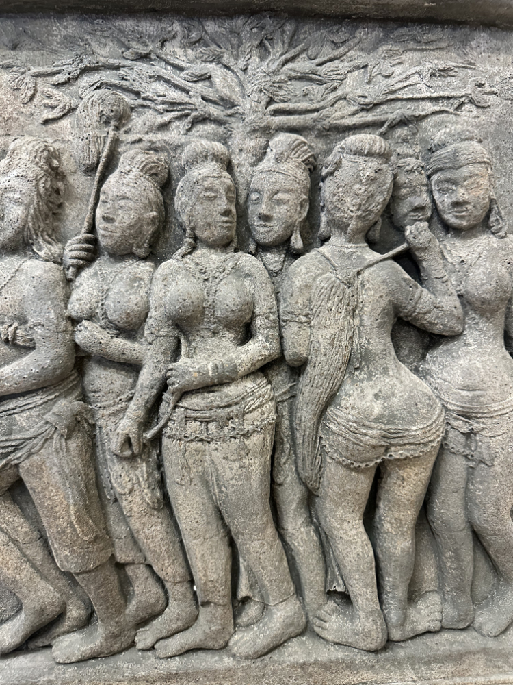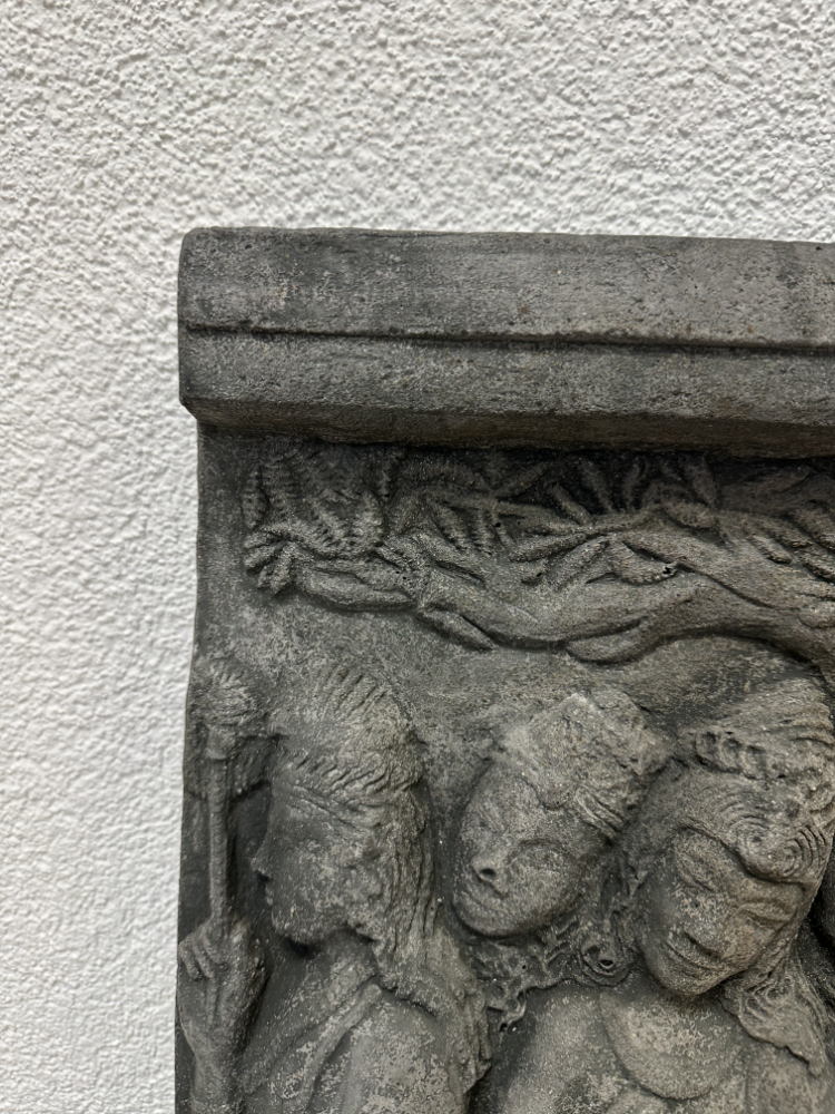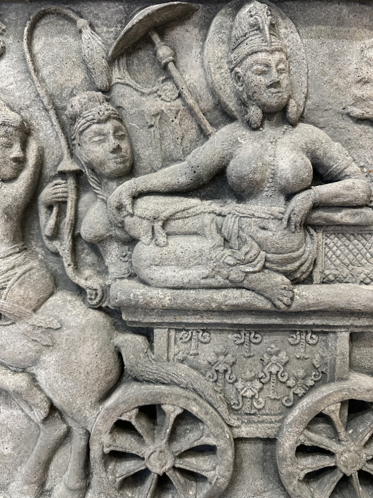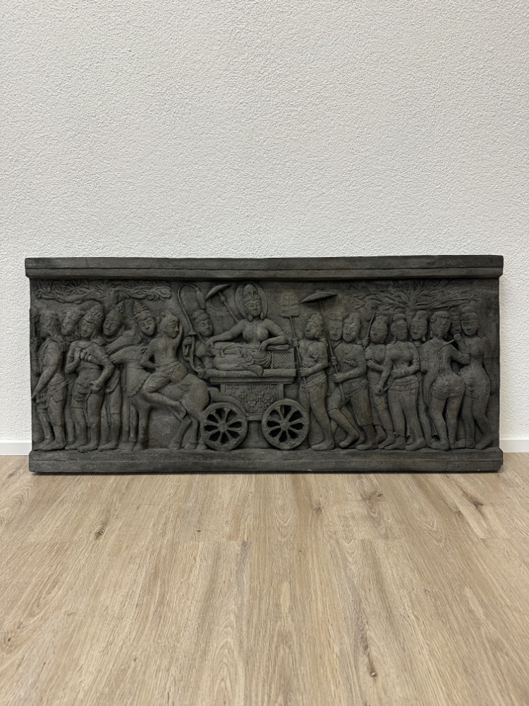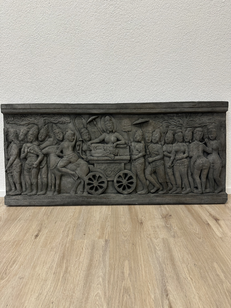 Dieses eindrucksvolle Wandrelief zeigt eine der zentralen Szenen der buddhistischen Überlieferung: Königin Maya auf dem Weg in den Lumbini-Garden, wo sie Buddha zur Welt bringen wird. Die Darstellung folgt einem historischen Vorbild aus dem berühmten Borobudur-Tempel auf Java, dessen Reliefs aus dem 8. Jahrhundert stammen.