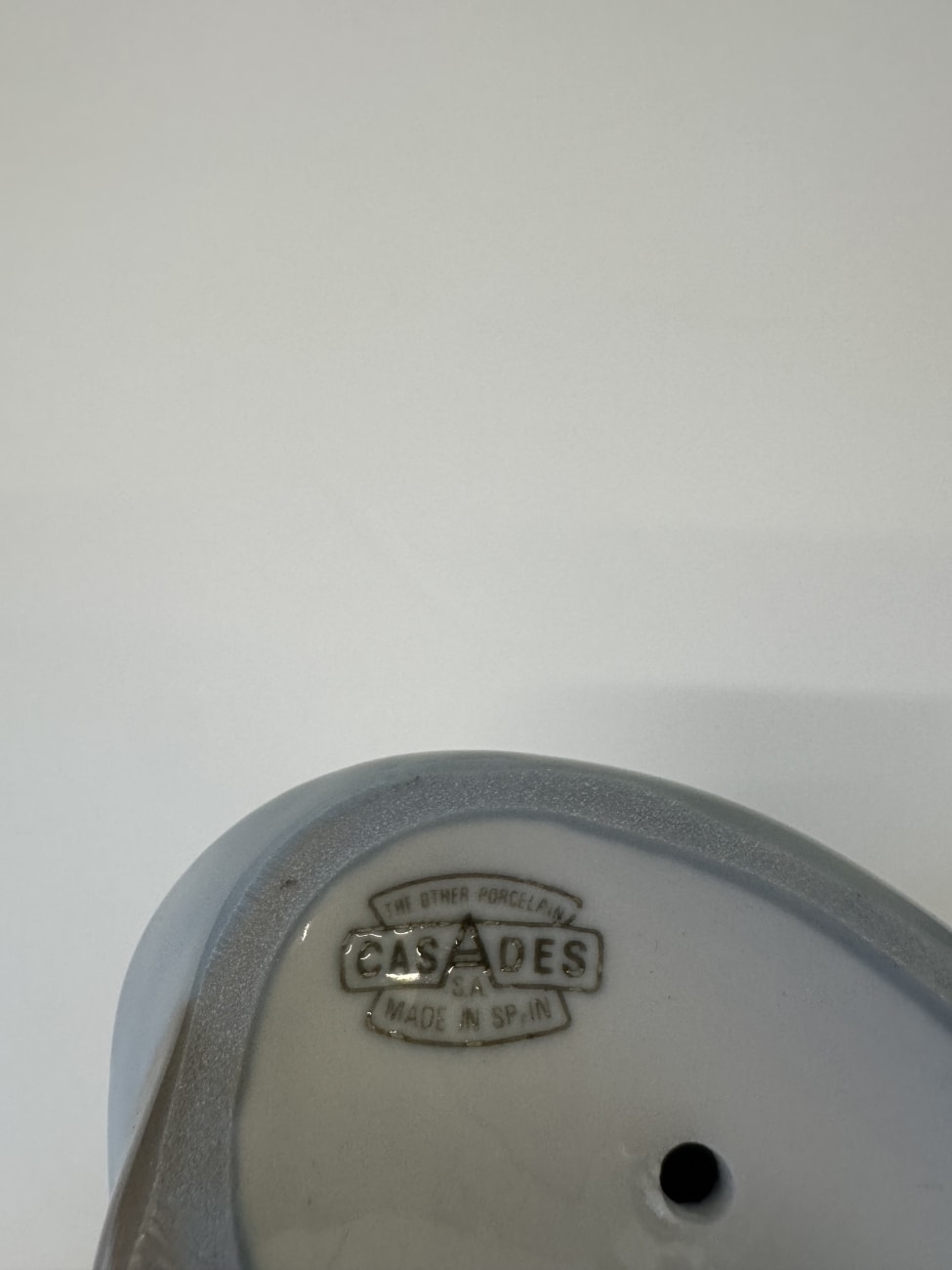 Fein glasiertes Porzellan mit weichen Farben und liebevollen Details. Dargestellt ist ein Mädchen mit Hut, Schürze und einem Korb voller kleiner Hasen, ruhig und fast verträumt modelliert. Solche Figuren stammen oft aus spanischer Produktion, hier klar erkennbar an der Bodenmarke „Casades Made in Spain“. Die sanften Blau-, Creme- und Rosatöne wirken warm und passen gut in klassische oder verspielte Wohnstile. Ausdruck und Haltung sind typisch für dekorative Figuren dieser Zeit.