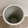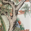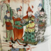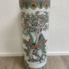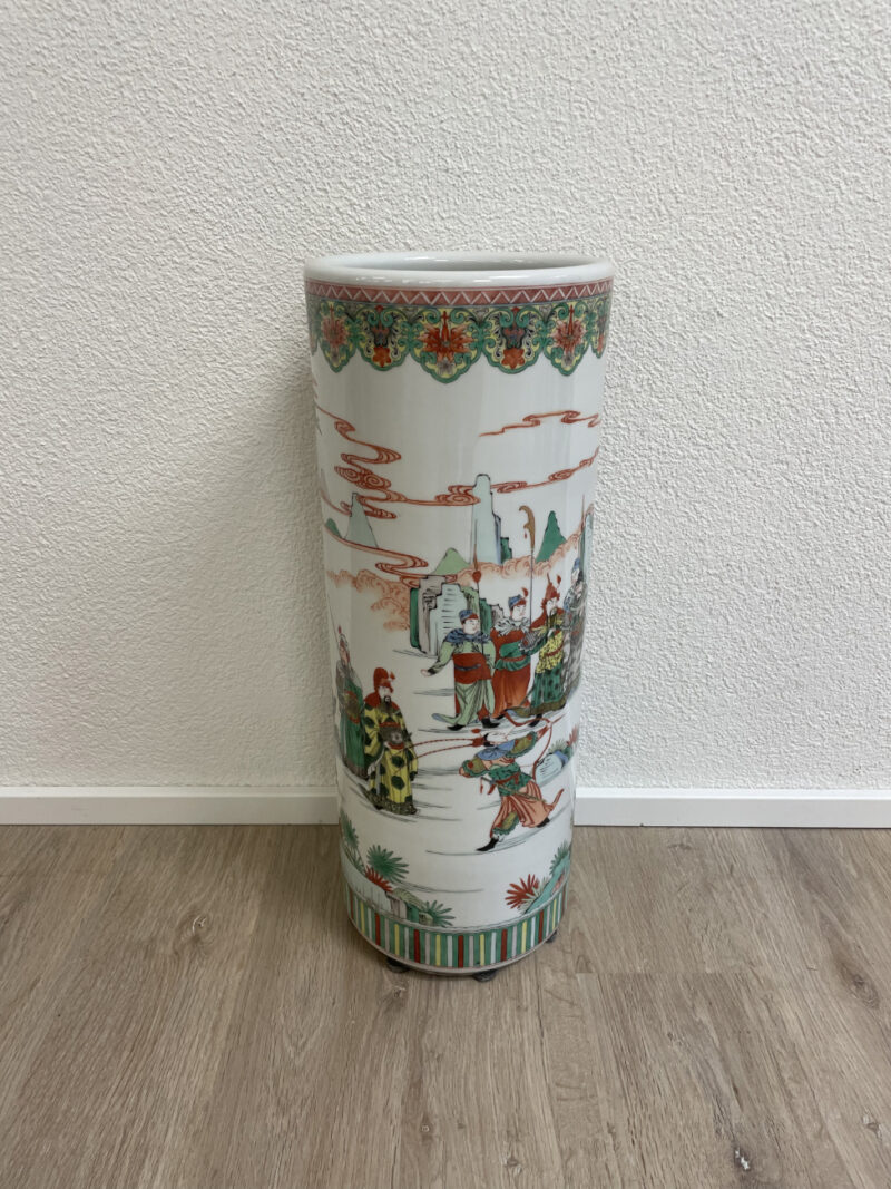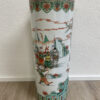 Hohe zylindrische Form, rundum reich dekoriert mit fein gemalten Figuren, Bäumen und Landschaftselementen im traditionellen chinesischen Stil. Grün, Rot, Schwarz und zarte Pastelltöne setzen sich klar vom weissen Porzellangrund ab. Der obere Rand ist mit ornamentaler Bordüre verziert, unten läuft ein Streifenmuster rundum. Steht auf kleinen dezenten Füssen und wirkt im Raum sofort präsent.