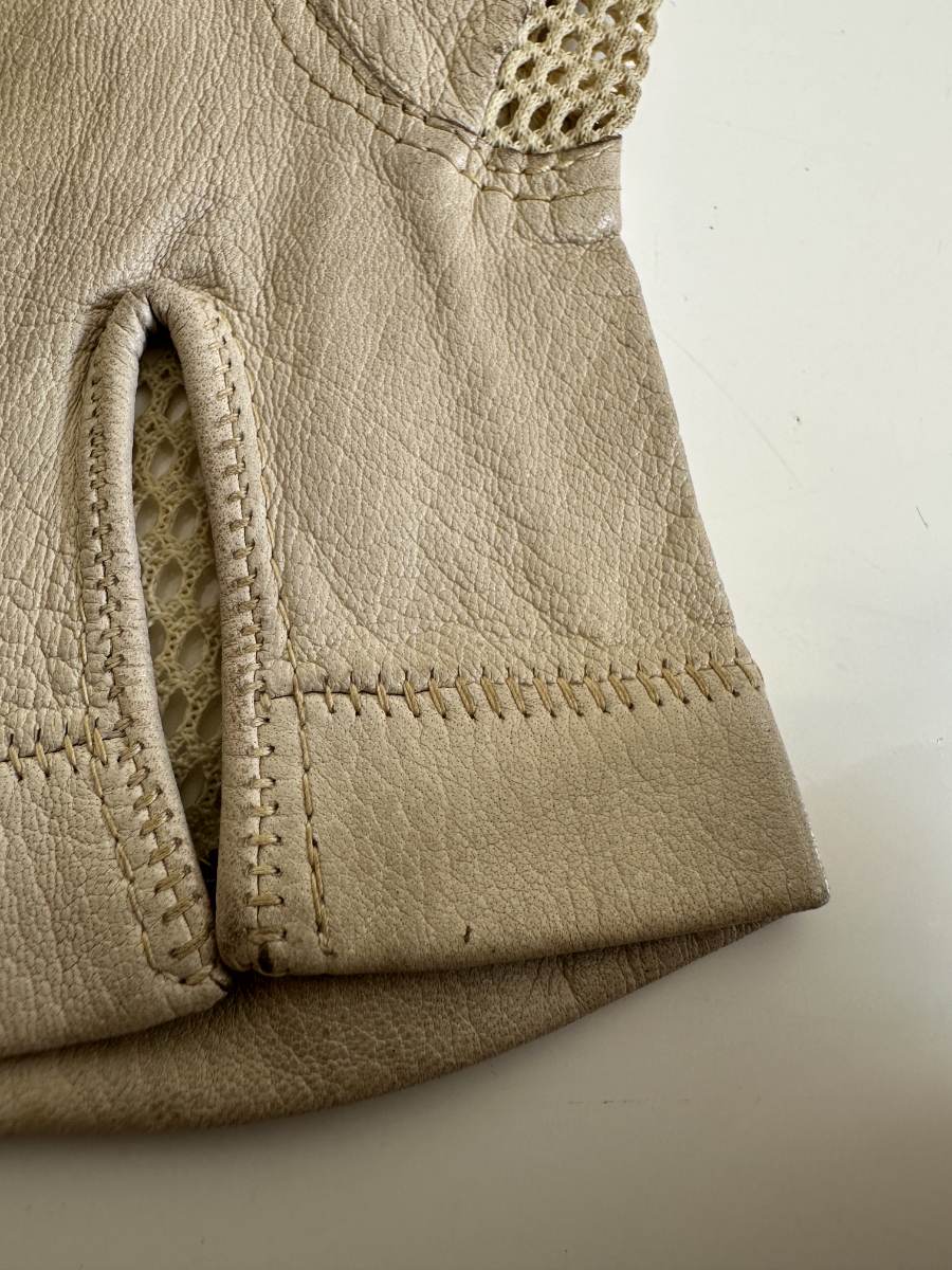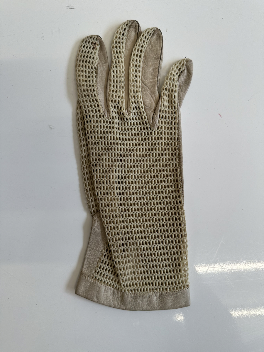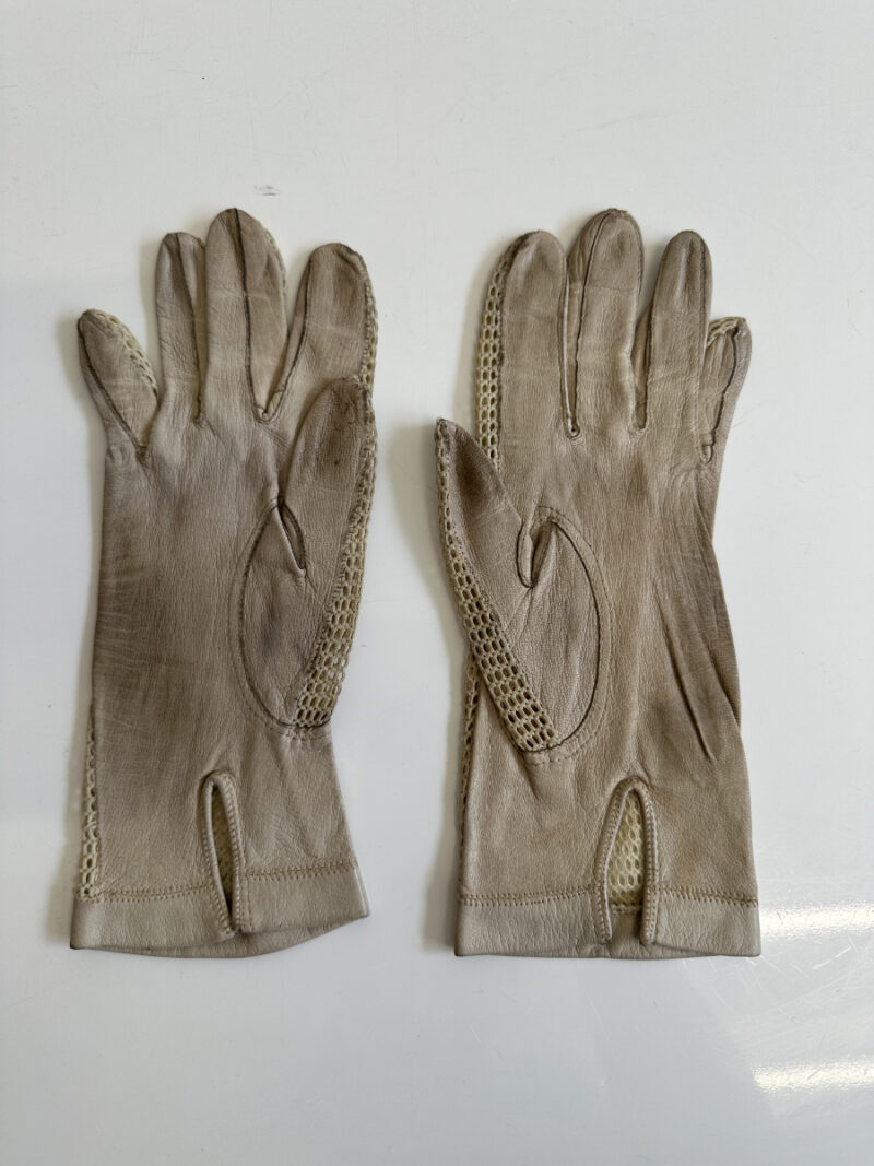 Weiches, hellbeiges Leder trifft auf fein gearbeitetes Häkelnetz und sorgt für einen eleganten, luftigen Charakter. Diese Vintage Damenhandschuhe stammen stilistisch aus der Mitte des 20. Jahrhunderts und zeigen die typische Kombination aus Funktionalität und femininer Handwerkskunst. Die perforierten Einsätze an Handrücken und Fingern verleihen Leichtigkeit, während die Lederflächen für angenehmen Halt sorgen. Ein klassisches Accessoire für Liebhaberinnen authentischer Vintage-Mode.