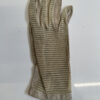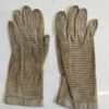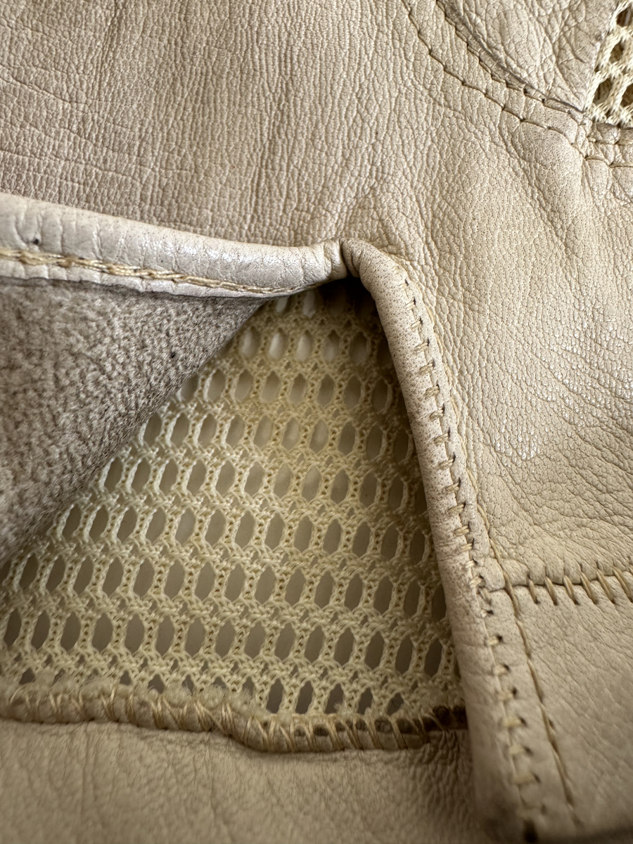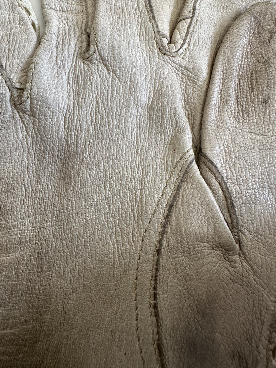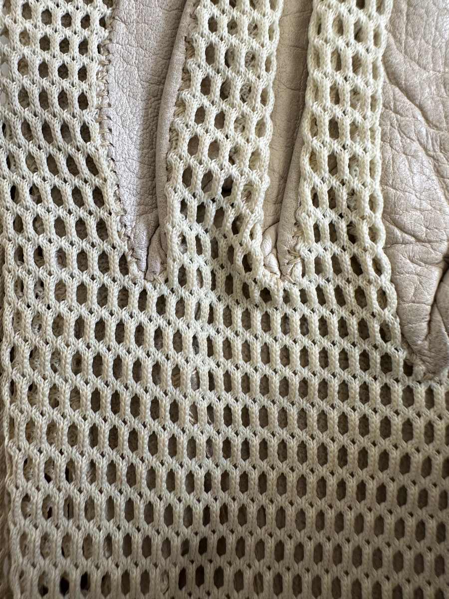 Weiches, hellbeiges Leder trifft auf fein gearbeitetes Häkelnetz und sorgt für einen eleganten, luftigen Charakter. Diese Vintage Damenhandschuhe stammen stilistisch aus der Mitte des 20. Jahrhunderts und zeigen die typische Kombination aus Funktionalität und femininer Handwerkskunst. Die perforierten Einsätze an Handrücken und Fingern verleihen Leichtigkeit, während die Lederflächen für angenehmen Halt sorgen. Ein klassisches Accessoire für Liebhaberinnen authentischer Vintage-Mode.