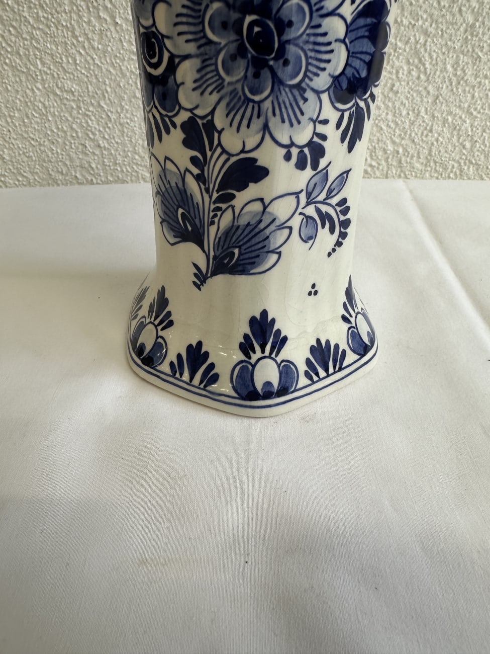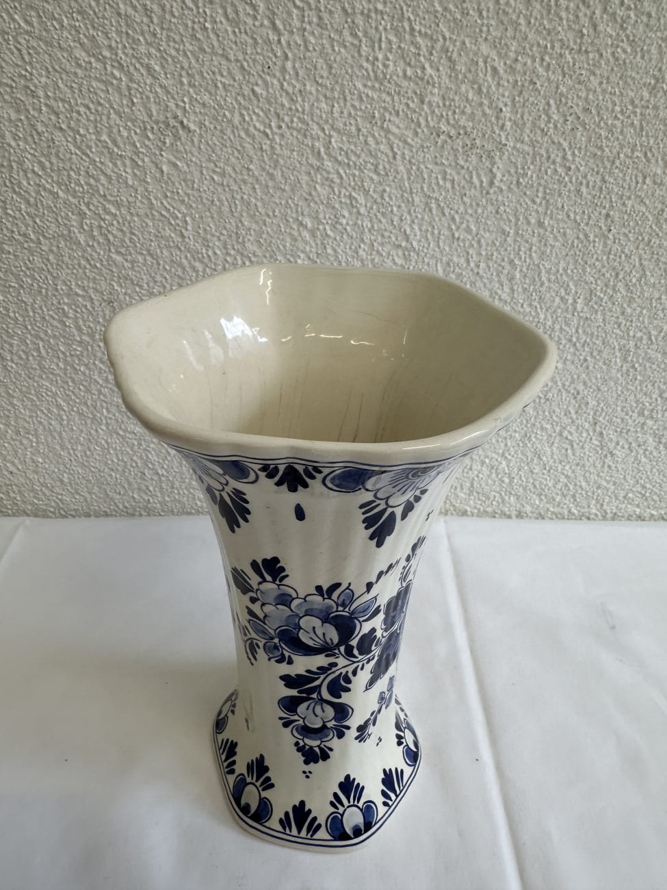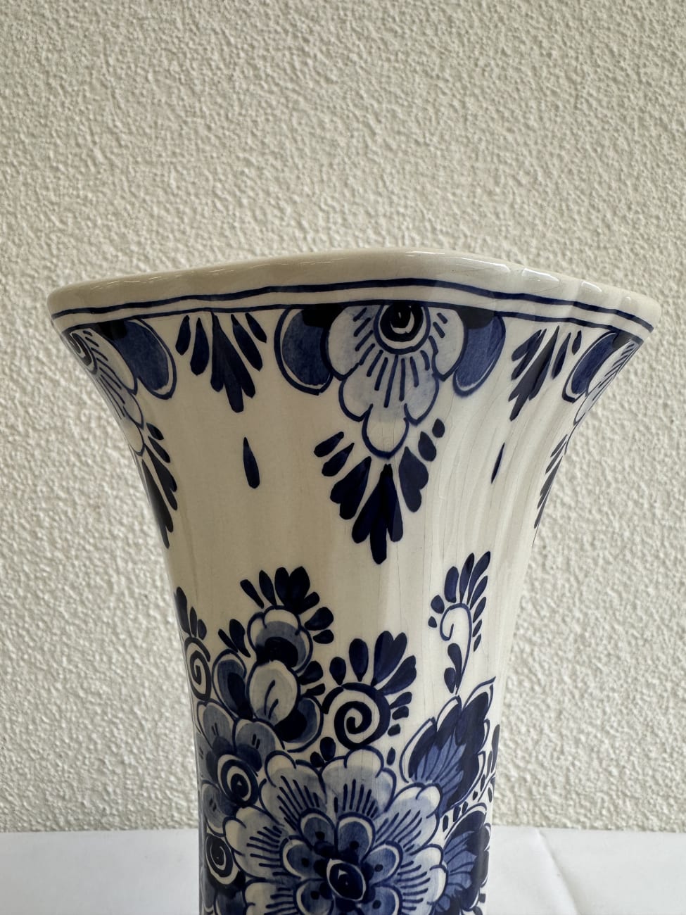 Blauweisse Keramik mit handgemalten Blumenmotiven prägt diese dekorative Vase im typischen Delfter Stil. Die Form ist nach oben weit geöffnet und leicht ausgestellt, während der Körper schlank nach unten verläuft und auf einem mehrkantigen Fuss steht. Auffällig sind die kräftigen kobaltblauen Ornamente mit floralen Elementen, Blättern und dekorativen Bordüren.