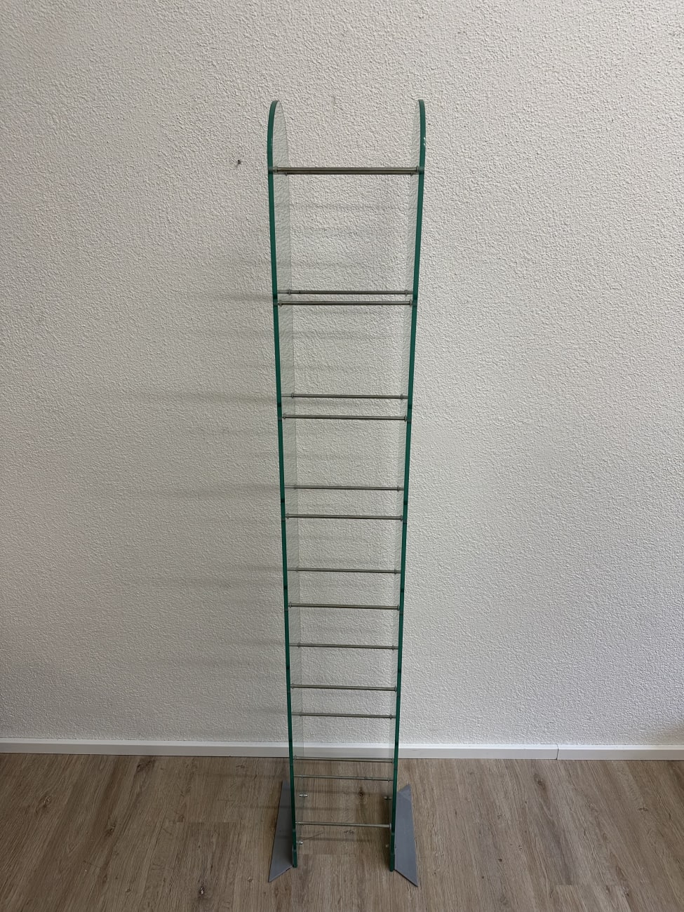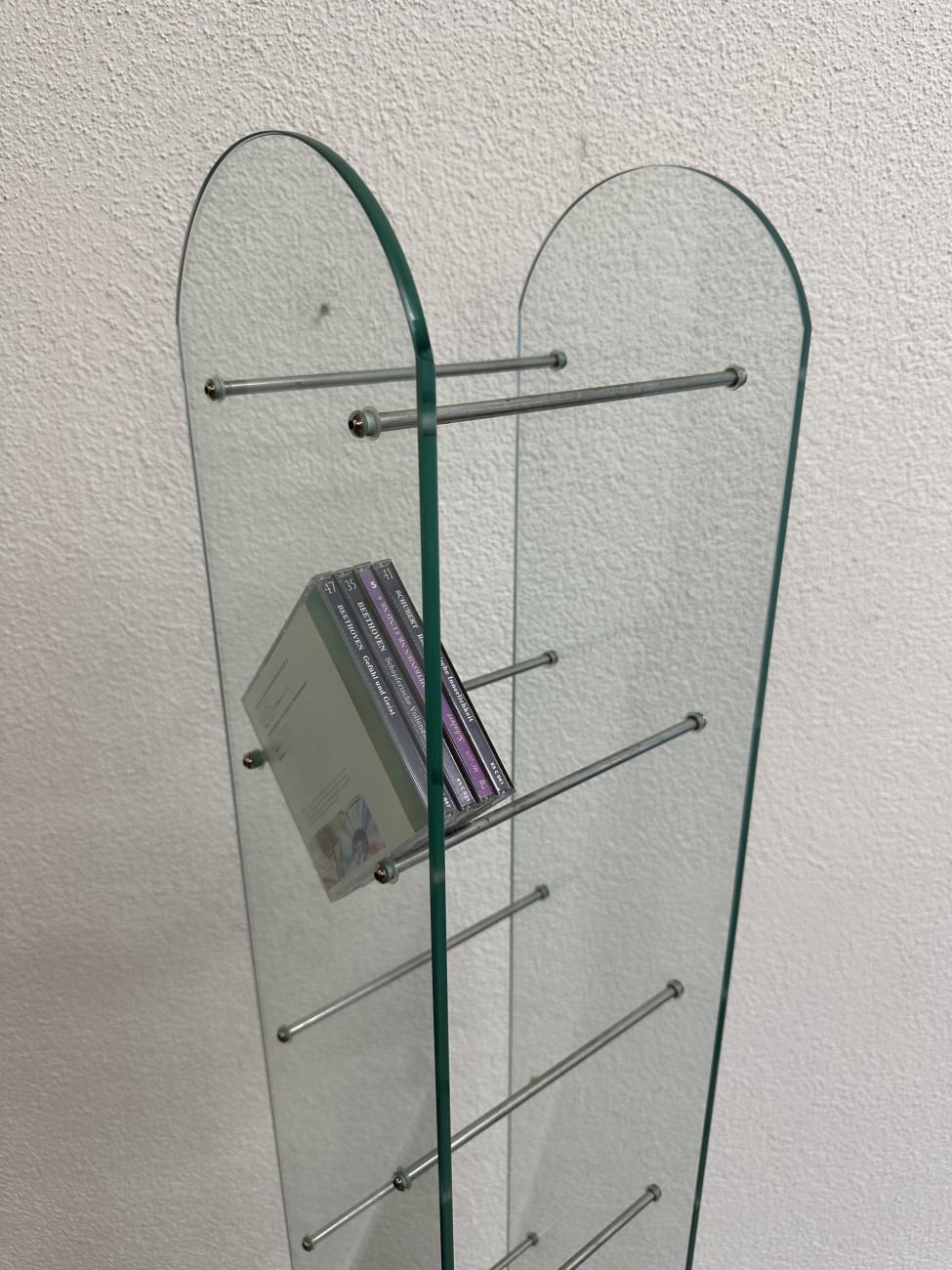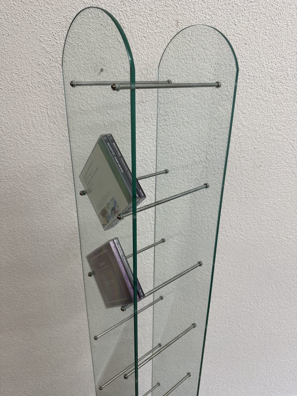 Klare Linien, gebogenes Glas und schlanke Metallstäbe geben diesem CD Regal eine leichte, fast schwebende Wirkung. Das Design passt in die Zeit, als transparente Materialien und Metall im Wohnbereich stark gefragt waren. Zwei gebogene Glasplatten bilden die Seiten, dazwischen sorgen mehrere Metallstreben für die Ablage von CDs. Der Aufbau ist stabil, die Füsse aus Metall geben sicheren Stand. Durch die offene Bauweise bleibt alles gut sichtbar und schnell griffbereit. Ideal für alle, die ihre Sammlung ordentlich und gleichzeitig dekorativ präsentieren möchten.