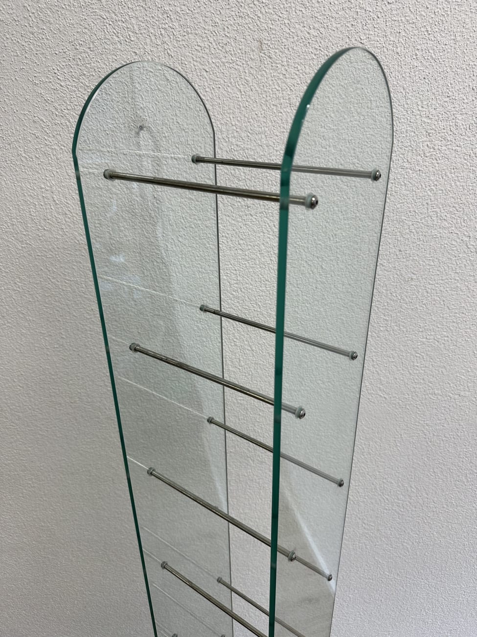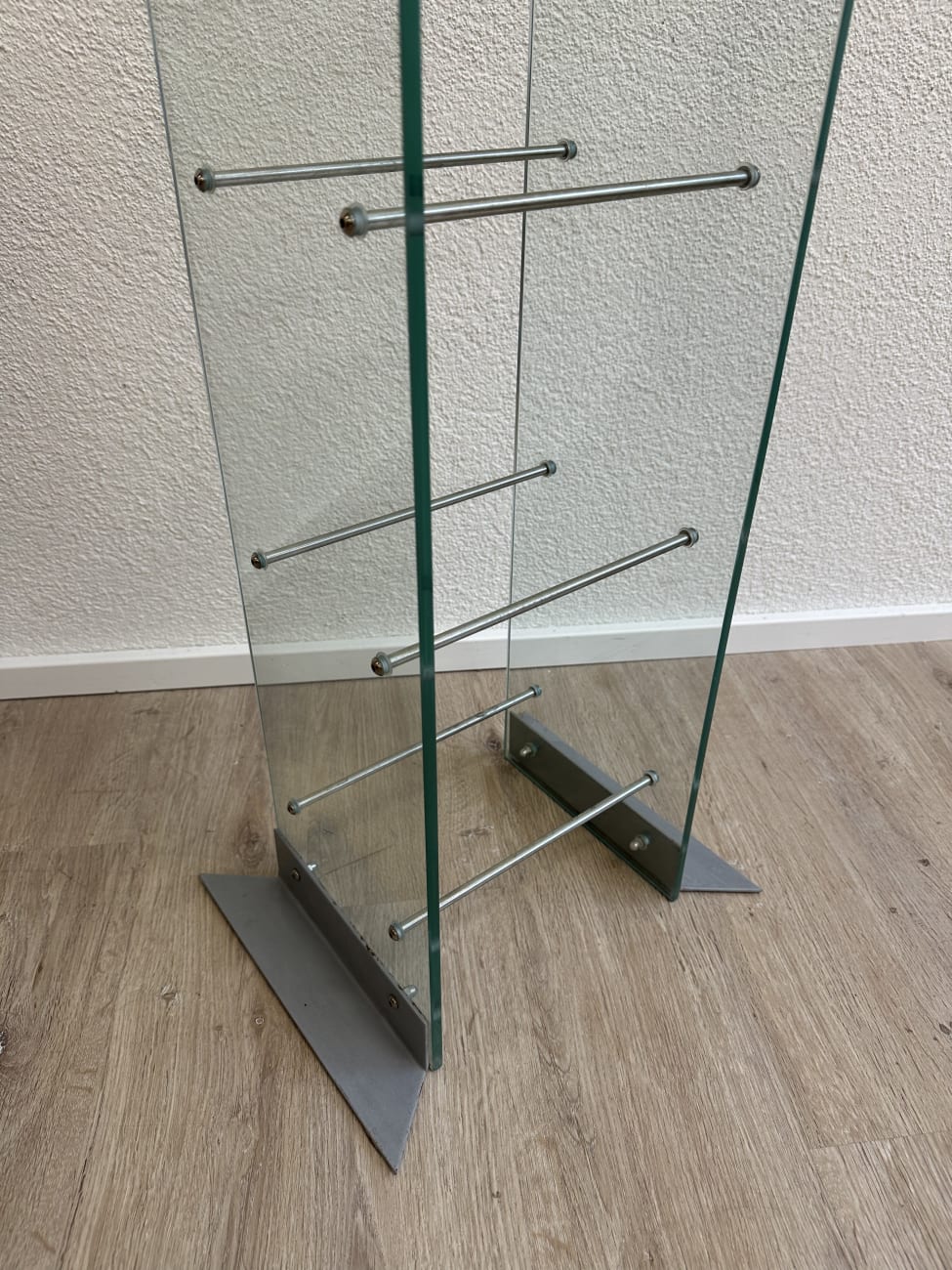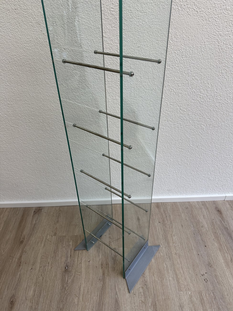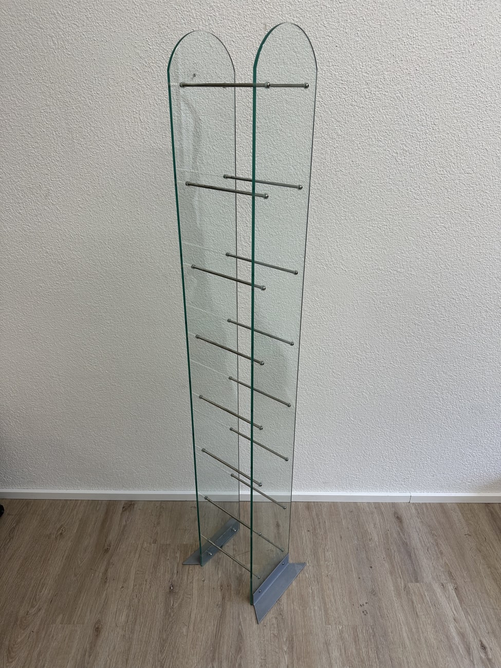 Klare Linien, gebogenes Glas und schlanke Metallstäbe geben diesem CD Regal eine leichte, fast schwebende Wirkung. Das Design passt in die Zeit, als transparente Materialien und Metall im Wohnbereich stark gefragt waren. Zwei gebogene Glasplatten bilden die Seiten, dazwischen sorgen mehrere Metallstreben für die Ablage von CDs. Der Aufbau ist stabil, die Füsse aus Metall geben sicheren Stand. Durch die offene Bauweise bleibt alles gut sichtbar und schnell griffbereit. Ideal für alle, die ihre Sammlung ordentlich und gleichzeitig dekorativ präsentieren möchten.
