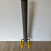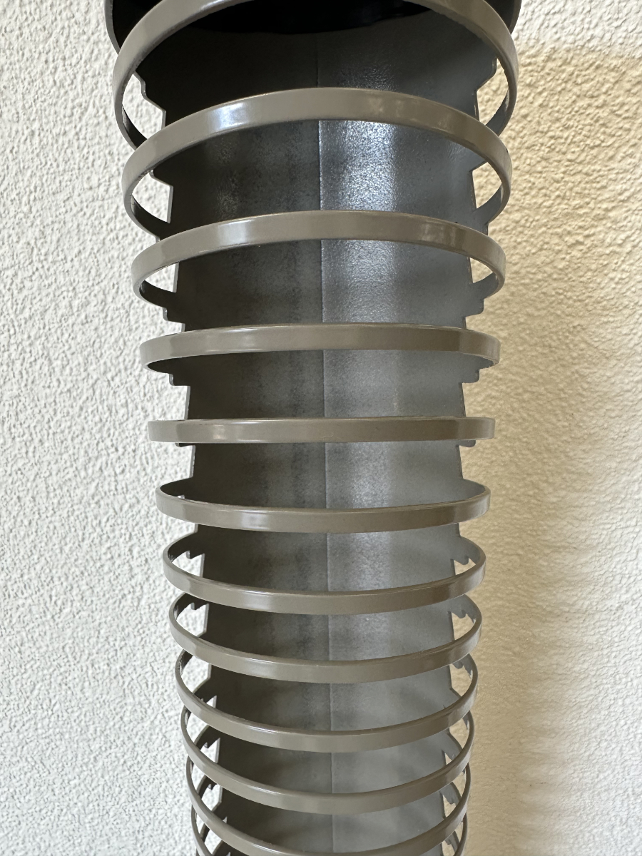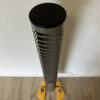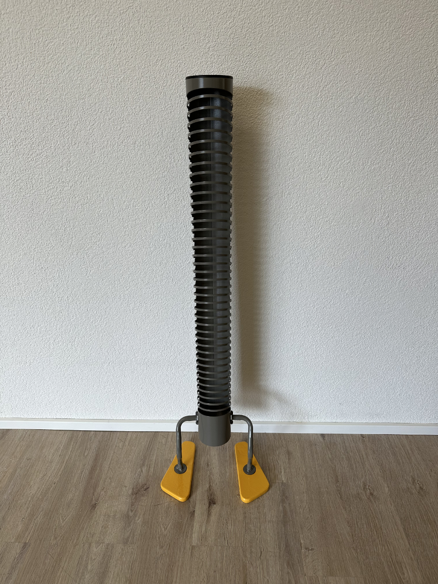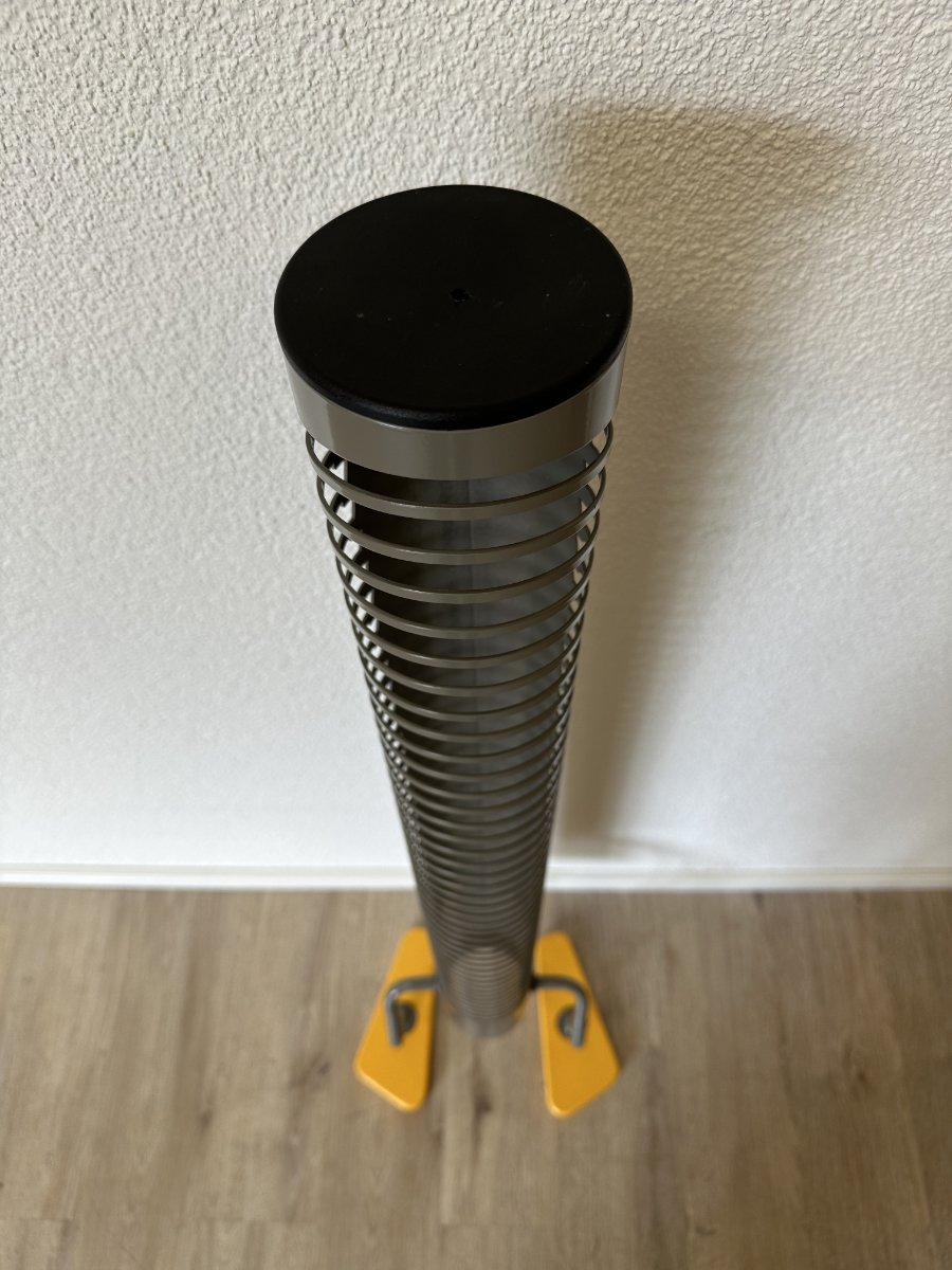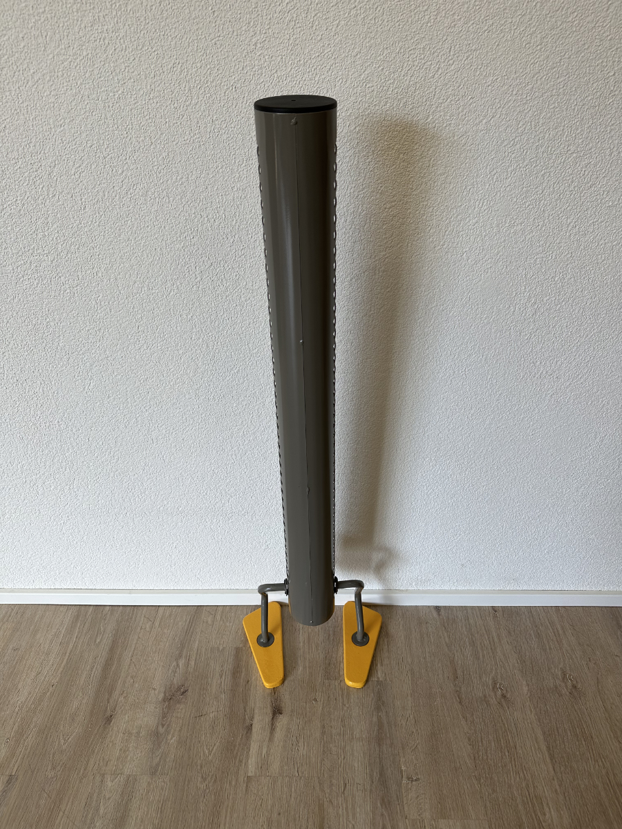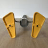 Grau lackiertes Metall trifft auf zwei breite Standfüsse in Gelb. Dadurch kippt nichts, auch wenn der Ständer gut gefüllt ist.