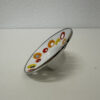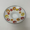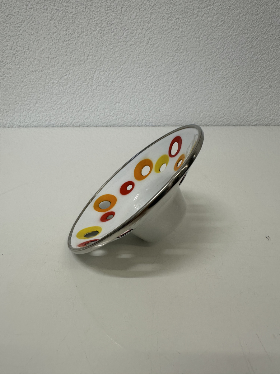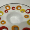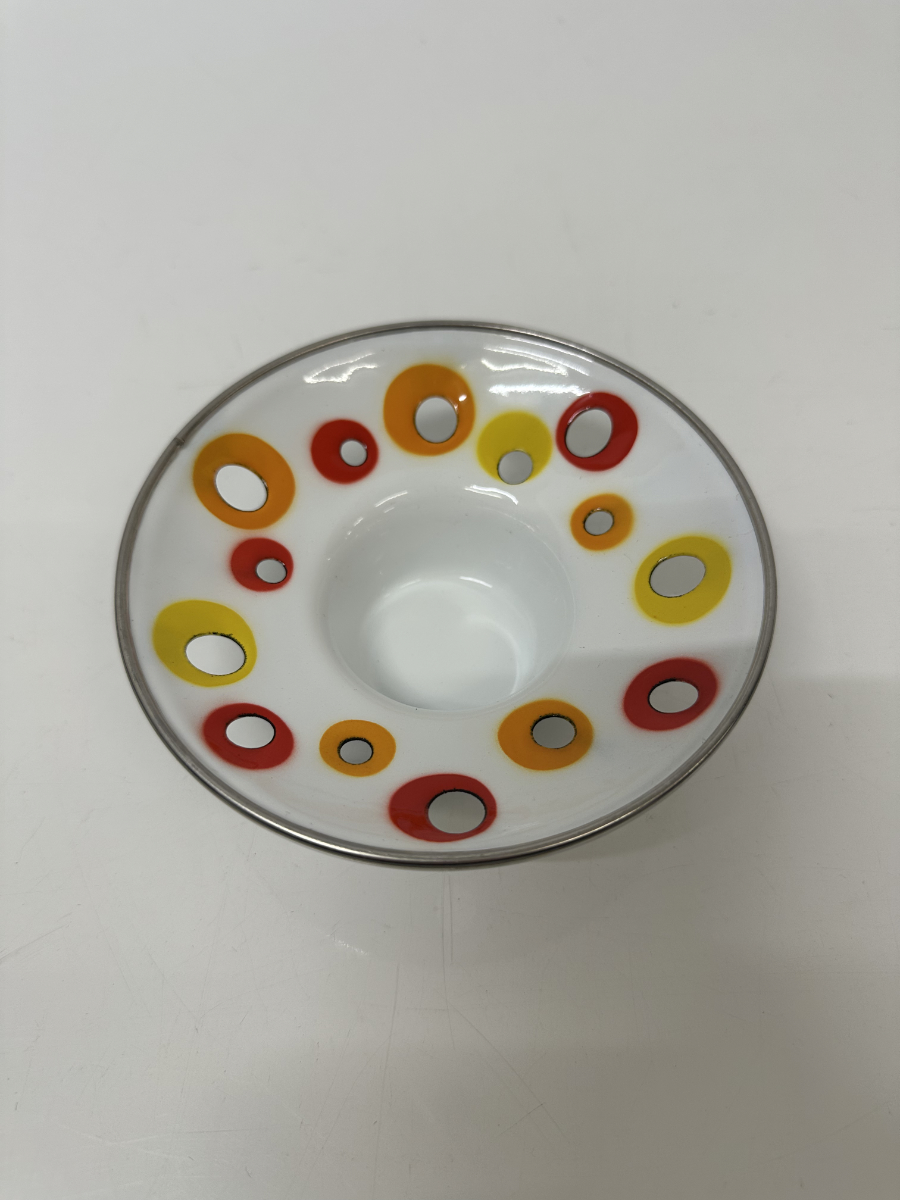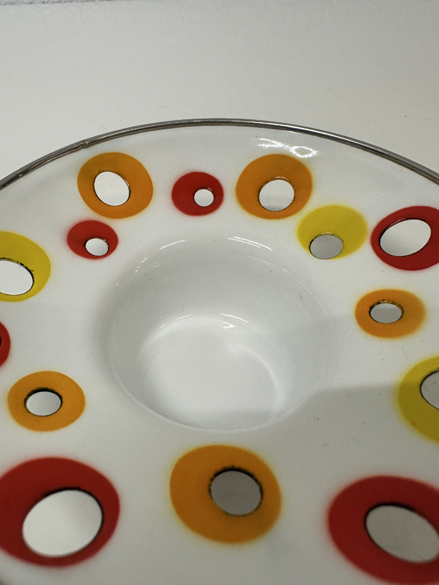 Leicht, farbig und eindeutig im Retro-Stil. Diese drei Teelichthalter bestehen aus emailliertem Metall und zeigen ein fröhliches Ringmuster in Rot, Gelb und Orange. Die zentrale Vertiefung nimmt ein Standard-Teelicht auf, die seitlichen Öffnungen sorgen für Luftzirkulation und schönes Lichtspiel. Typisches Design der 1960er–1970er Jahre.