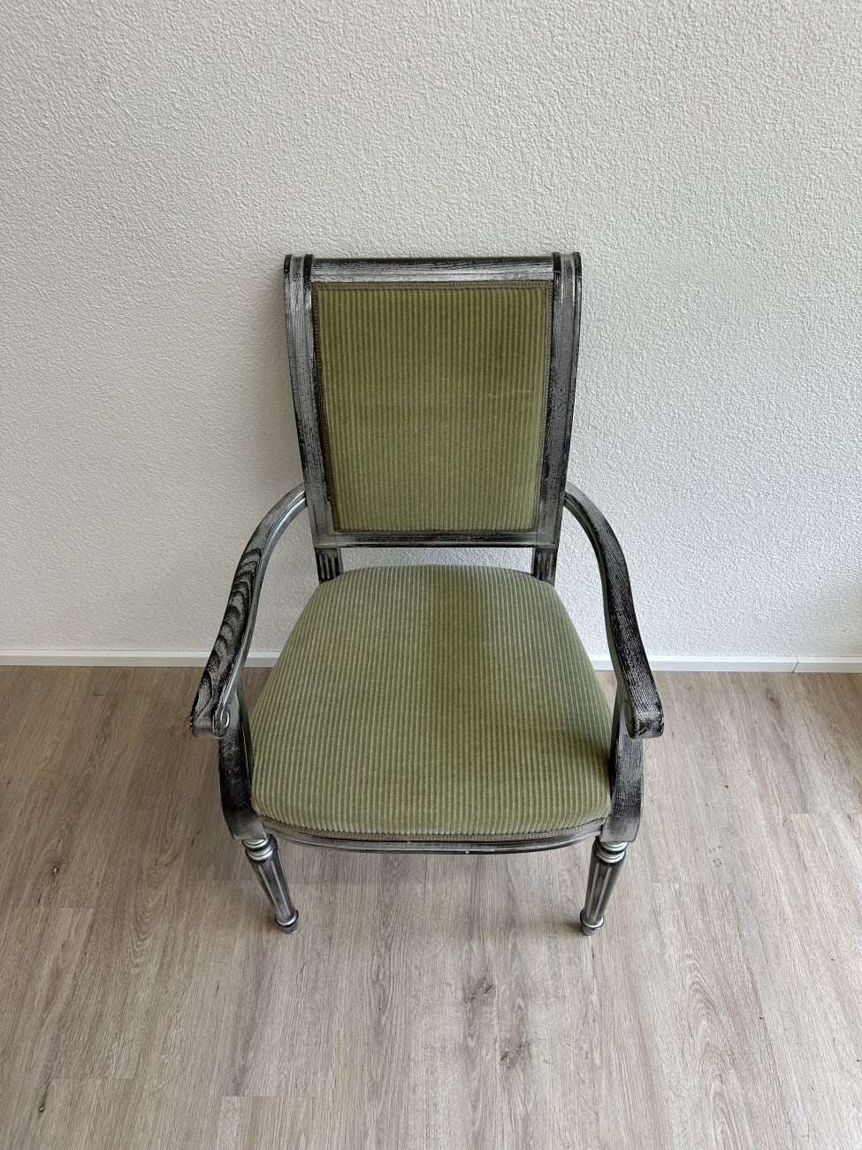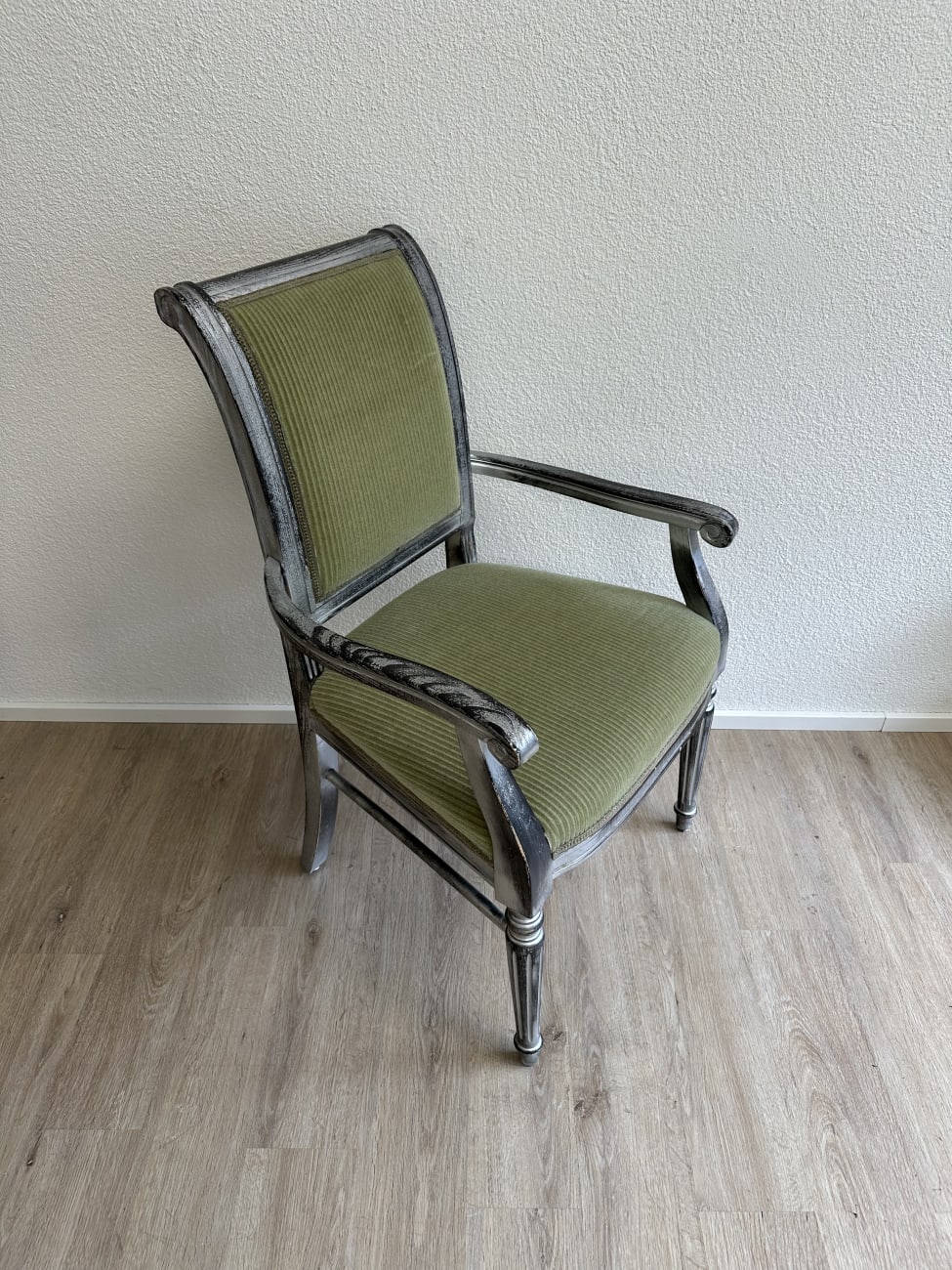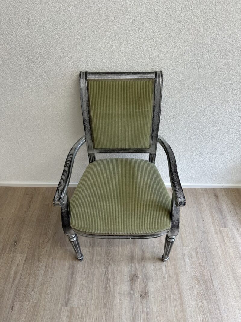 Geschwungene Armlehnen, gedrechselte Vorderbeine und eine leicht geneigte Rückenlehne geben diesem Vintage Armlehnstuhl im Empire Stil eine elegante und ruhige Ausstrahlung. Die Form orientiert sich an klassischen Möbelentwürfen mit klaren Linien und dekorativen Details. Massives Holz bildet die stabile Basis, während Sitzfläche und Rücken mit einem grün gestreiften Stoff gepolstert sind. Die Kombination aus dem silbrig patinierten Holzrahmen und dem warmen Stoffton sorgt für eine charaktervolle, wohnliche Wirkung.