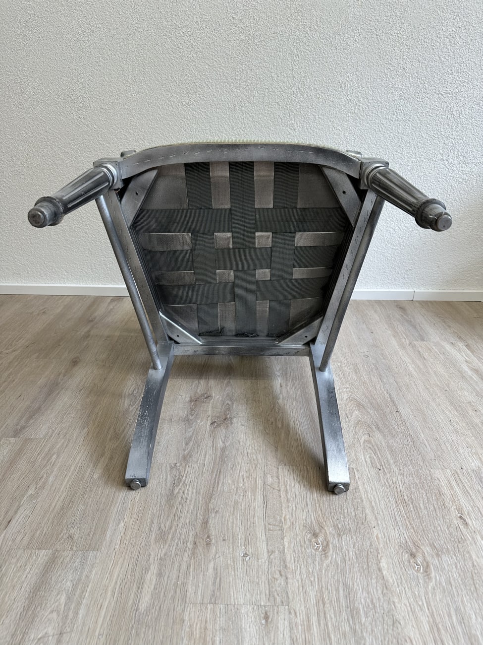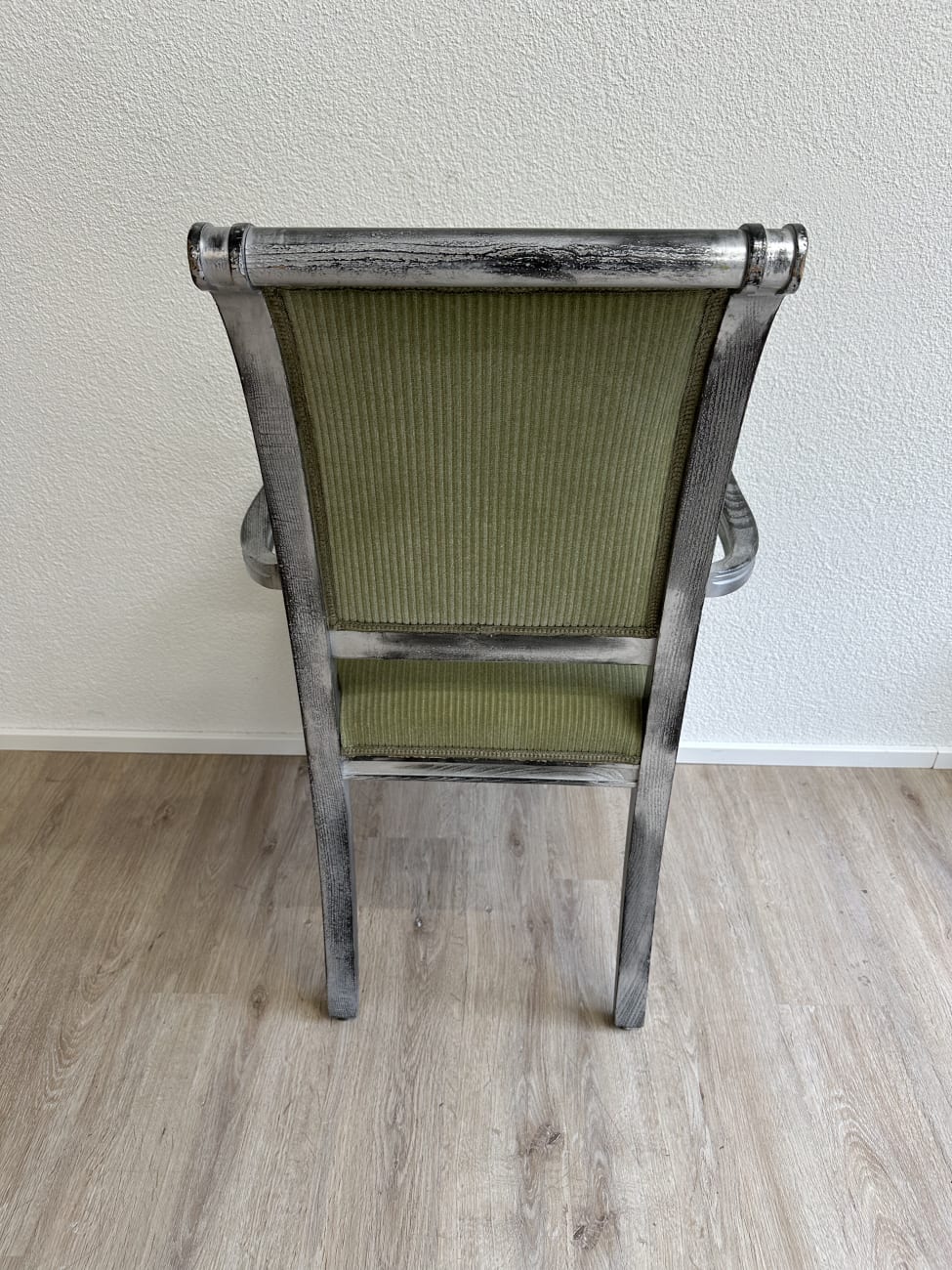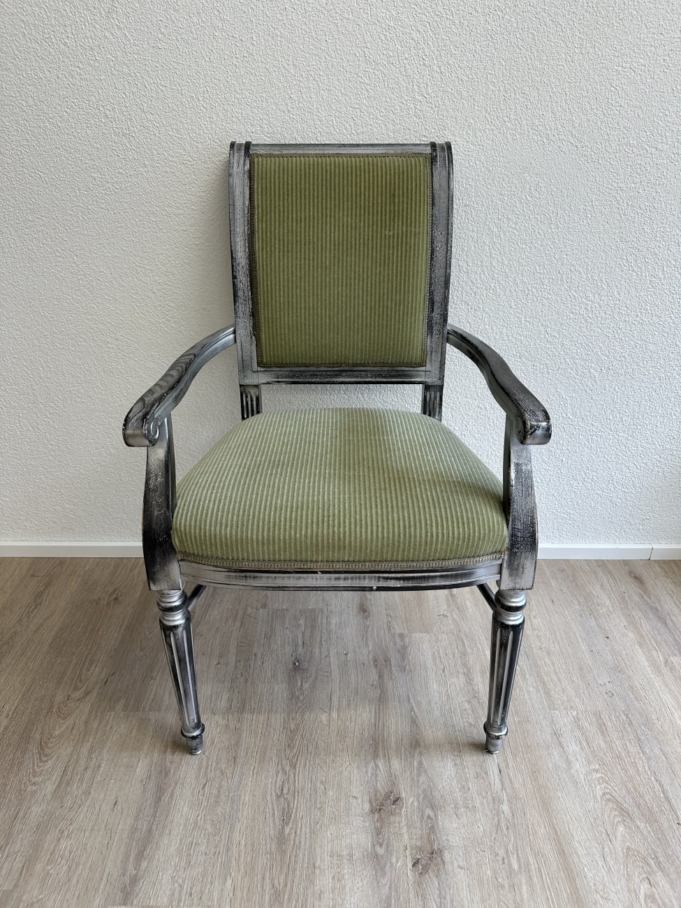 Geschwungene Armlehnen, gedrechselte Vorderbeine und eine leicht geneigte Rückenlehne geben diesem Vintage Armlehnstuhl im Empire Stil eine elegante und ruhige Ausstrahlung. Die Form orientiert sich an klassischen Möbelentwürfen mit klaren Linien und dekorativen Details. Massives Holz bildet die stabile Basis, während Sitzfläche und Rücken mit einem grün gestreiften Stoff gepolstert sind. Die Kombination aus dem silbrig patinierten Holzrahmen und dem warmen Stoffton sorgt für eine charaktervolle, wohnliche Wirkung.