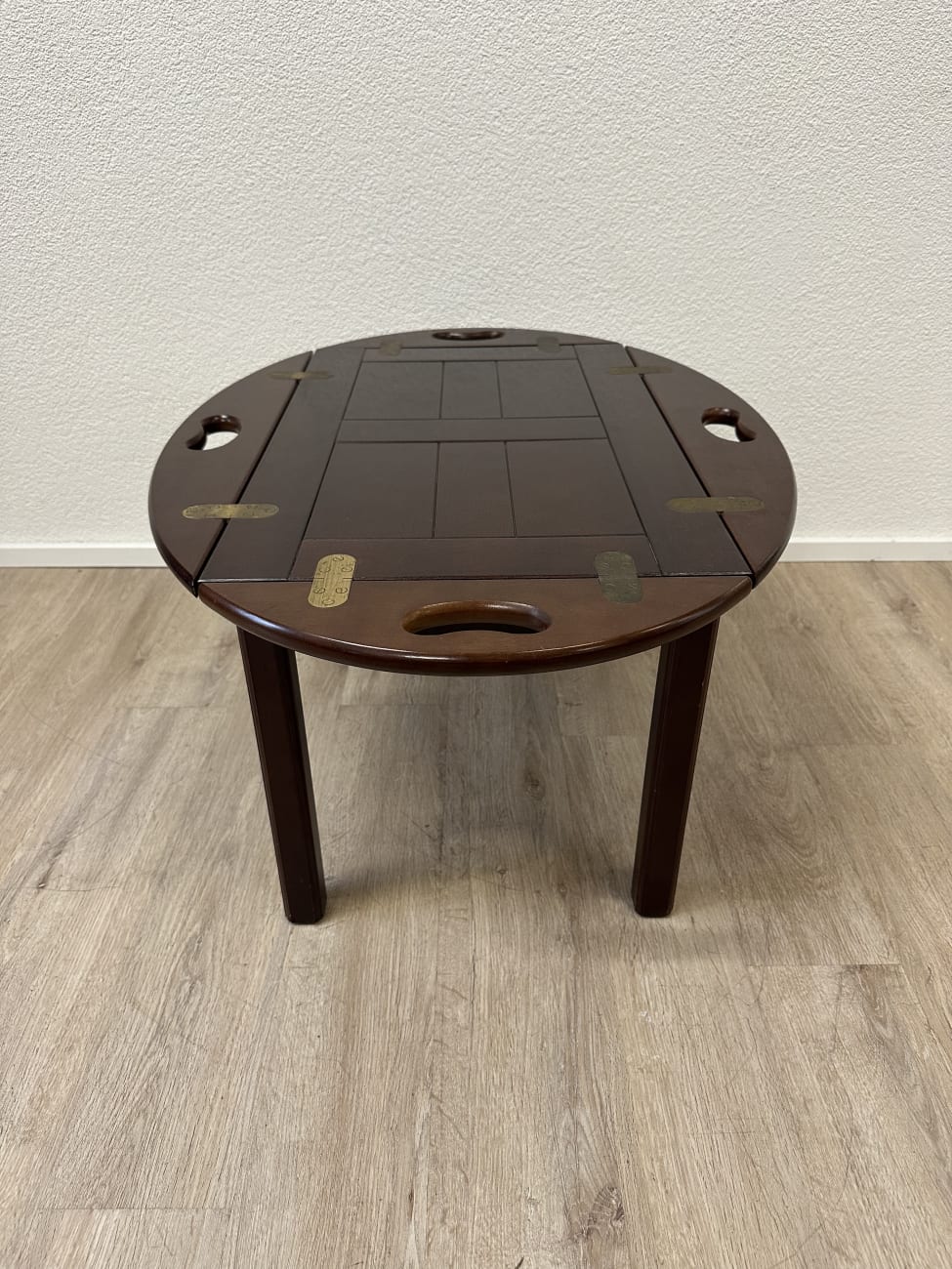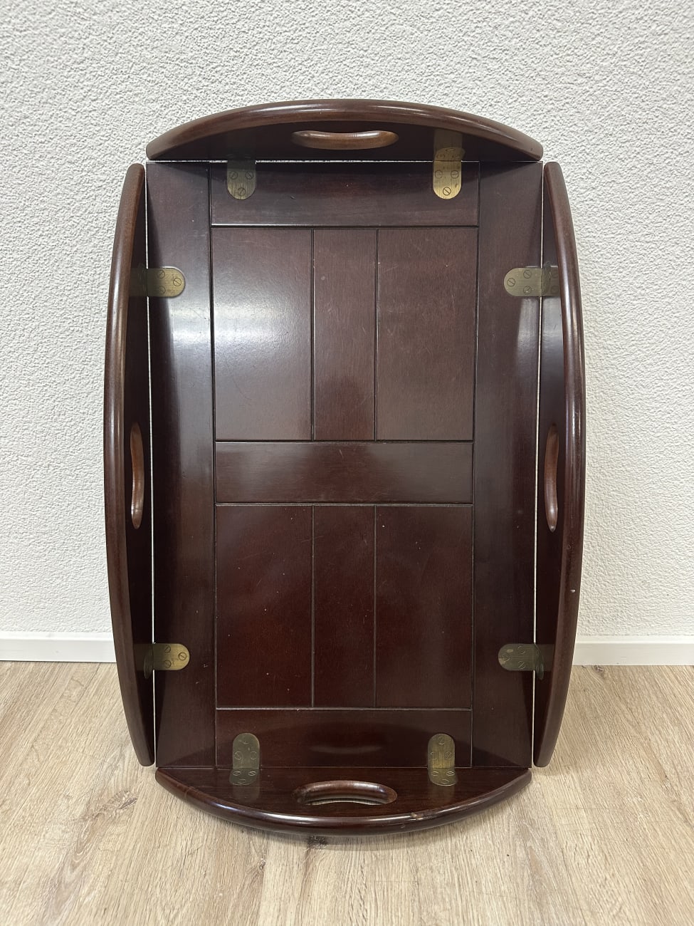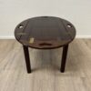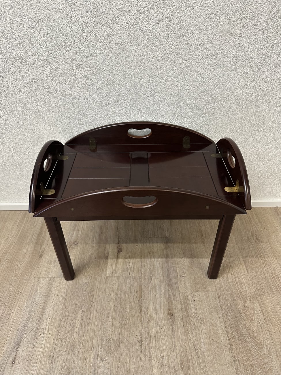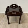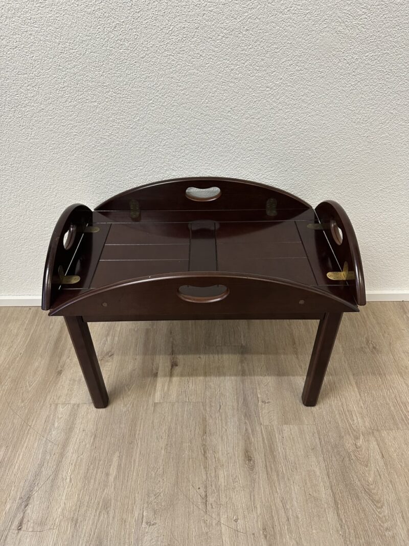 Dunkelbraun gebeiztes Holz mit ruhiger Maserung und sauber verarbeiteten Kanten. Dieser Butlertisch zeigt die typische englische Bauweise mit abnehmbarem Tablett und festem Untergestell. Die Seiten lassen sich aufklappen und erweitern die Fläche, während die integrierten Grifföffnungen das Tragen erleichtern. Messingbeschläge sind sauber eingelassen und sorgen für stabile Verbindungen. Kompakt gebaut, praktisch im Alltag und schnell einsatzbereit.