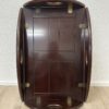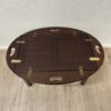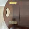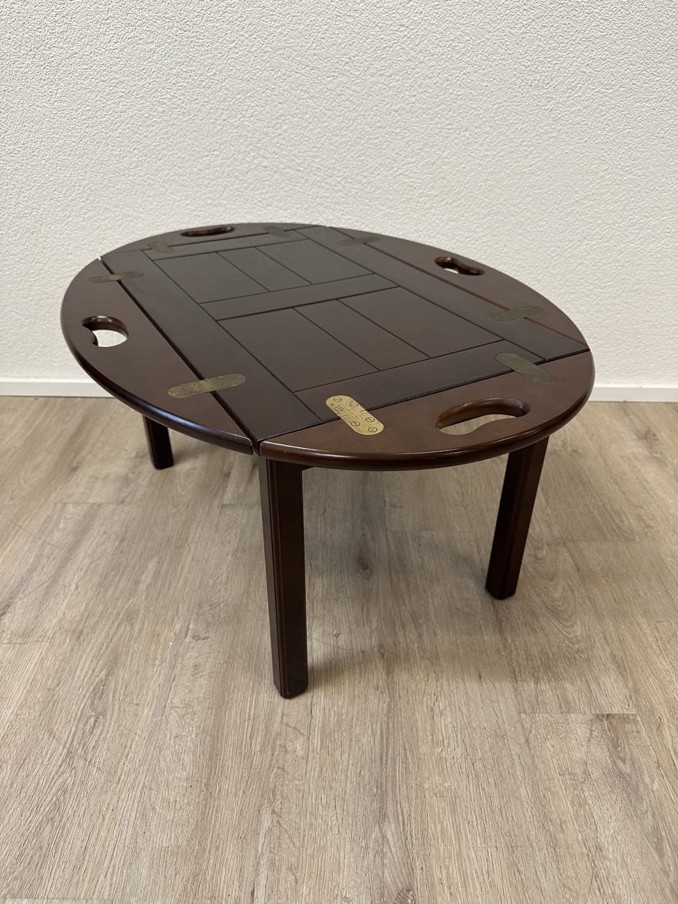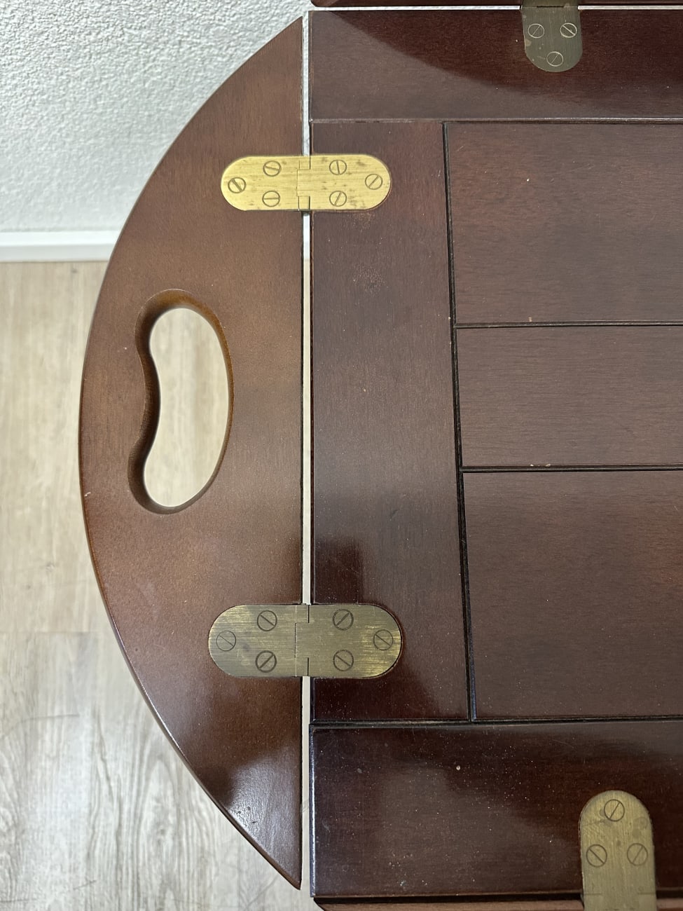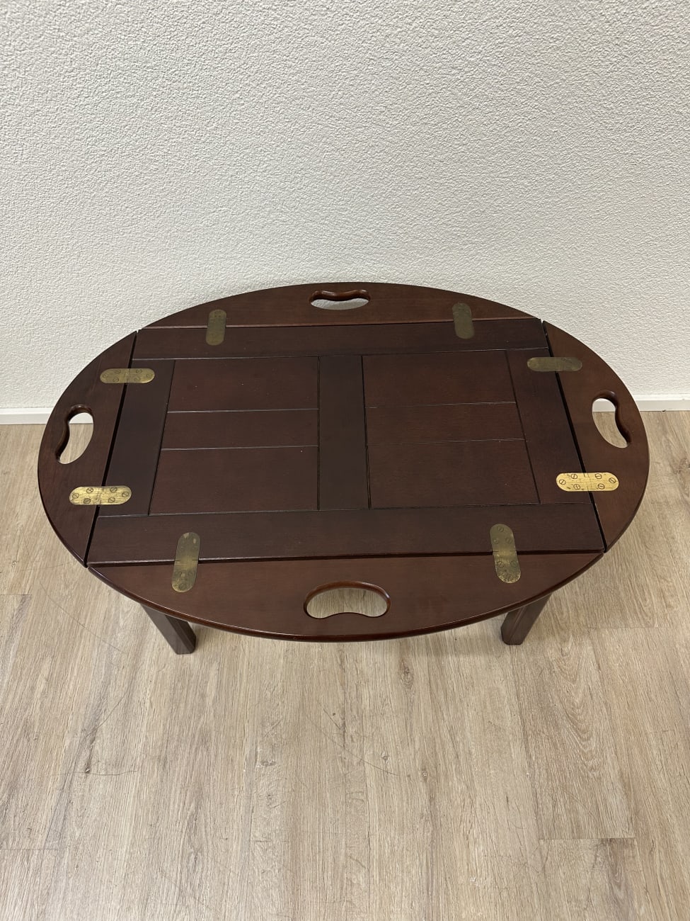 Dunkelbraun gebeiztes Holz mit ruhiger Maserung und sauber verarbeiteten Kanten. Dieser Butlertisch zeigt die typische englische Bauweise mit abnehmbarem Tablett und festem Untergestell. Die Seiten lassen sich aufklappen und erweitern die Fläche, während die integrierten Grifföffnungen das Tragen erleichtern. Messingbeschläge sind sauber eingelassen und sorgen für stabile Verbindungen. Kompakt gebaut, praktisch im Alltag und schnell einsatzbereit.