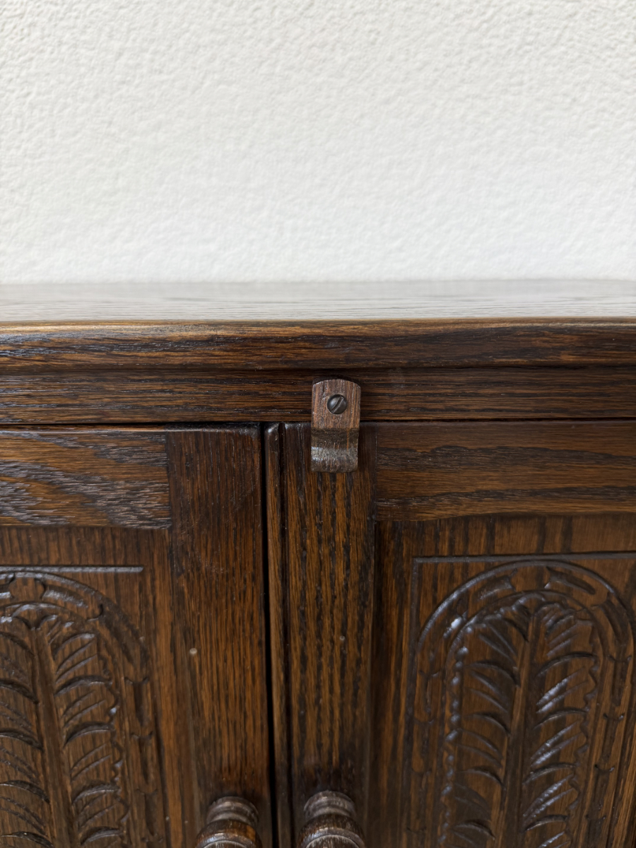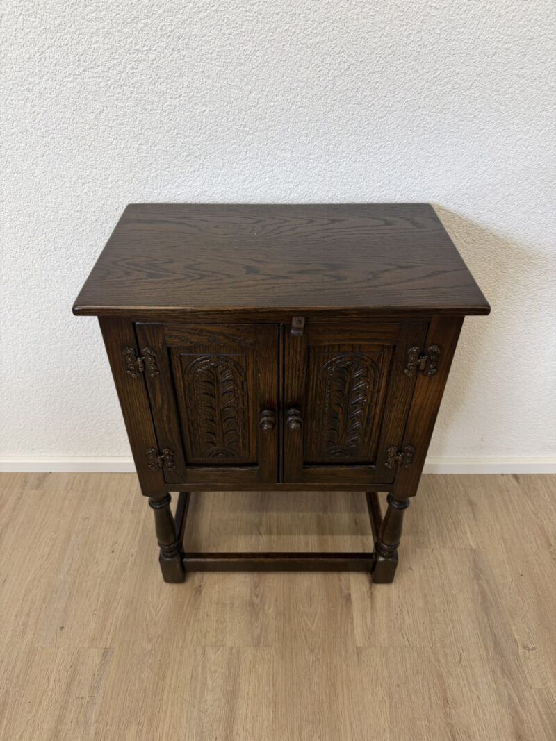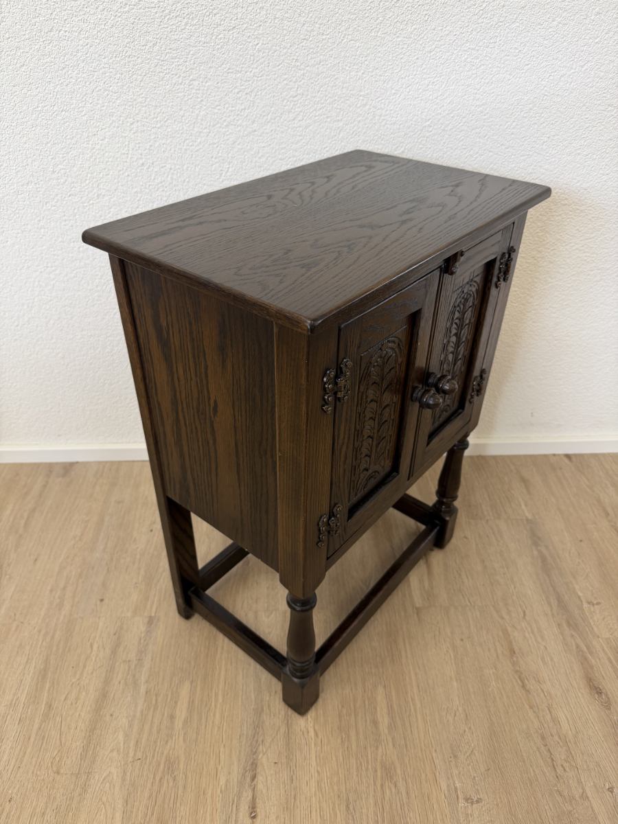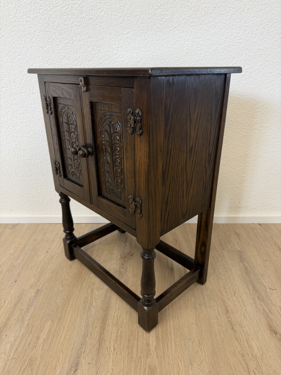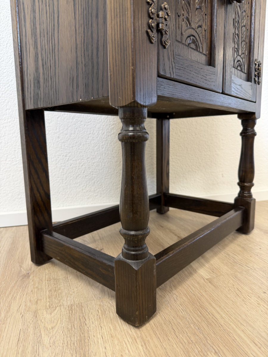 Dunkler Eicheton und dekorative Details mit handwerklichem Charakter. Dieses kompakte Beistellschränkchen stammt aus englischer Fertigung und wurde von Jaycee Furniture (Brighton) Limited produziert, wie das originale Qualitätslabel im Inneren belegt. Die Fronttüren sind mit geschnitzten Blattmotiven versehen, ergänzt durch klassische Metallbeschläge und gedrechselte Beine. Ein Möbelstück, das bewusst traditionell gestaltet ist und sich klar an historischen Vorbildern orientiert, jedoch aus der Vintage-Zeit stammt.