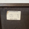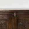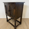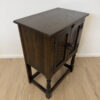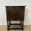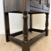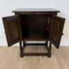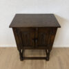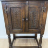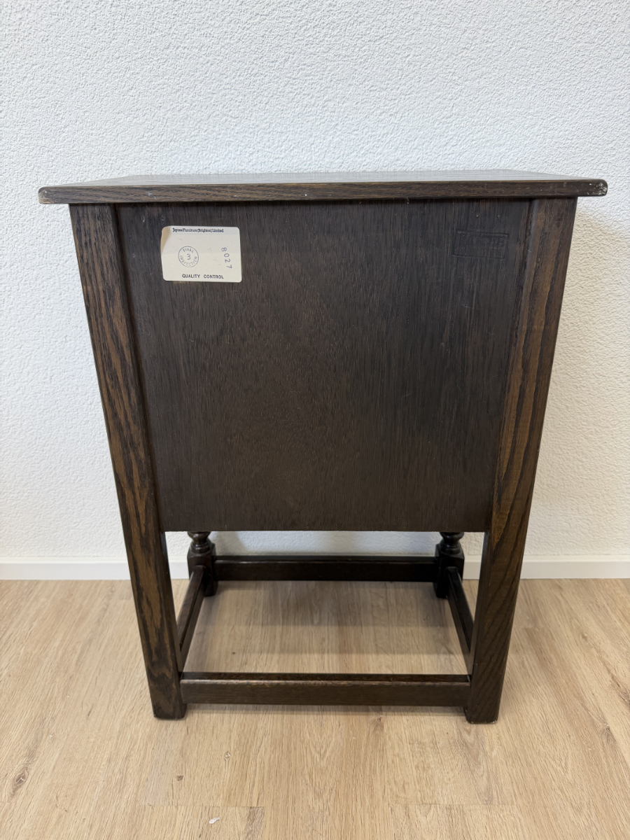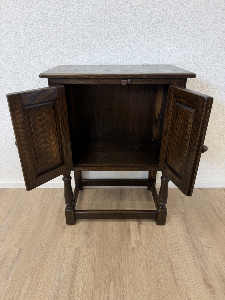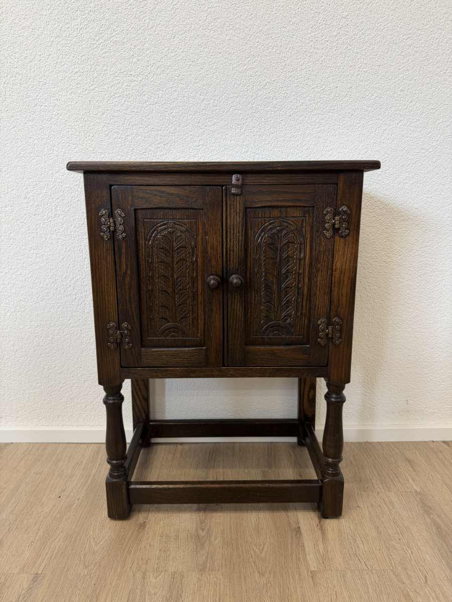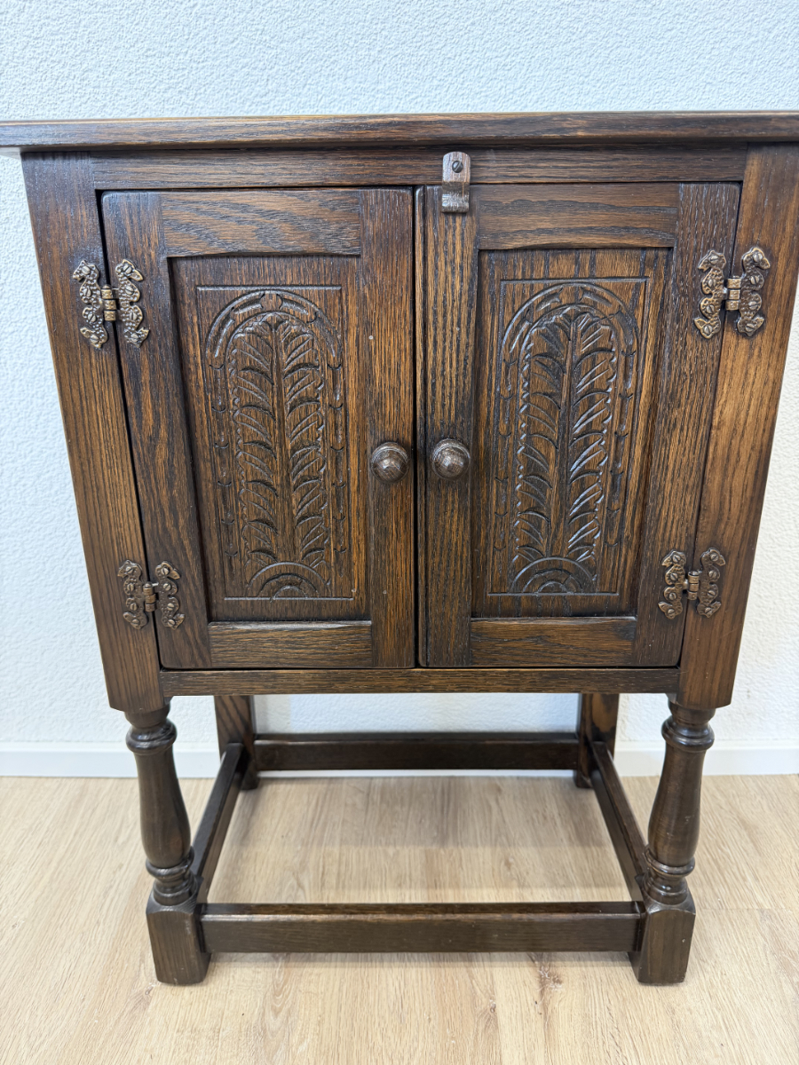 Dunkler Eicheton und dekorative Details mit handwerklichem Charakter. Dieses kompakte Beistellschränkchen stammt aus englischer Fertigung und wurde von Jaycee Furniture (Brighton) Limited produziert, wie das originale Qualitätslabel im Inneren belegt. Die Fronttüren sind mit geschnitzten Blattmotiven versehen, ergänzt durch klassische Metallbeschläge und gedrechselte Beine. Ein Möbelstück, das bewusst traditionell gestaltet ist und sich klar an historischen Vorbildern orientiert, jedoch aus der Vintage-Zeit stammt.