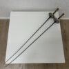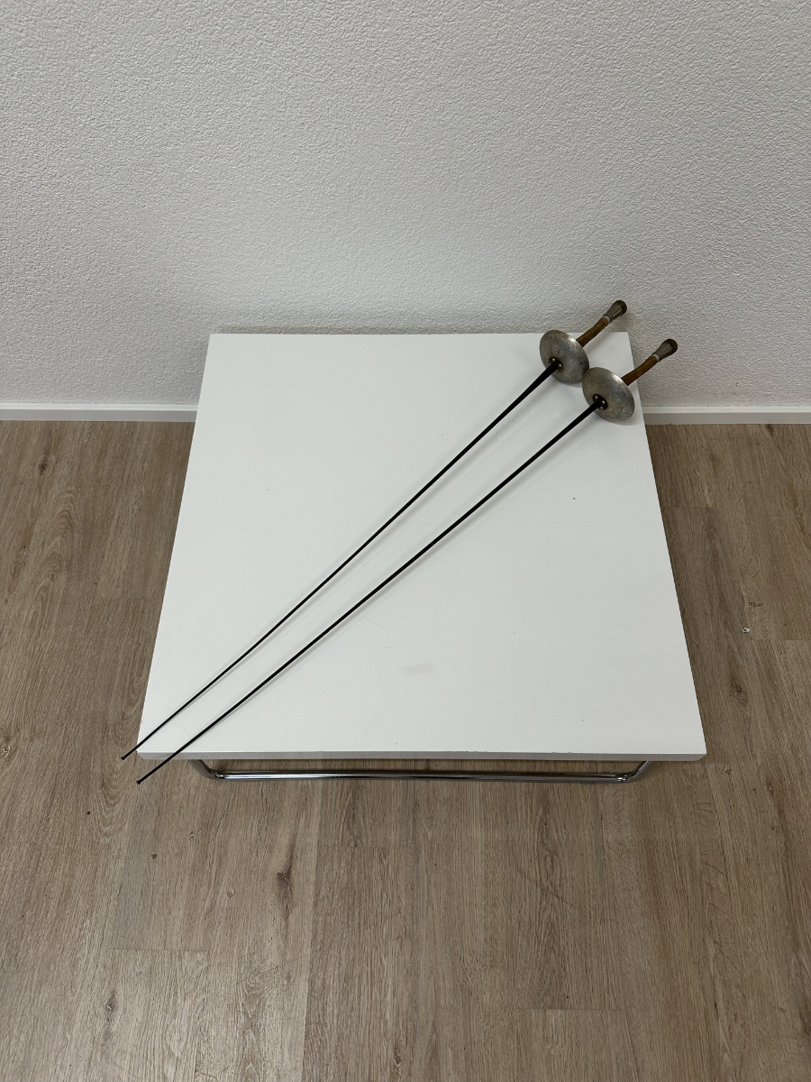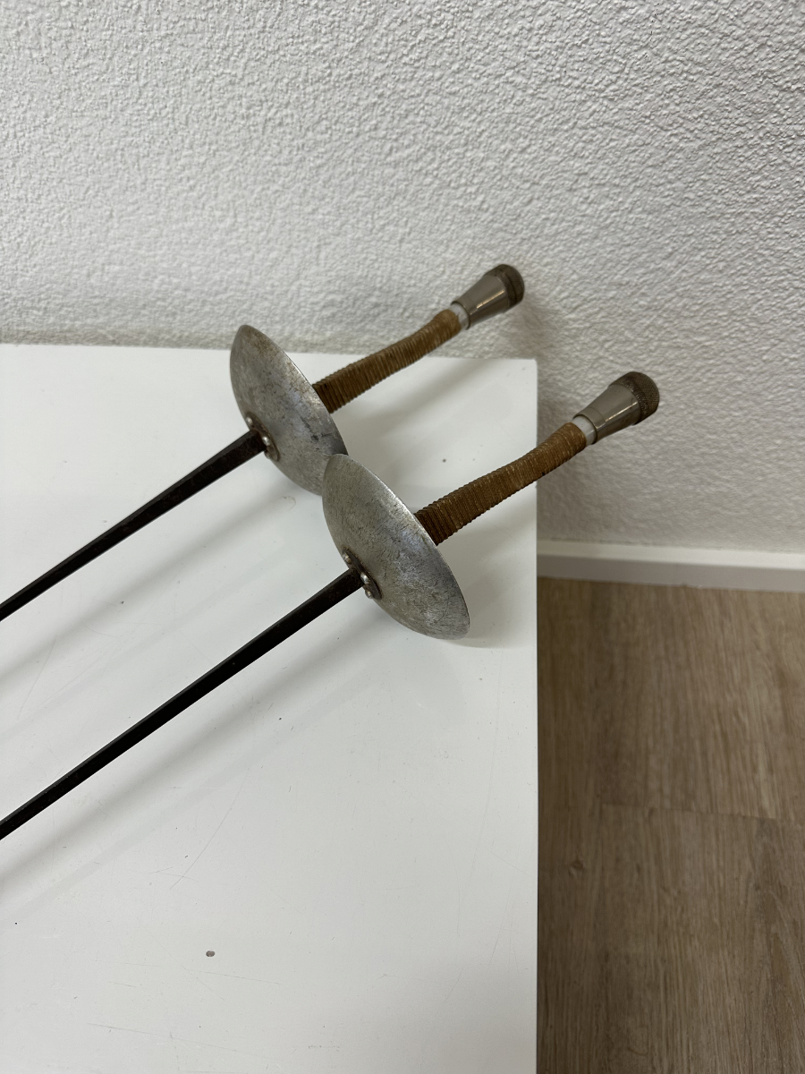 Zwei Fechtdegen als Set, die sofort nach Sportgeschichte aussehen. Lange, schlanke Klingen, dazu die typischen Metallglocken und Griffe mit Wicklung, die gut in der Hand liegen. Auf den Glocken ist die Prägung Léon Paul zu sehen. Genau das Richtige als Deko in einer Bar, im Schaufenster, im Atelier oder als Requisite.