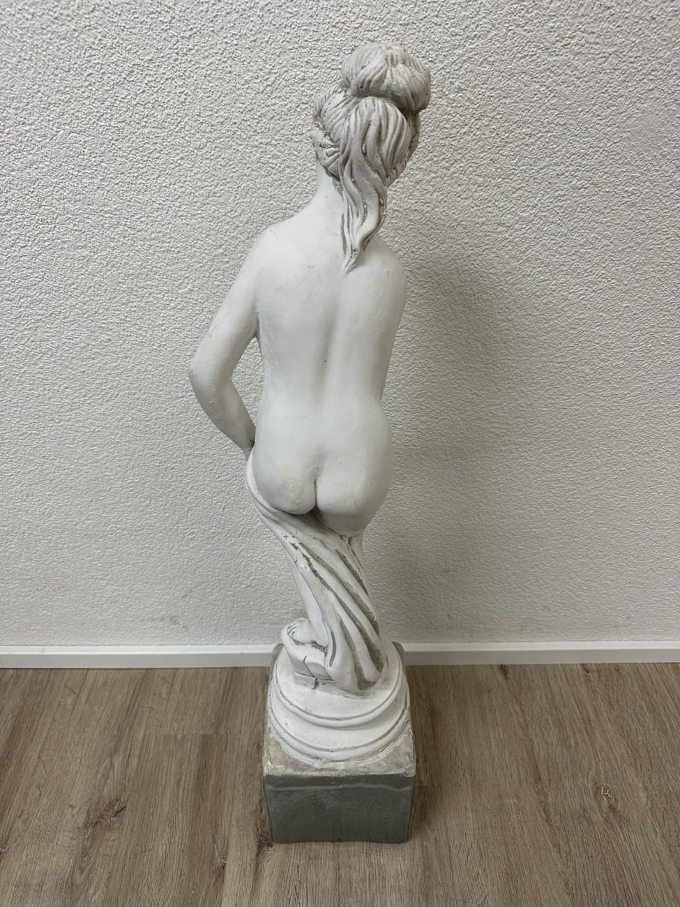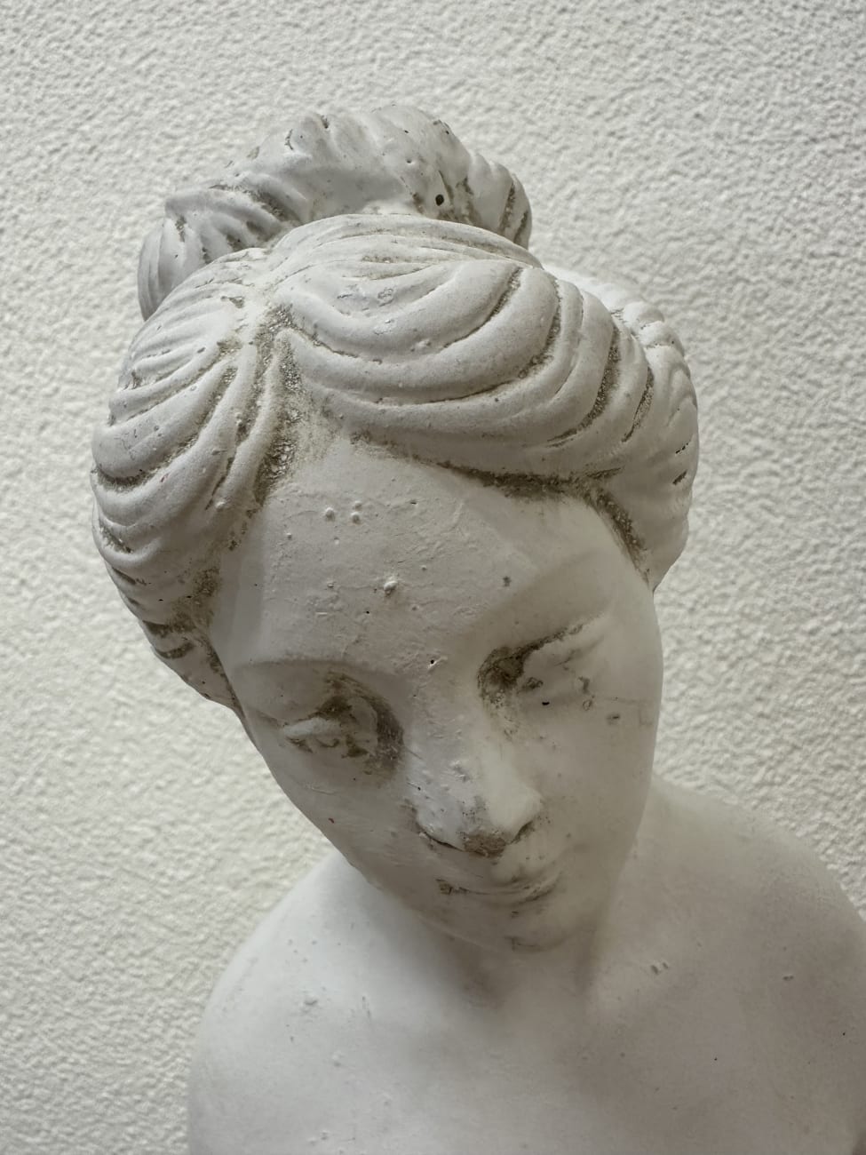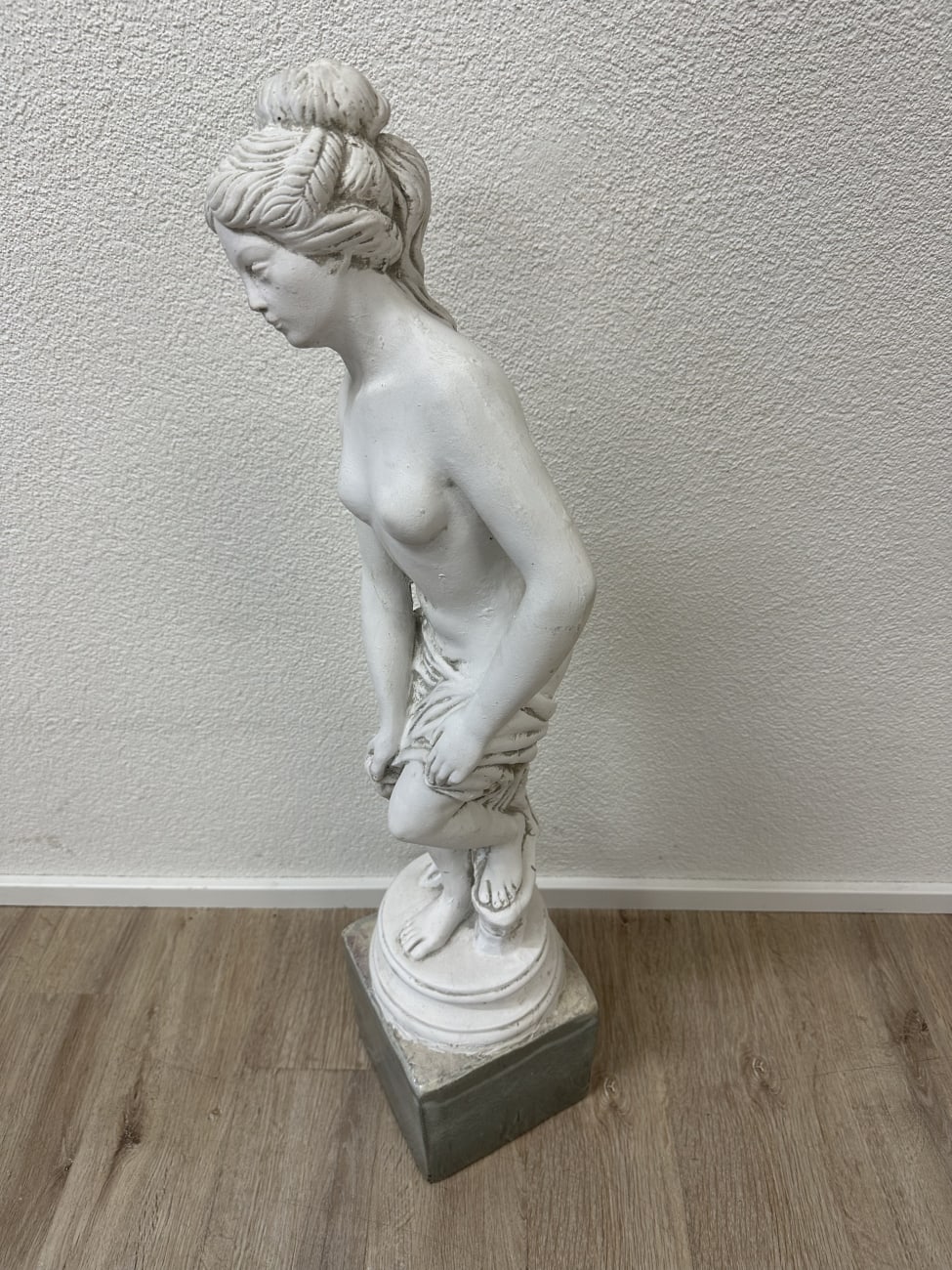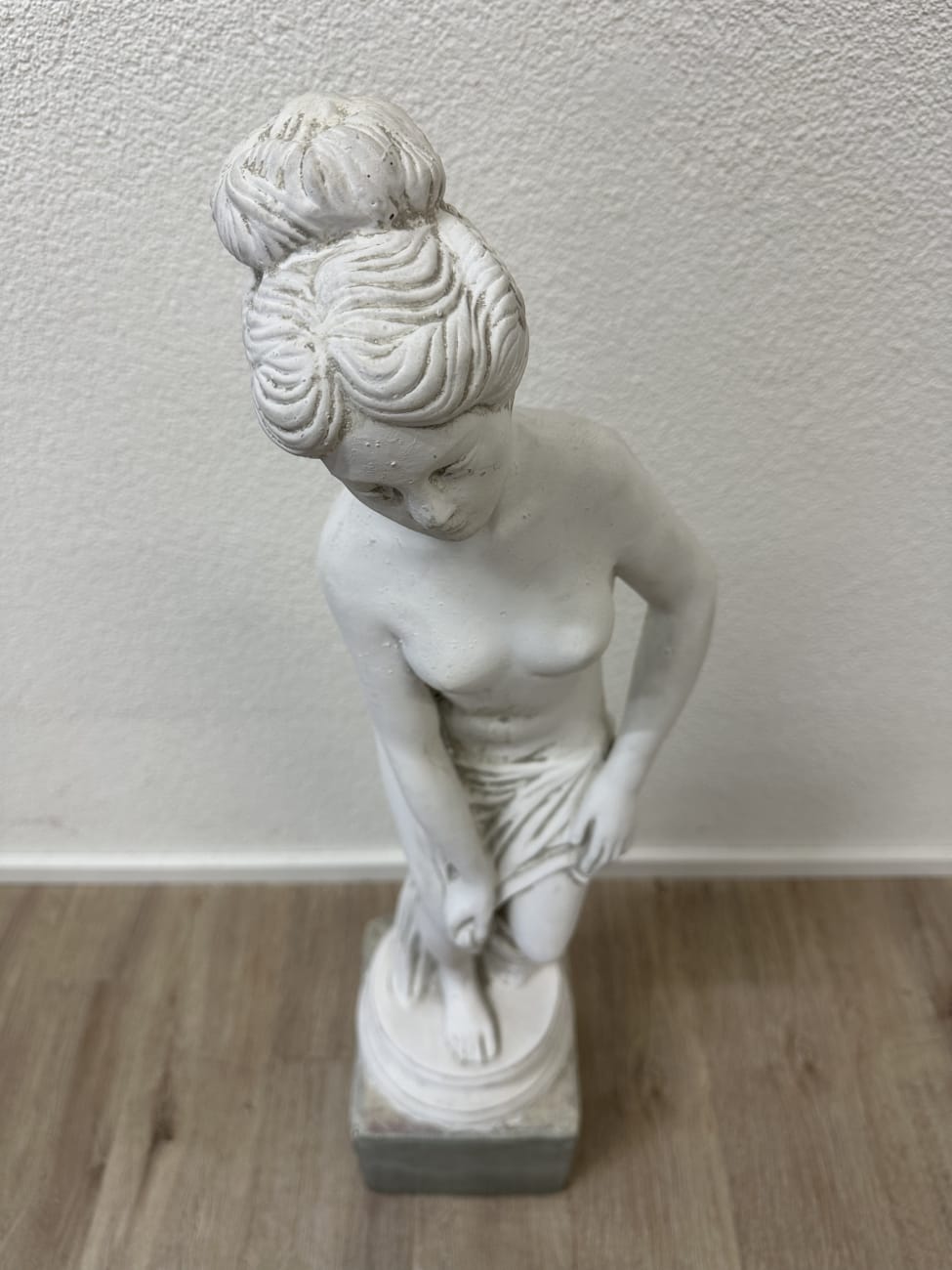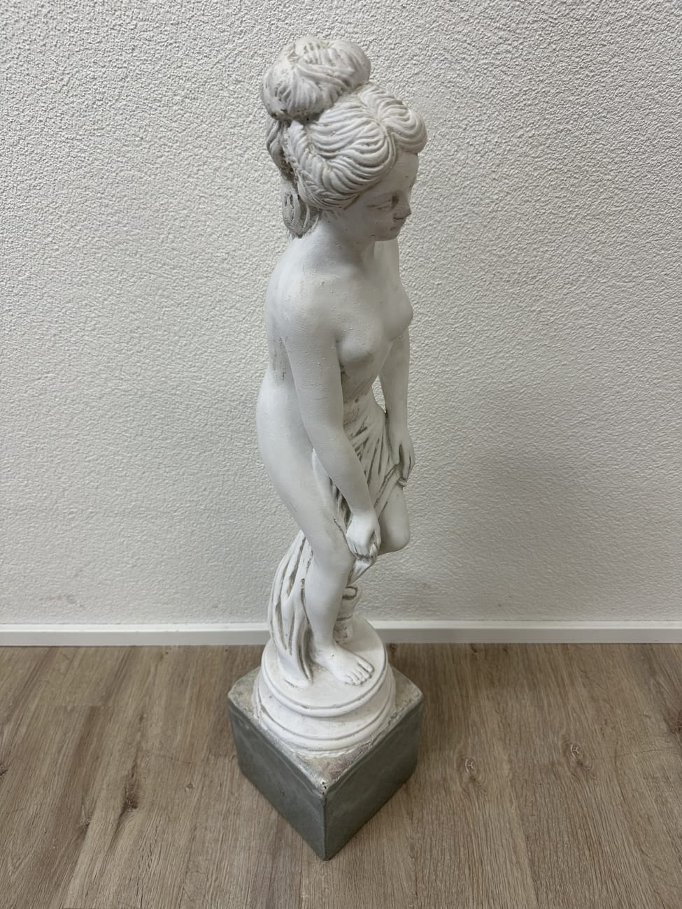 Sanfte Gesichtszüge, feine Linien und eine leicht bewegte Haltung geben dieser Figur etwas sehr Ruhiges. Die weisse Oberfläche wirkt klar und schlicht, der dunklere Sockel setzt einen deutlichen Kontrast. Haare mit sichtbaren Wellen und Dutt sind sorgfältig modelliert und ziehen den Blick sofort an. Falten im Kleid sind nur angedeutet und lassen die Figur trotzdem lebendig wirken. Vermutlich stammt die Skulptur aus der zweiten Hälfte des 20. Jahrhunderts und passt gut zu klassischer oder ruhiger Einrichtung.
