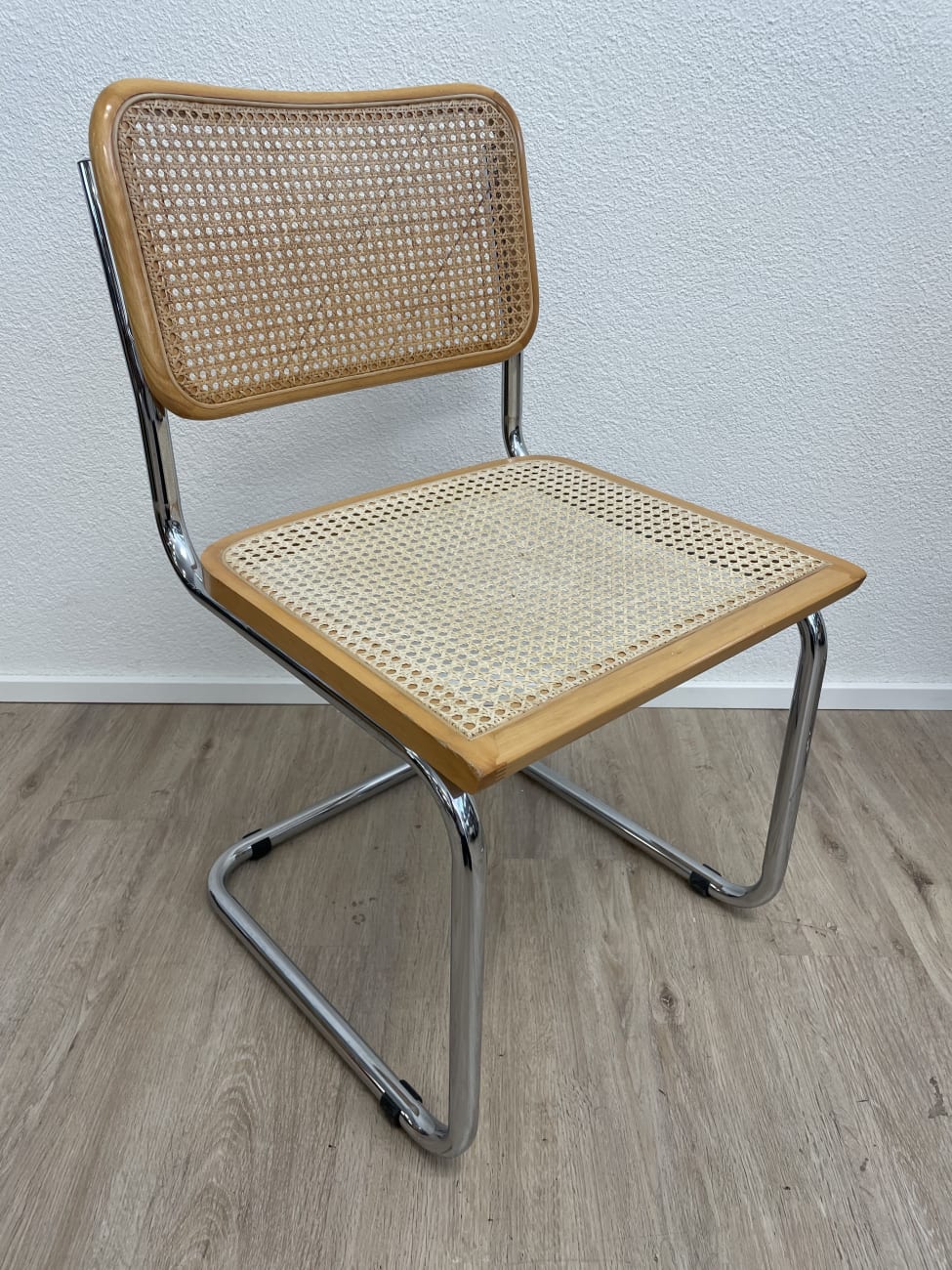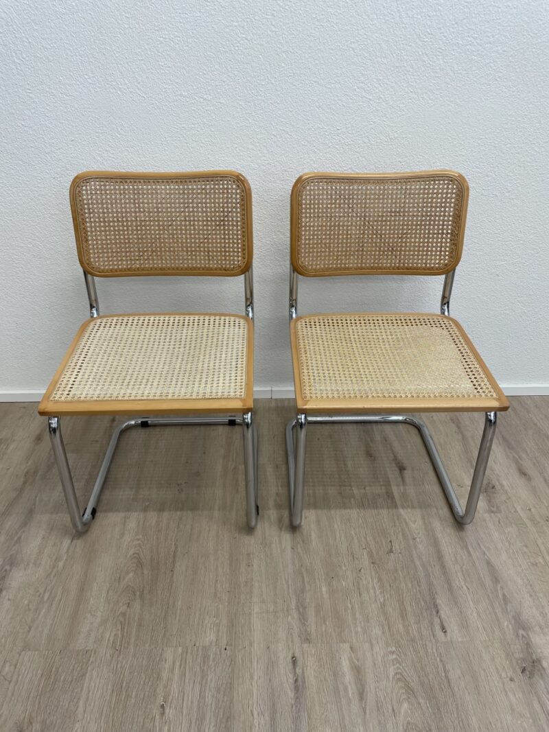 Helles Holz trifft auf feines Wiener Geflecht und ein schlicht gebogenes Gestell aus Chromstahl. Die Sitzflächen geben leicht nach und sorgen für angenehmen Sitzkomfort. Durch die offene Flechtung wirken die Stühle leicht und luftig im Raum. Holz und Metall ergänzen sich ruhig und stimmig. Gefertigt in Italien, sauber verarbeitet und vielseitig einsetzbar.