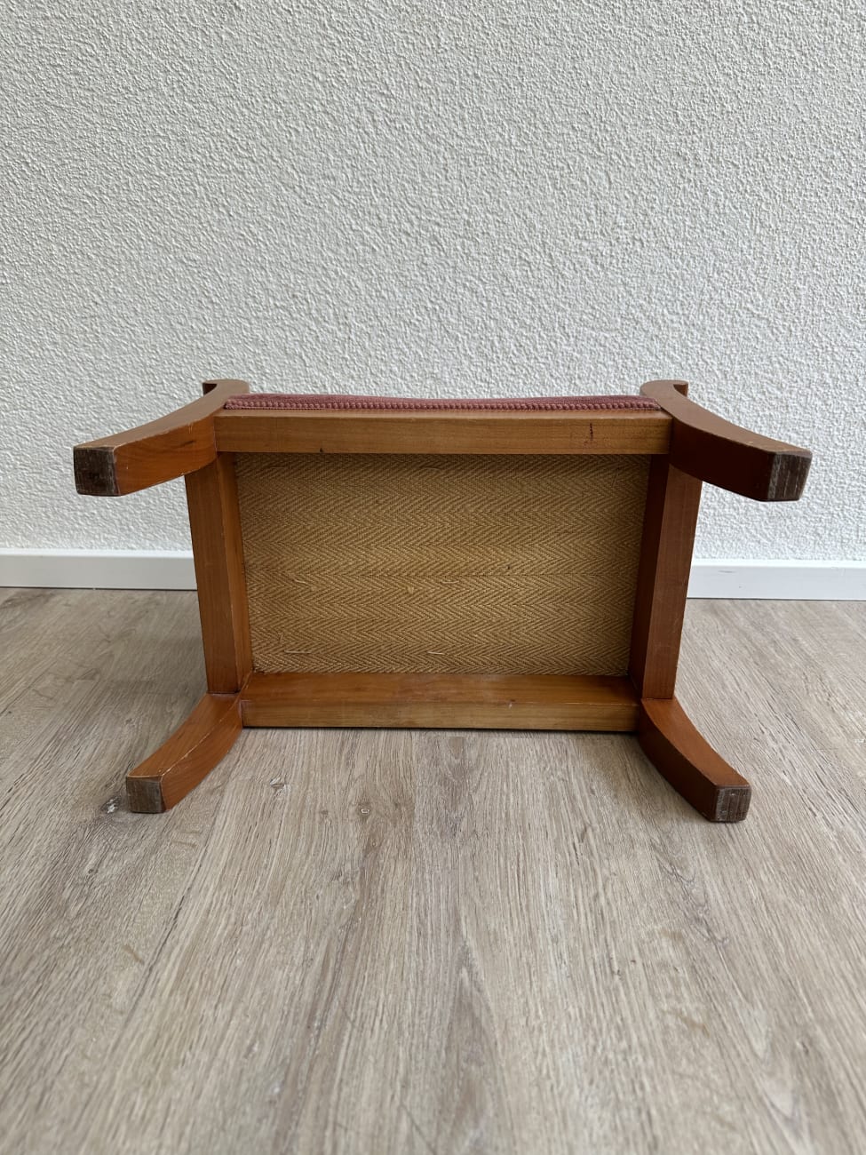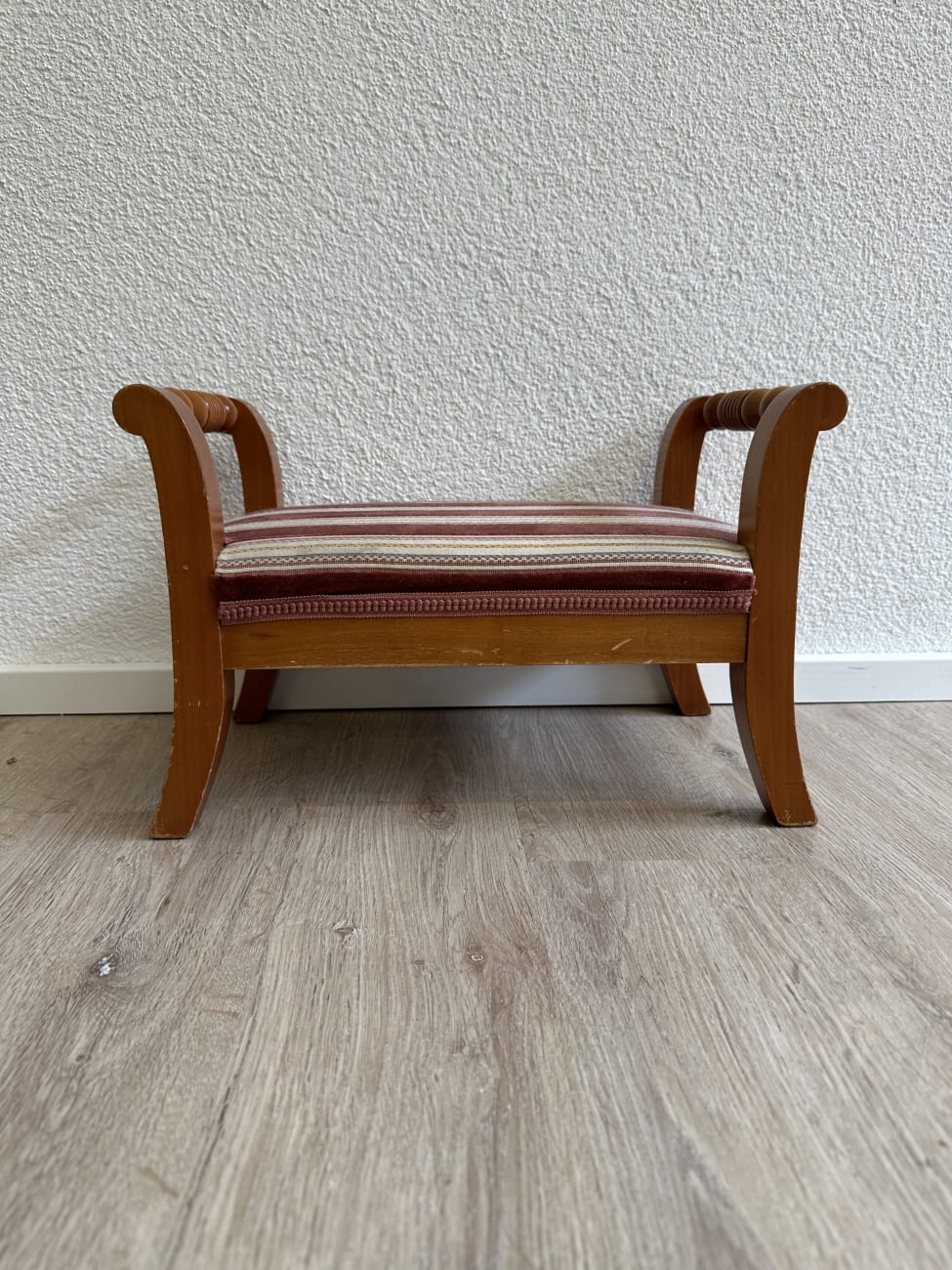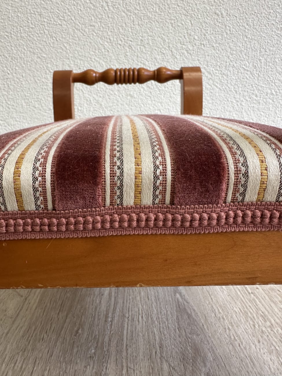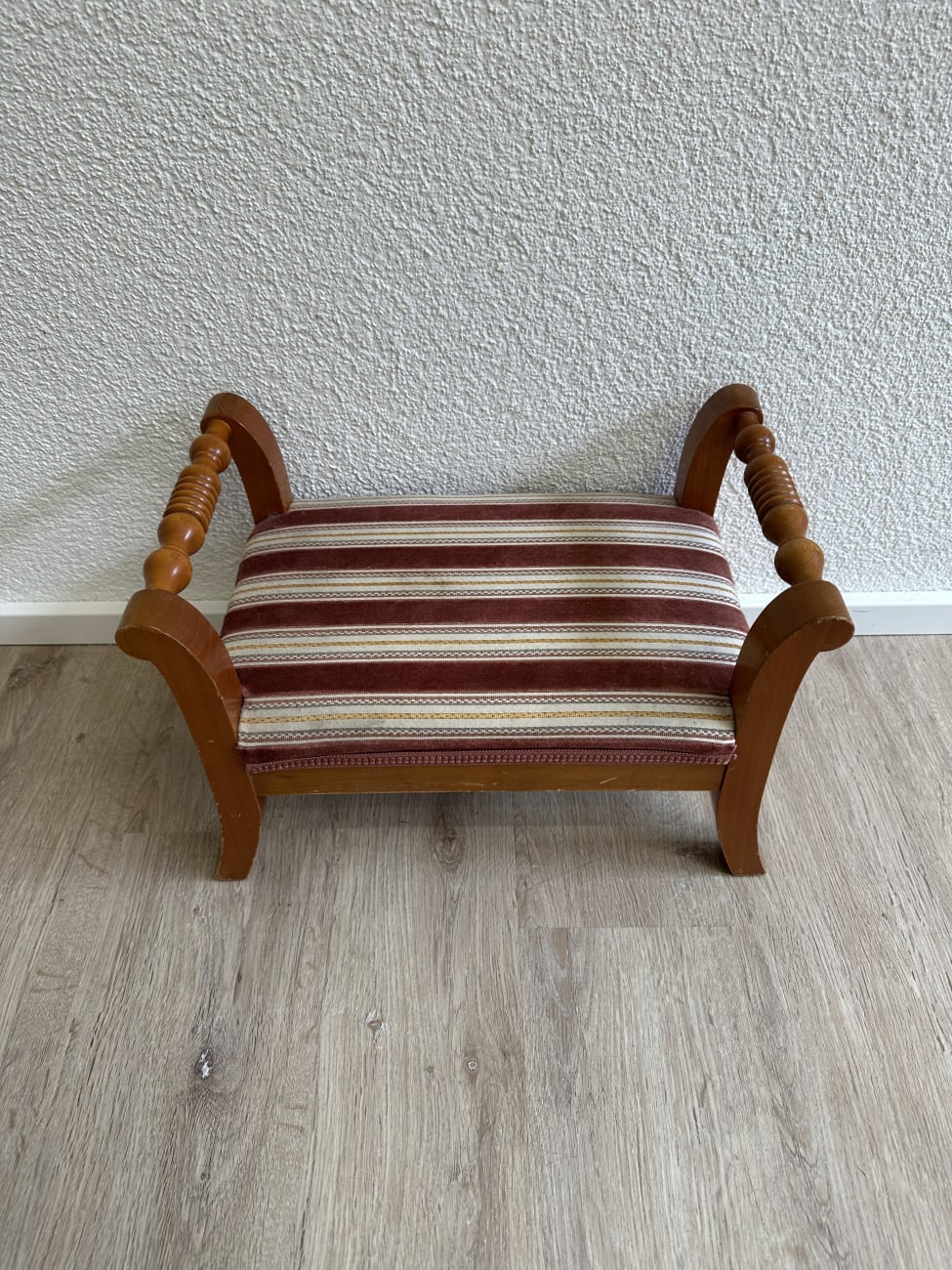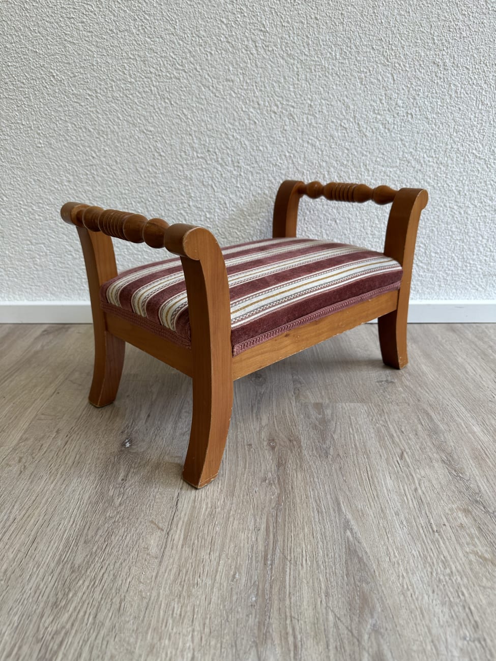 Vintage Fussbank aus Holz mit gestreiftem Polster