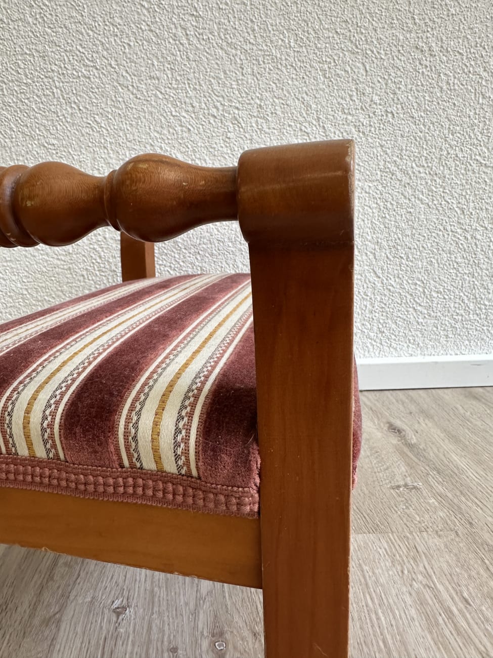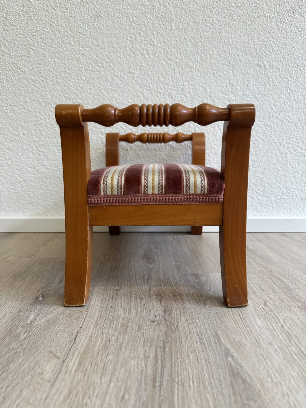 Warme Holzfarbe, gedrechselte Querstreben und ein weich gepolsterter Sitz machen diese kleine Fussbank zu einem charmanten Möbelstück mit wohnlicher Ausstrahlung. Die Form erinnert an klassische Sitzbänke und Hocker aus der Zeit zwischen den 1970er und 1980er Jahren. Geschwungene Seitenteile aus Holz sorgen für eine stabile Konstruktion, während der gepolsterte Sitz mit gestreiftem Stoff in Rot-, Beige- und Goldtönen einen dekorativen Akzent setzt.