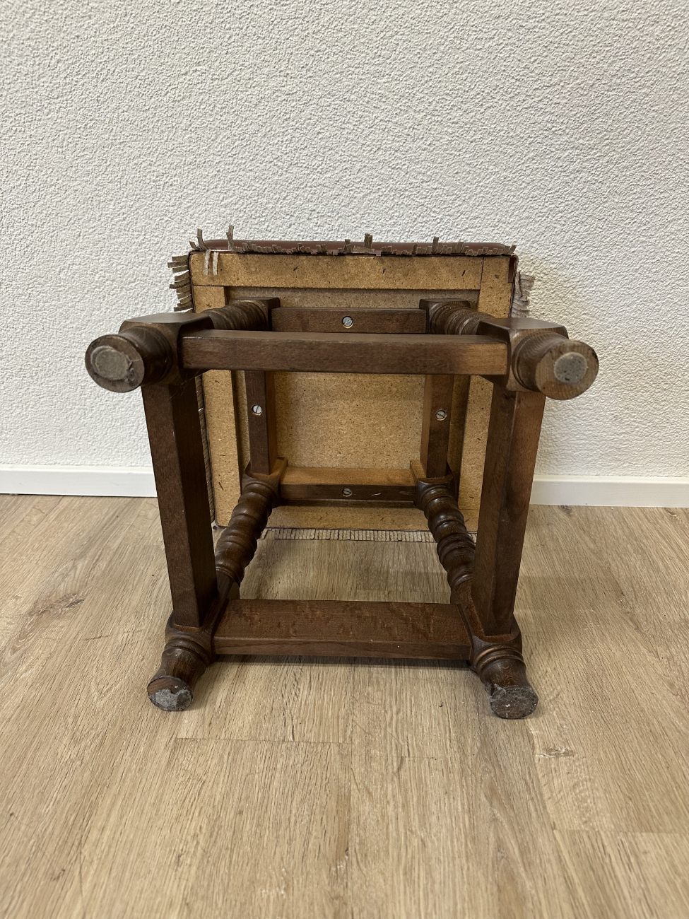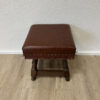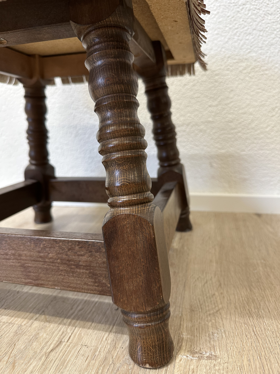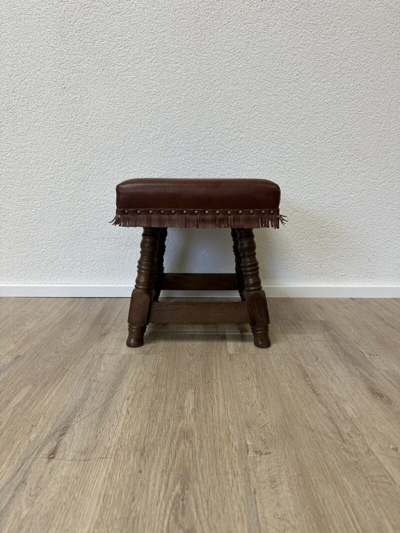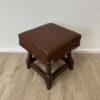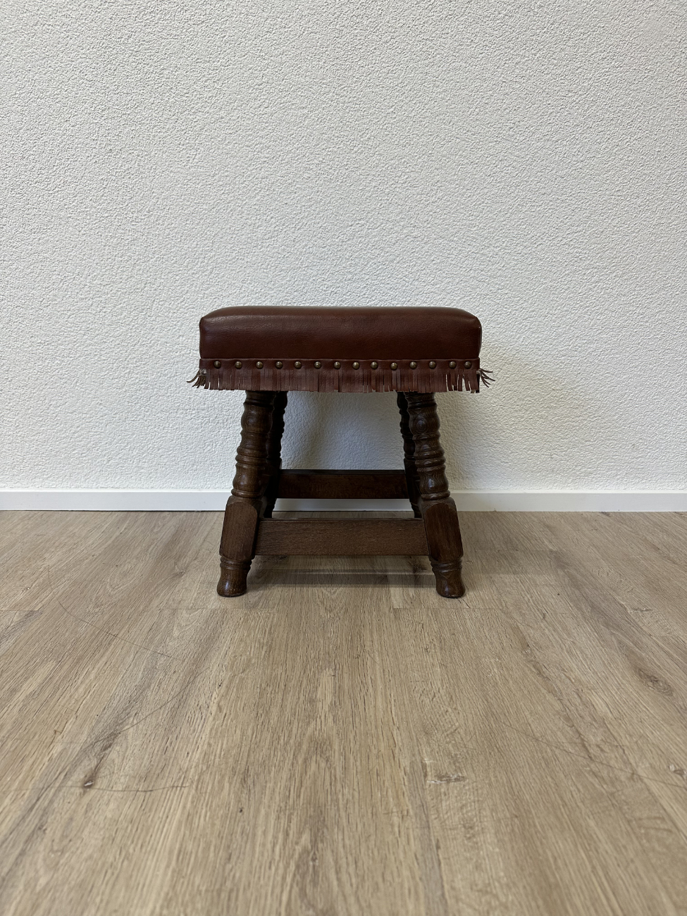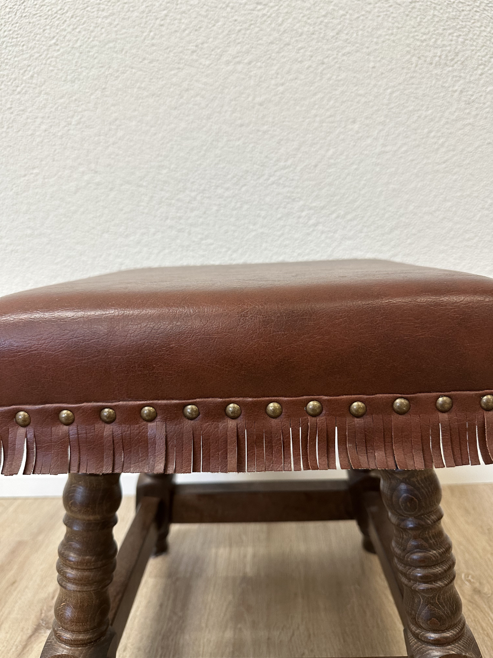 Vintage Hocker aus Holz mit Lederbezug, Ziernägeln und Fransen