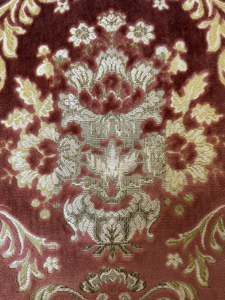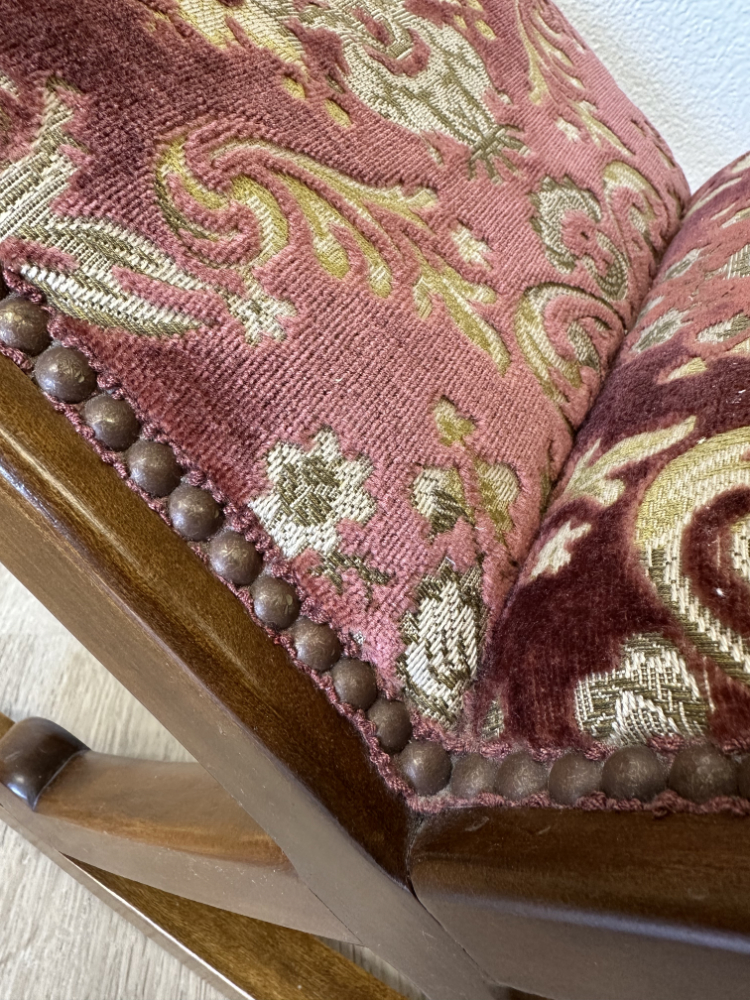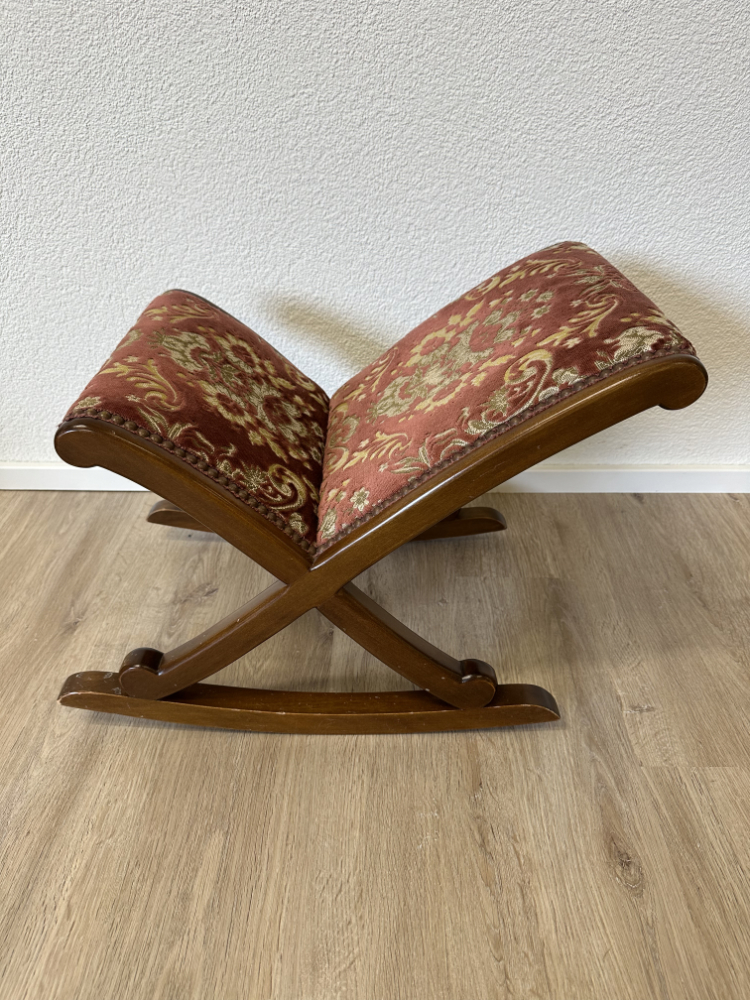 Formschöner Vintage Fussschaukler in traditioneller Ausführung mit gekreuztem Holzgestell und sanft schwingender Sitzfläche. Das Gestell ist aus massivem Holz gefertigt und warm gebeizt, die Linien verlaufen harmonisch und ausgewogen. Sitz- und Rückenfläche sind gepolstert und mit einem Brokat-Stoff in Bordeauxrot mit floralen Ornamenten bezogen. Entlang der Kanten sorgen gleichmässig gesetzte Ziernägel für einen klassischen Akzent. Die niedrige Bauweise macht den Fussschaukler vielseitig einsetzbar, als Fussablage, zusätzlicher Sitz oder entspannendes Schaukelmöbel.