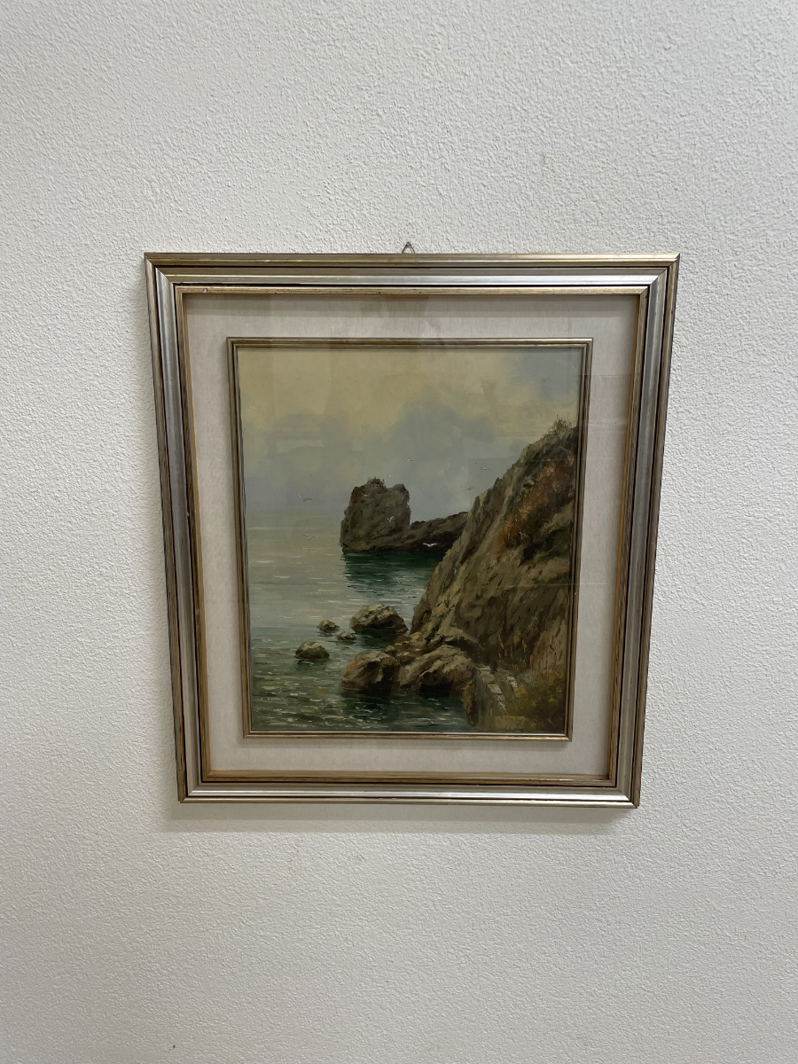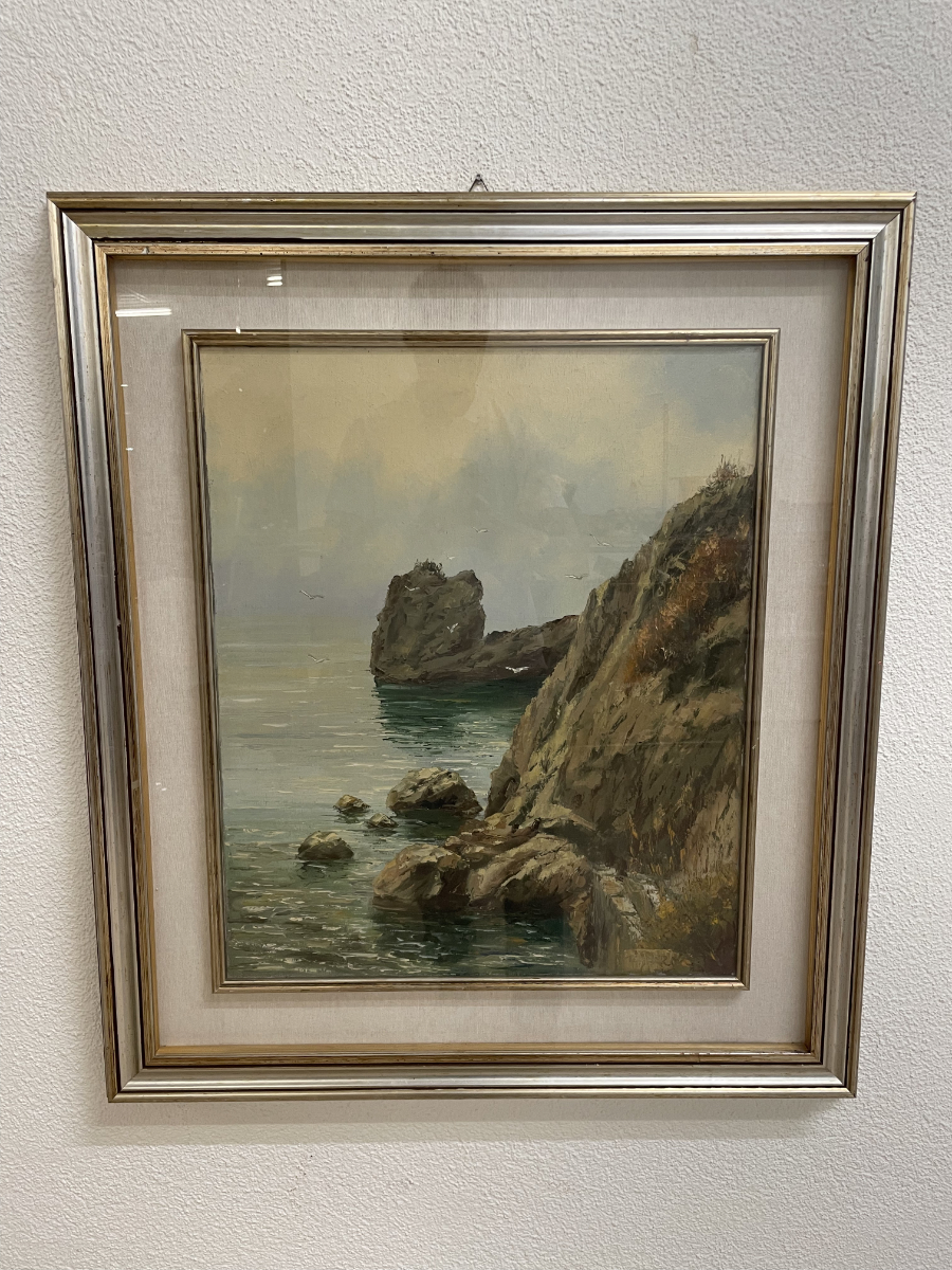 Salzige Luft, ruhiges Wasser und schroffe Felsen im Vordergrund. Dieses handgemalte Küstenbild zeigt eine felsige Bucht mit Möwen am Himmel, gemalt in gedeckten Blau Grün und Sandtönen. Der Künstler ist als Tomber signiert, auf der Rückseite ist die Karte der San Giorgio Galleria d’arte, Portofino mit dem Sujet „Scogliere“ und dem Jahr 1982 vermerkt.
