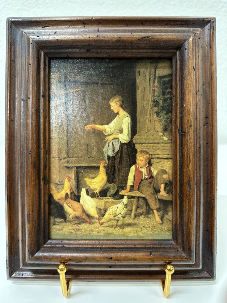 Vintage gerahmtes Wandbild «Mädchen, Hühner fütternd» nach Albert Anker im Buco-Holzrahmen ca. 1960er Jahre