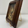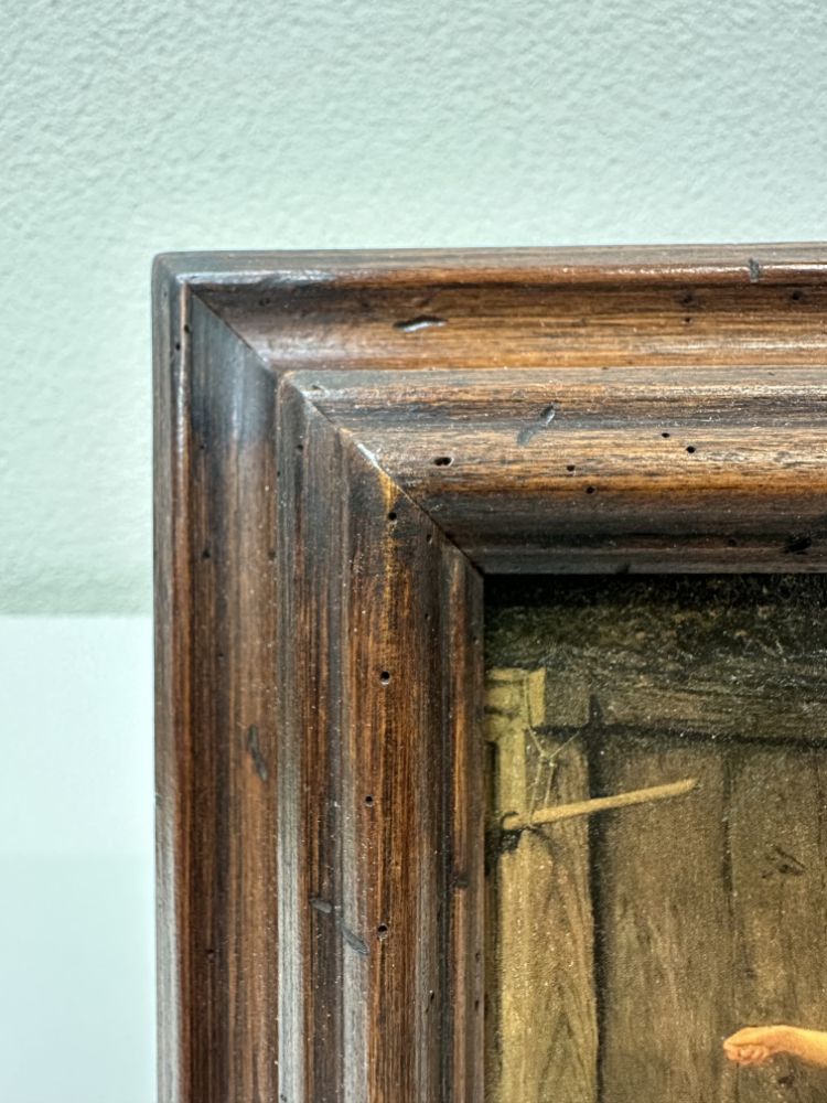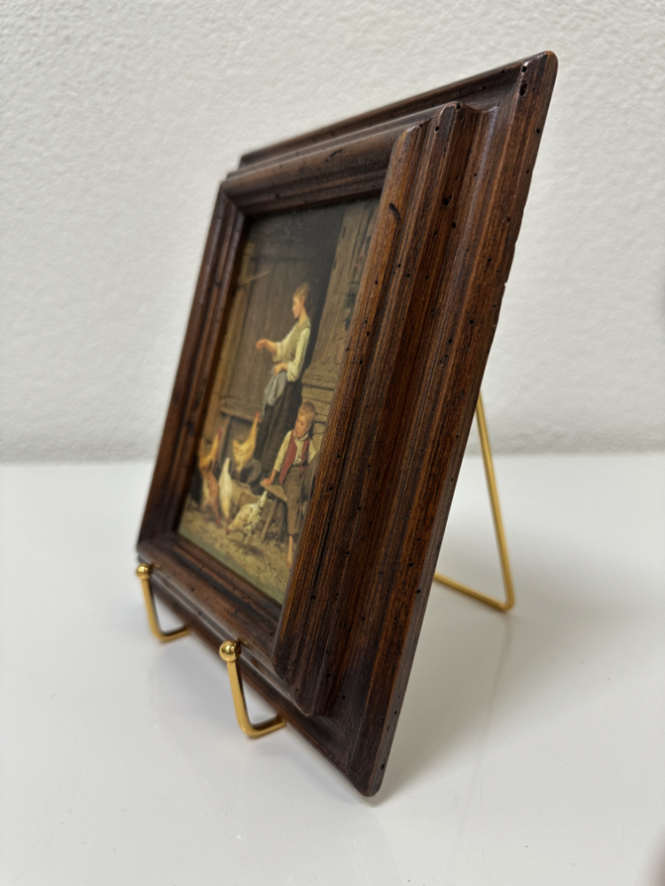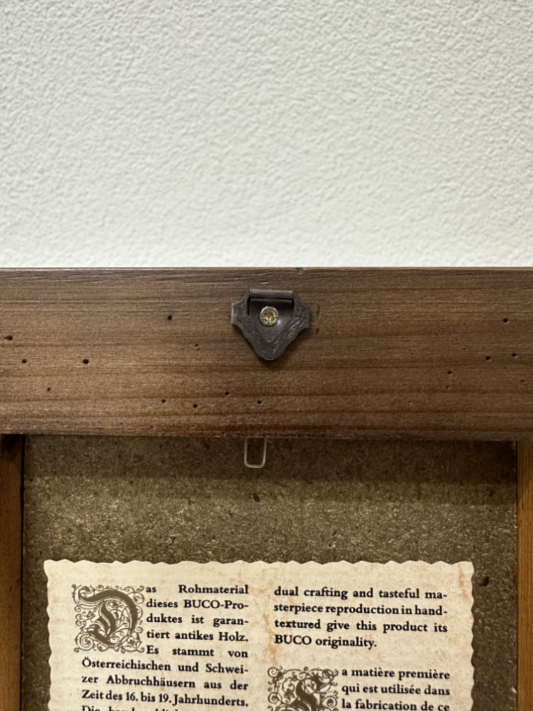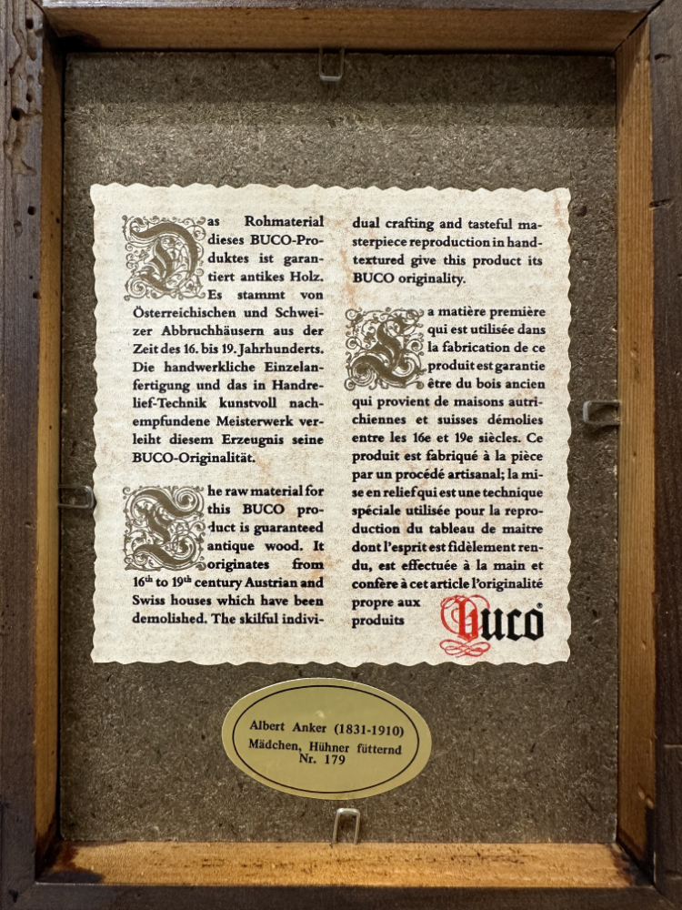 Das Bild ist in einen massiven, dunkel gebeizten Holzrahmen von Buco eingefasst. Die sichtbare Holzstruktur mit kleinen Alters- und Gebrauchsspuren unterstreicht den authentischen Charakter. Auf der Rückseite befinden sich sowohl das originale Buco-Herstelleretikett mit Beschreibung zur Verwendung von antikem Holz als auch das Motivschild Albert Anker «Mädchen, Hühner fütternd, Nr. 179». Diese Kombination macht das Objekt zu einem stimmigen Sammlerstück aus Kunstreproduktion und hochwertiger Rahmung.