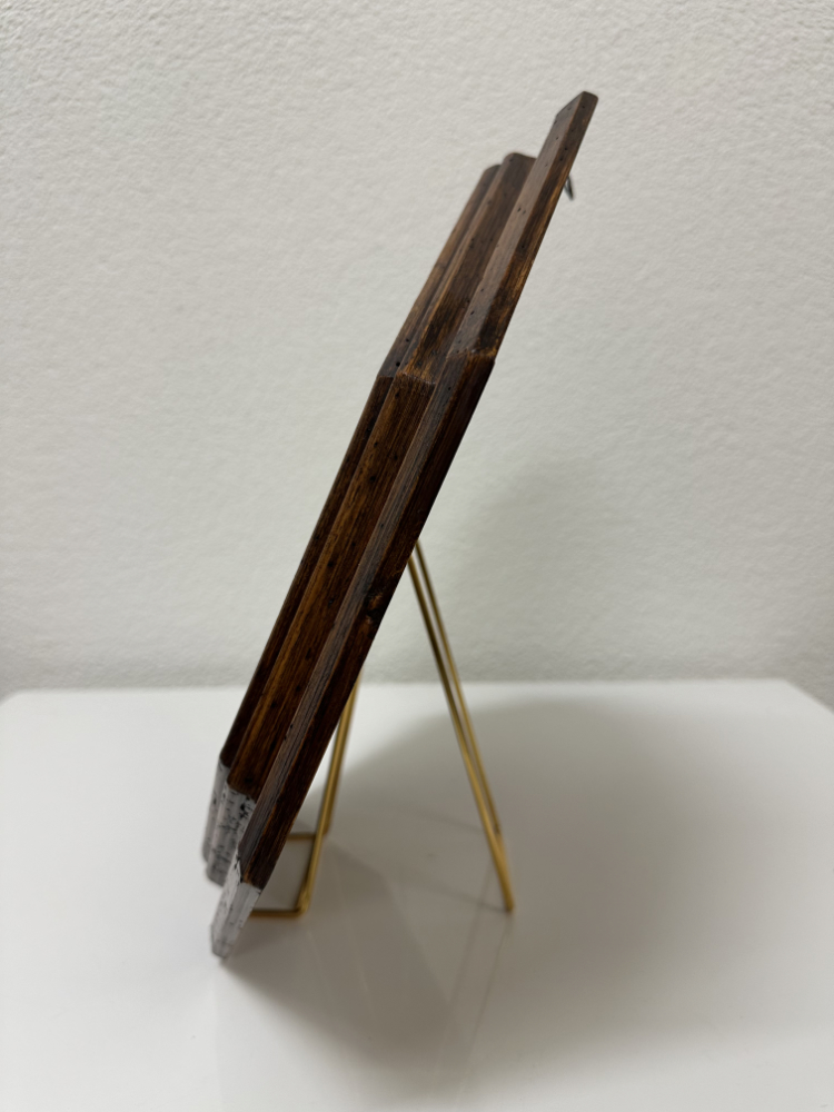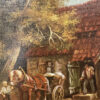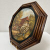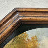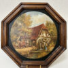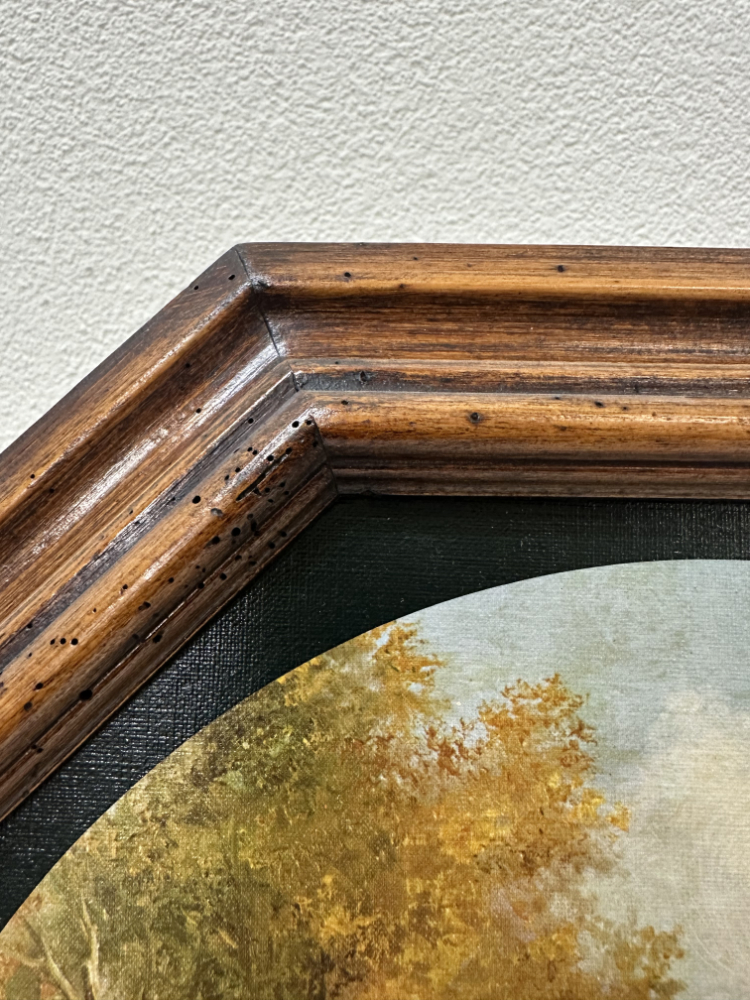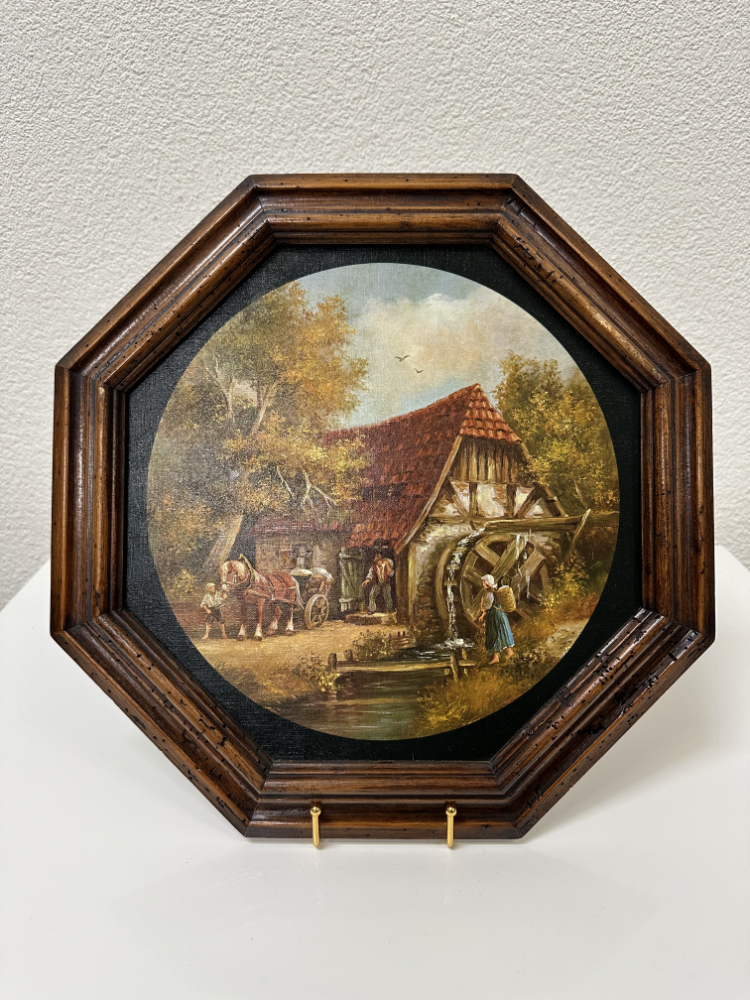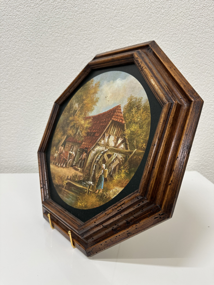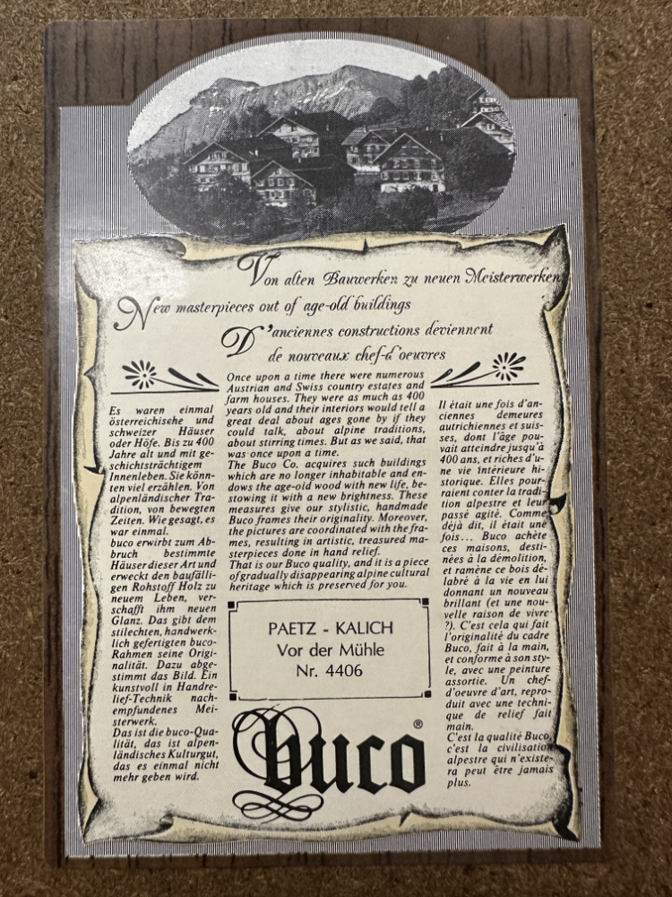 Das runde Bildfeld ist in einen markanten achteckigen Holzrahmen von Buco gefasst. Der dunkel gebeizte Rahmen mit sichtbarer Patina unterstreicht den nostalgischen Charakter und macht das Bild zu einem harmonischen Gesamtobjekt. Auf der Rückseite befindet sich das originale Buco-Etikett mit der Motivangabe Paetz-Kalich, Vor der Mühle, Nr. 4406, was die Zuordnung klar bestätigt.