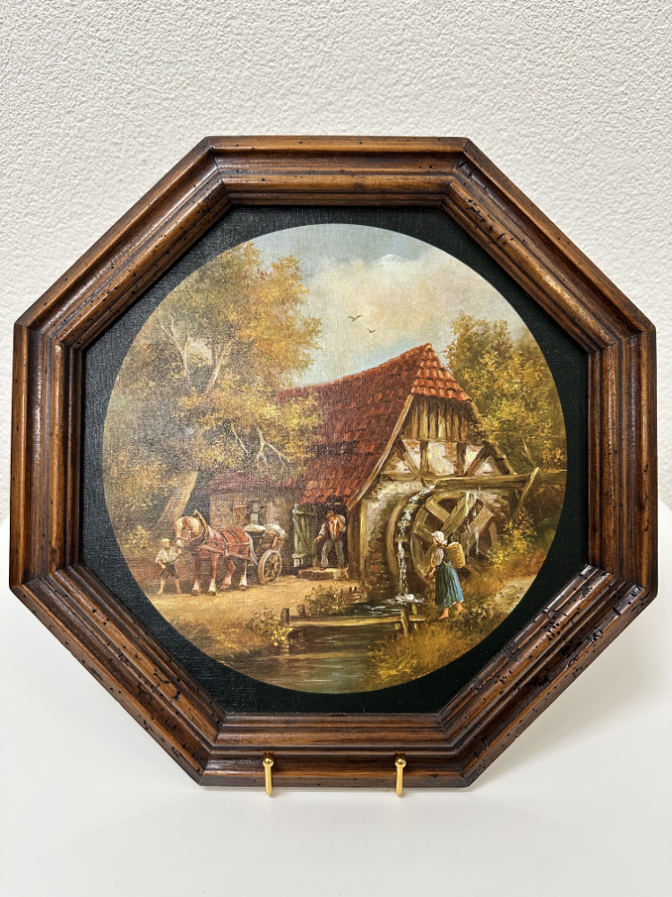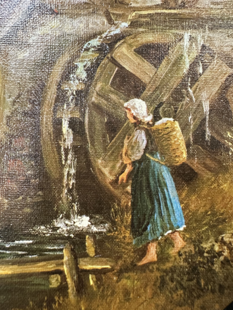 Ländliche Ruhe, handwerkliche Arbeit und eine stimmungsvolle Szenerie prägen dieses klassische Wandbild der Künstlerin Elizabeth Paetz-Kalich. Dargestellt ist eine historische Wassermühle mit Mühlrad, Pferdegespann und arbeitenden Figuren, eingebettet in eine herbstliche Landschaft. Die warme Farbpalette aus Braun-, Grün- und Ockertönen verleiht dem Motiv eine ruhige, zeitlose Ausstrahlung.