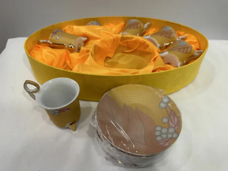 Vintage Geschirrrset 6 tazze caffe con piattino oro zechino befindet sich in einem guten bis sehr guten Zustand. Dieses Kuchenset Geschirr kommt in einer wunderschönen gelben Verpackung daher, was noch frisch eingepackt ist. Im Set befinden sich sechs Tassen und die dazugehörigen Telleruntersätze. Es eignet sich super als ein Kaffesett. Es ist für den selbst gebrauch gedacht, wie auch als Geschenkidee.