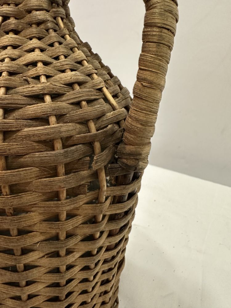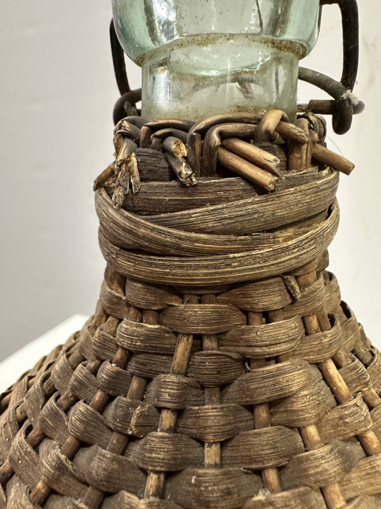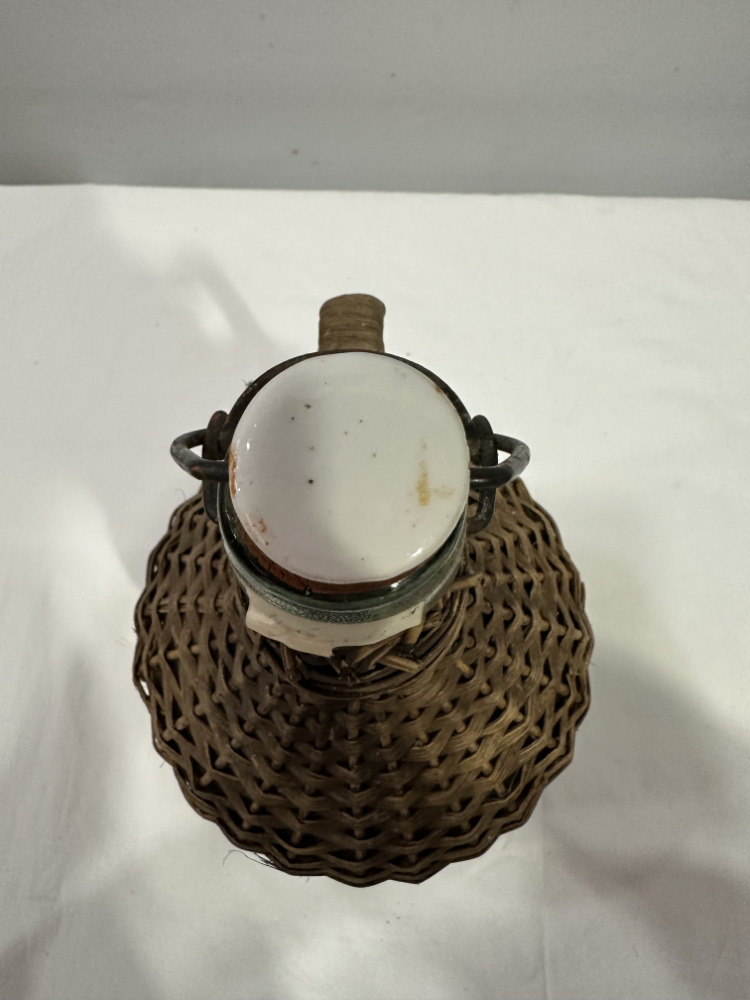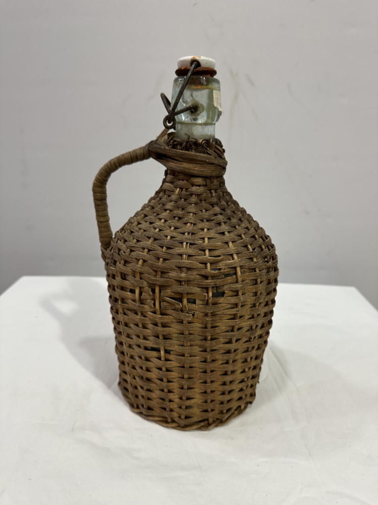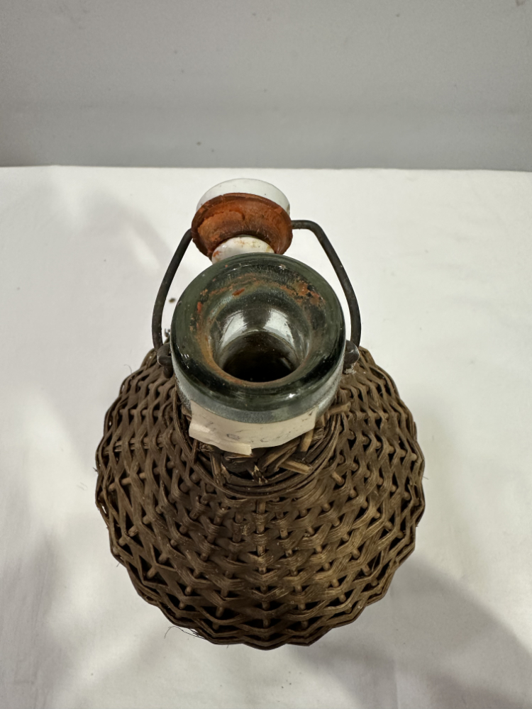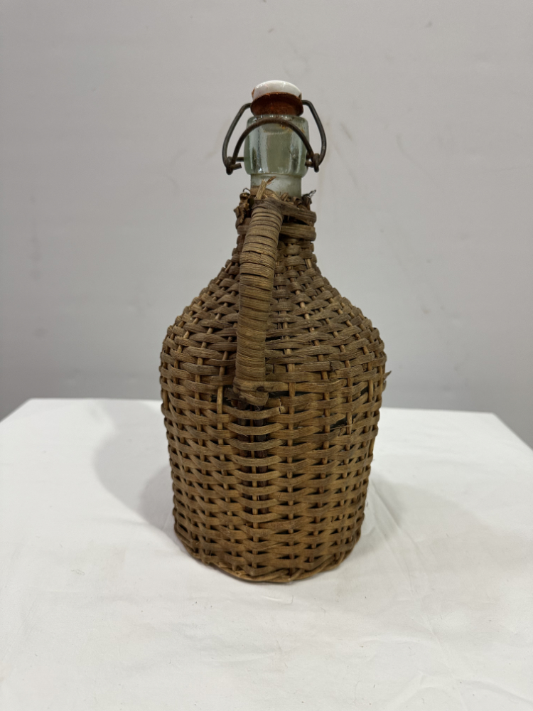 Diese charmante Glasflasche mit originalem Bügelverschluss stammt aus den 1950er Jahren und ist in ein dicht geflochtenes Korbgeflecht eingebettet. Die hellgrüne Glasfärbung und der handgearbeitete Henkel aus Wickelweide verleihen ihr den typischen Charakter ländlicher Vorratsgefässe jener Zeit. Der Keramikverschluss mit Drahtbügel ist original erhalten und zeigt eine wunderbar authentische Alterung.