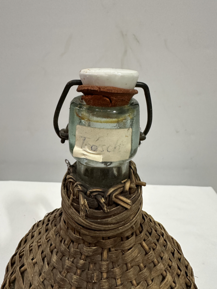 Auf dem Flaschenhals klebt noch ein handbeschriftetes Etikett mit der Aufschrift „Träsch“, was auf eine frühere Nutzung im häuslichen oder landwirtschaftlichen Umfeld hinweist. Solche Flaschen wurden häufig für hausgemachten Most, Likör oder Essig verwendet und sind heute begehrte Dekorobjekte mit rustikalem Flair.
