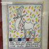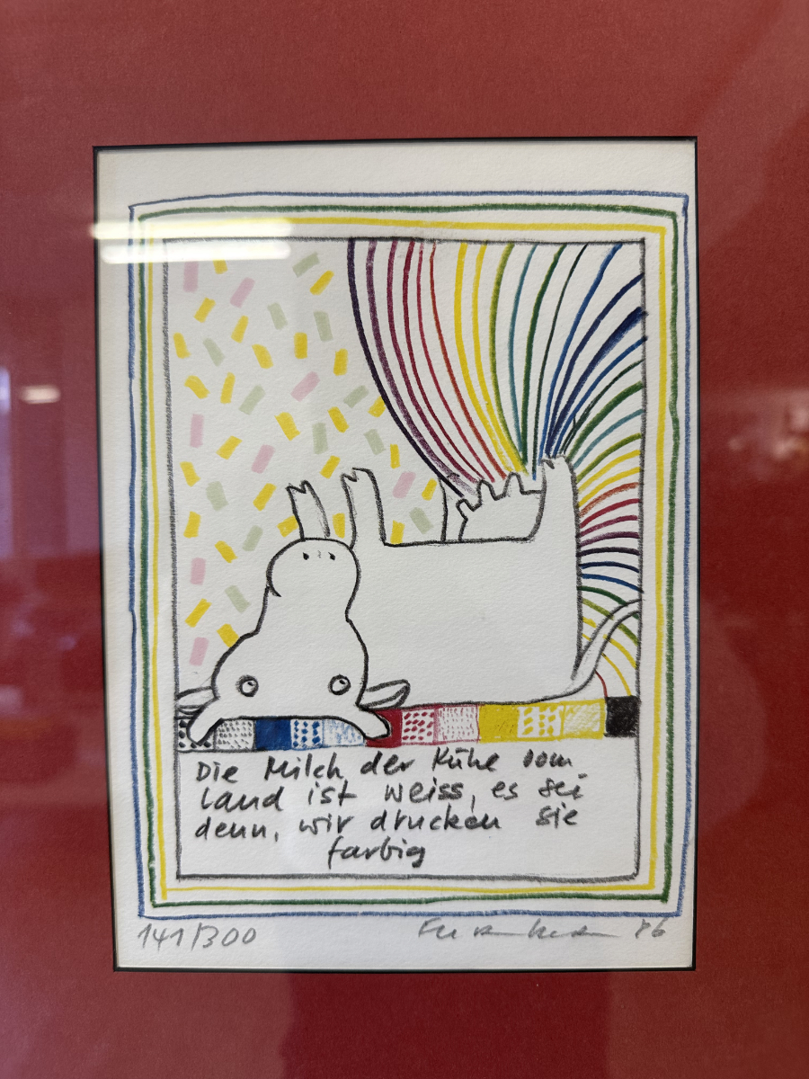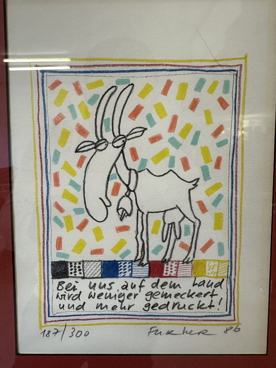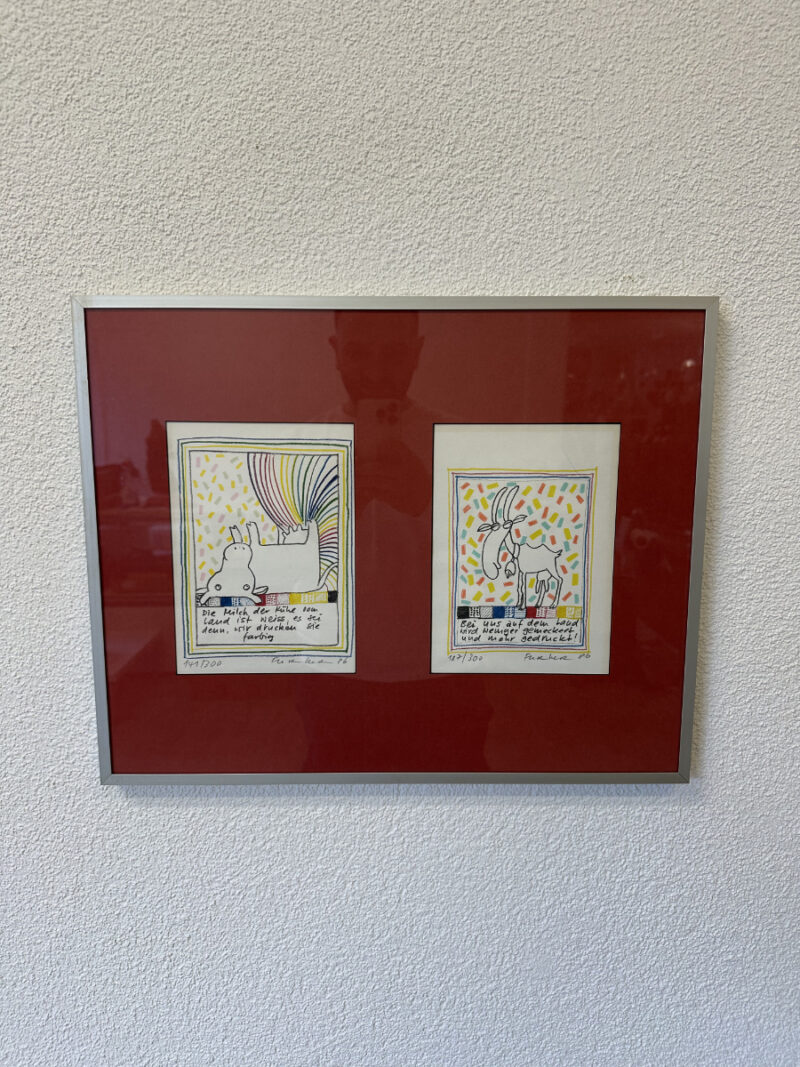 Zwei kleine, herrlich schräge Grafiken von Furrer, beide signiert, datiert 86 und nummeriert (141/300 und 187/300). Kuh und Ziege treffen auf bunte Farbflächen und handschriftliche Sprüche mit trockenem Humor. Zusammen im roten Passepartout wirkt das Set wie ein kleiner Blickfang, der sofort ein Grinsen auslöst, egal ob im Wohnzimmer, Atelier oder Büro.