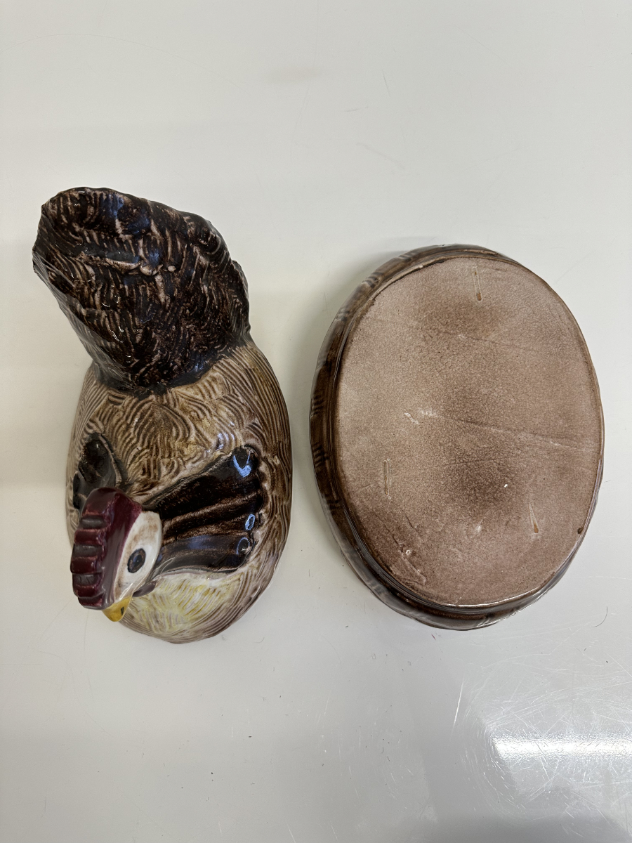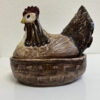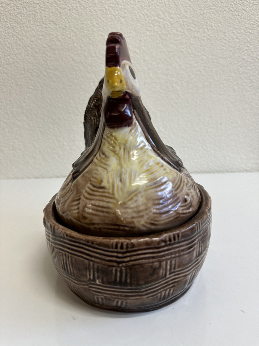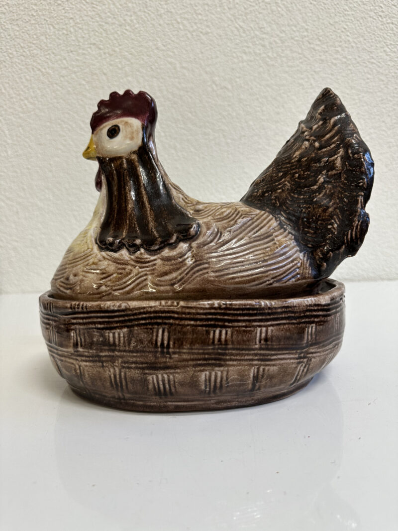 Grosszügige Keramikdose aus der Mitte des 20. Jahrhunderts mit klassischer Hennenform. Der abnehmbare Deckel ist als sitzende Henne modelliert, das Unterteil erinnert an ein Nest und ist innen glasiert. Die warmen Braun- und Beigetöne, die strukturierte Glasur sowie die sichtbaren Gebrauchsspuren am Boden unterstreichen den authentischen Vintage-Charakter. Ein Stück, das Funktion und Dekoration auf natürliche Weise verbindet.