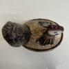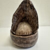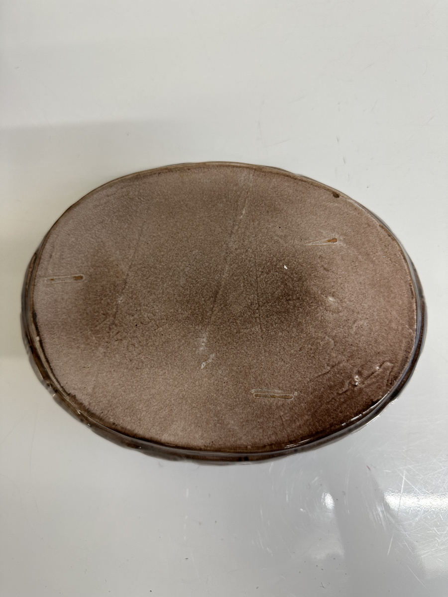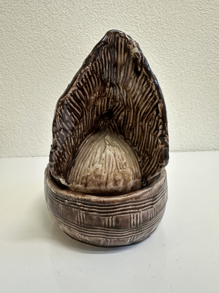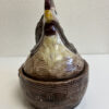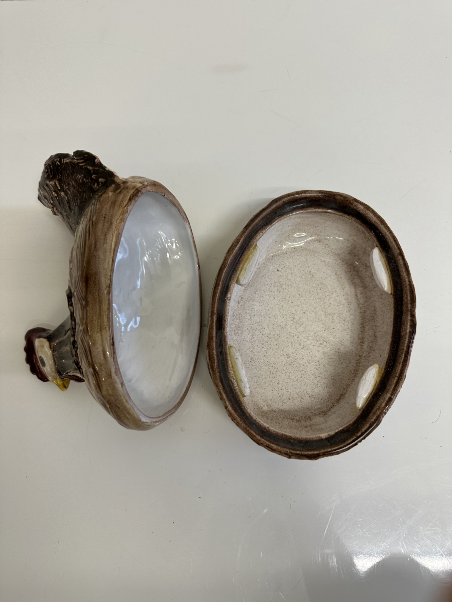Grosszügige Keramikdose aus der Mitte des 20. Jahrhunderts mit klassischer Hennenform. Der abnehmbare Deckel ist als sitzende Henne modelliert, das Unterteil erinnert an ein Nest und ist innen glasiert. Die warmen Braun- und Beigetöne, die strukturierte Glasur sowie die sichtbaren Gebrauchsspuren am Boden unterstreichen den authentischen Vintage-Charakter. Ein Stück, das Funktion und Dekoration auf natürliche Weise verbindet.